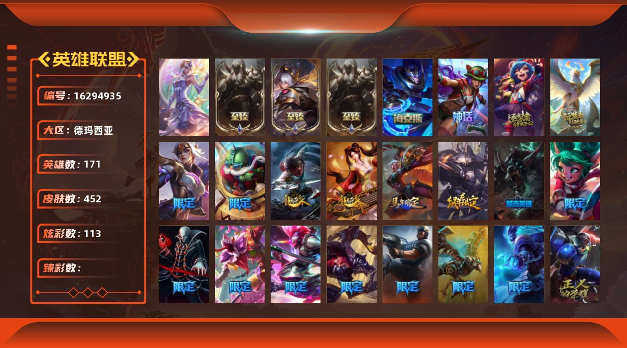 [16294935]1终极 7神话 50限定 36传说 125史诗 452皮肤 113炫彩 171英雄 可二次 可修改实名 【至臻】至臻 腥红之月 亚托克斯2022至臻 腥红之月 亚托克斯至臻 源计划:正义 艾瑞莉娅 【海克斯】海克斯 嘉文四世 【限定】斩星魔剑 易 【情人节限定】觅心猎手 薇恩觅心猫猫 悠米甜心宝贝 安妮 【赛季限定皮】胜利女神-菲奥娜胜利之运 崔斯特胜利剑圣 易胜利女神 娑娜胜利巨口 克格莫胜利之王 泰达米尔胜利呛神 格雷福斯胜利女神 奥莉安娜胜利之剑 亚托克斯胜利呛神 卢锡安 【冠军限定系列】s1fnc 迦娜s2 暗杀星 努努s3 skt t1 婕拉s4 ssw 锤石s4 ssw 炼金 【冰雪节限定】阿木木:“主人不要我了”冰雪节 辛吉德胡桃夹子 萨科平安夜女神 娑娜魄罗骑士 瑟庄妮圣诞精灵 崔丝塔娜圣诞狂欢 努努和威朗普圣诞玩偶 波比圣诞驯鹿 克格莫喜庆之树 茂凯幸福女神 乐芙兰 【泳池派对】泳池派对 辛德拉 【万圣节限定】魅惑女巫 莫甘娜魅惑女巫 奈德丽南瓜头 费德提克 【年限】银龙裁决 泰隆古琴余韵 娑娜替父从军 花木兰王国机神白虎 贾克斯 【周年】3周年 厄运小姐10周年 安妮10周年 凤凰 【其他限定/神话皮】外星装甲 库奇十五周年纪念 希维尔防暴天使 凯尔暗影 沃里克波比的巧克力工坊电玩战魂 赫卡里姆都铎王朝 图奇防暴士兵 格雷福斯钢铁之翼 艾尼维亚冠军典狱长 锤石惊悚派对 费德提克诺斯费拉图 弗拉基米尔