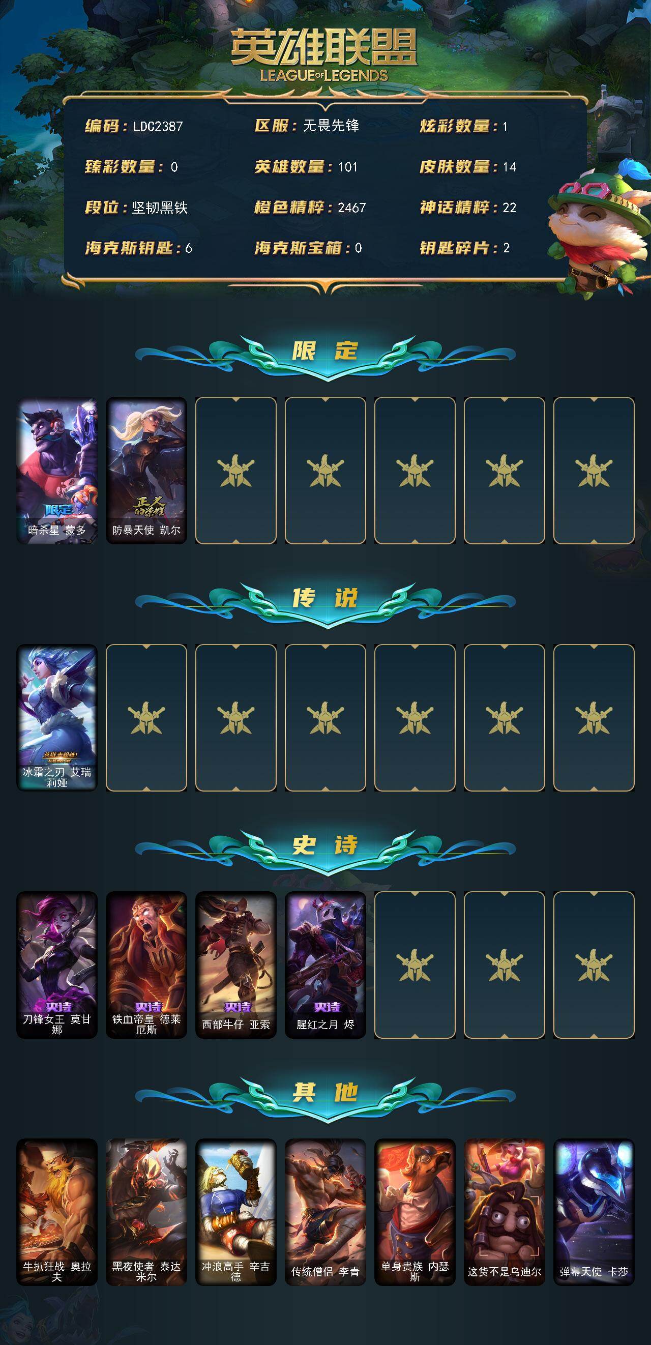 【ldc2387】101英雄/14皮肤/2限定/1炫彩/1传说/4史诗/未定级/暗杀星蒙多/防暴天使凯尔/冰霜之刃艾瑞莉娅/刀锋女王莫甘娜/铁血帝皇德莱厄斯/西部牛仔亚索/腥红之月烬/牛扒狂战奥拉夫/黑夜使者泰达米尔/冲浪高手辛吉德/传统僧侣李青/单身贵族内瑟斯/这货不是乌迪尔/弹幕天使卡莎