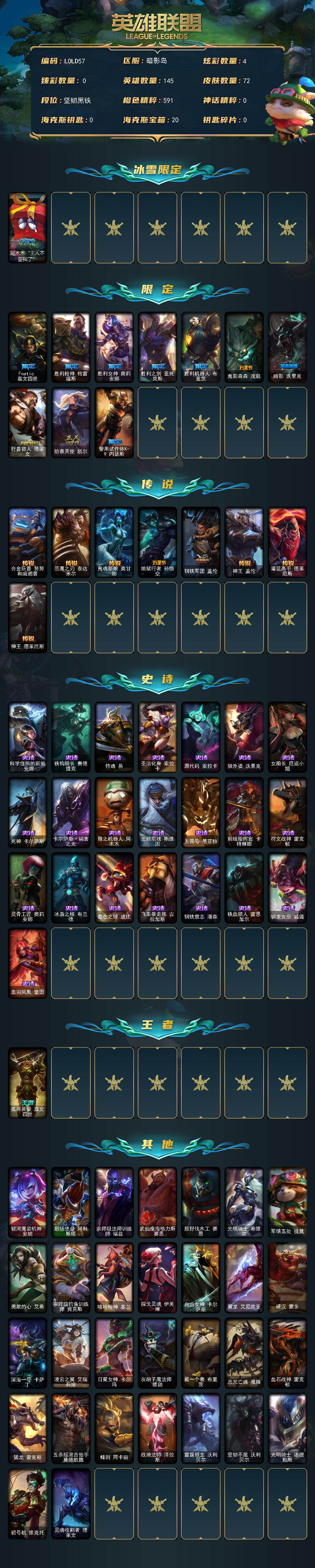 【lold57】145英雄/72皮肤/11限定/4炫彩/8传说/22史诗/未定级账号等级:279/阿木木“主人不要我了”/fnatic嘉文四世/胜利呛神格雷福斯/胜利女神奥莉安娜/胜利之剑亚托克斯/胜利机器人布里茨/鬼影森森茂凯/暗影沃里克/野兽猎人德莱文/防暴天使凯尔/警用试作体k9内瑟斯/合金巨兽努努和威朗普/恶魔之刃泰达米尔/鬼魂新娘莫甘娜/地狱行者孙悟空/钢铁军团盖伦/神王盖伦/灌篮高手德莱厄斯/神王德莱厄斯/科学怪熊的新娘安妮/铁钩船长费德提克/侍魂易/圣洁化身索拉卡/源代码索拉卡/狼外婆沃里克/女船长厄运小姐/死神卡尔萨斯/卡尔萨斯祸害之光/殇之机器人阿木木/北领前线斯维因/无畏号墨菲特/前线指挥官卡特琳娜/符文战神雷克顿/灵骨工匠奥莉安娜/冰晶之核布兰德/血色之锤波比/飞车暴走族古拉加斯/钢铁意志潘森/铁血猎人雷恩加尔/驯龙女巫璐璐/血羽凤凰奎因/孤胆英豪嘉文四世/银河魔装机神安妮/后场堡垒阿利斯塔/宗师级法师训练师瑞兹/武仙座海格力斯赛恩/原野伐木工赛恩/光明骑士希维尔/军情五处提莫/勇敢的心艾希/宗师级钓鱼训练师贾克斯/嘻哈精神基兰/探戈灵魂伊芙琳/自由女神卡尔萨斯/翼龙艾尼维亚/硬汉蒙多/深海一号卡萨丁/凌云之翼艾瑞莉娅/日冕女神卡尔玛/灰胡子魔法师维迦/戴一个表布里茨/恶咒亡魂魔腾/血石战神雷克顿/猛龙雷克顿/五杀摇滚吉他手莫德凯撒/蜂刺阿卡丽/战地法师泽拉斯/雷霆领主沃利贝尔/坚韧不屈沃利贝尔/光明骑士诺提勒斯/初号机维克托/灵魂收割者德莱文