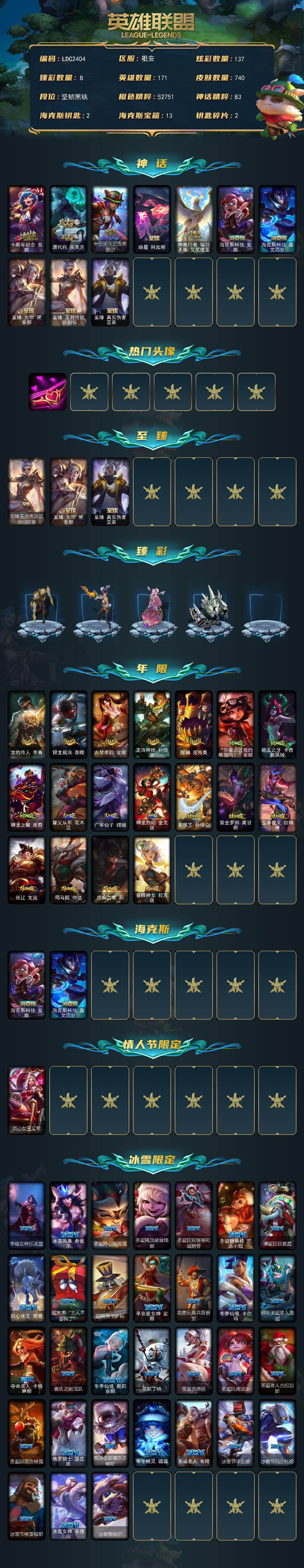 【ldc2404】171英雄/740皮肤/4终极/10神话/143限定/8臻彩/137炫彩/63传说/200史诗/未定级账号等级:338/十周年纪念安妮/源代码乐芙兰/十五周年纪念希维尔/暗星科加斯/神凰行者瑞羽圣凰艾尼维亚/海克斯科技安妮/海克斯科技嘉文四世/至臻真实伤害亚索/至臻女帝黛安娜/至臻玉剑传说武剑仙/爱情之歌头像/至臻玉剑传说武剑仙锐雯/冠军之刃锐雯2016凯旋圣装/冠军之隐劫凯旋圣装/雾雨之刃锐雯/星之守护者萨勒芬妮未来之光/霸天巨兽雪崩墨菲特/灵魂莲华亚索霜见之时/红莲之刃锐雯/龙的传人李青/银龙裁决泰隆/古琴余韵娑娜/定海神珍孙悟空/醒狮克格莫/你看见过我的熊猫吗安妮/碧玉之牙卡西奥佩娅/神龙之翼库奇/替父从军花木兰/广寒仙子嫦娥/神龙烈焰金克丝/美猴王孙悟空/紫金罗刹莫甘娜/玉净夜叉凯特琳/张辽文远/司马懿仲达/虎痴之拳蔚/春晖神女拉克丝/觅心女王艾希/幸福女神乐芙兰/冰雪风暴希维尔/圣诞开心鬼提莫/圣诞精灵崔丝塔娜/圣诞狂欢努努和威朗普/圣诞糖果棒厄运小姐/圣诞狂欢基兰/狂心冰王图奇/阿木木“主人不要我了”/胡桃夹子萨科/平安夜女神娑娜/英勇玩具兵普朗克/冬季仙境卡尔玛/邪恶圣诞老人维迦/夺命美人卡特琳娜/喜庆之树茂凯/冬季仙境奥莉安娜/雪默丁格/雪装奈德丽/圣诞玩偶波比/圣诞老人古拉加斯/圣诞驯鹿克格莫/魄罗骑士瑟庄妮/雪球也能爆炸吉格斯/寒冬精灵璐璐/圣诞老人布隆/冰雪节辛吉德/冰雪节玛尔扎哈/冰雪节格雷福斯/冰雪女神辛德拉/冰雪兽纳尔/大元素使拉克丝/dj娑娜/灵魂守卫乌迪尔/未来战士伊泽瑞尔/哥特萝莉安妮/钢铁军团拉克丝/奥斯曼大帝泰达米尔/庆典女皇艾尼维亚/卧虎藏龙贾克斯/舞会公主安妮/地底世界崔斯特/冠军之刃锐雯/冠军典狱长锤石/冠军之血希瓦娜/冠军之矛卡莉丝塔/冠军之刃锐雯2016/冠军之隐劫/fnatic古拉加斯/fnatic迦娜/fnatic嘉文四世/fnatic卡尔萨斯/fnatic库奇/暗杀星奥莉安娜/暗杀星蒙多/暗杀星努努和威朗普/暗杀星慎/暗杀星伊泽瑞尔/sktt1贾克斯/sktt1劫/sktt1婕拉/sktt1李青/sktt1薇恩/ssw辛吉德/ssw图奇/ssw泰隆/ssw雷恩加尔/ssw锤石/sktt1阿利斯塔/sktt1阿兹尔/sktt1卡莉丝塔/sktt1瑞兹/sktt1伊莉丝/sktt1奥拉夫/安妮梦游仙境/勇敢的心德莱厄斯/电玩女神厄运小姐/电玩勇者锐雯/电玩女神阿狸/胜利之树茂凯/胜利呛神格雷福斯/胜利女神奥莉安娜/胜利之剑亚托克斯/胜利之运崔斯特/海贼瑞兹/南瓜头费德提克/灵魂收割者索拉卡/鬼影重重魔腾/鬼影森森茂凯/无头骑士赫卡里姆/不给糖就捣蛋艾克/魅惑女巫崔丝塔娜/魅惑女巫莫甘娜/魅惑女巫奈德丽/糖果使徒费德提克/泳池派对奥莉安娜/泳池派对厄运小姐/泳池派对菲奥娜/泳池派对格雷福斯/泳池派对雷克顿/泳池派对蕾欧娜/泳池派对李青/泳池派对塔里克/机械迷城加里奥/蓝色忧郁崔斯特/蒙多蒙多/密林猎手提莫/女猎手希维尔/外星装甲库奇/暗影沃里克/野兽猎人德莱文/野兽猎人瑟庄妮/野兽猎人泰达米尔/波比的巧克力工坊/永恒之森乐芙兰/勇者阿狸/勇者奈德丽/电玩战魂赫卡里姆/都铎王朝图奇/钢铁之翼艾尼维亚/征服者卡尔玛/制胜金靴李青/防暴士兵格雷福斯/防暴士兵辛吉德/防暴天使凯尔/惊悚派对阿木木/警用试作体k9内瑟斯/克格汪/铁哥们儿奥拉夫/地狱之门卫士加里奥/魔幻卡牌崔斯特/战地机甲厄加特/邪鸦魅影乐芙兰/血石领主弗拉基米尔/大天使长米迦勒凯尔/战场女武神凯尔/钢铁之翼凯尔/源计划林易/霸天零式赛恩/约德尔国队长提莫/欧米伽小队幽灵特工/烈焰雄心崔丝塔娜/驯龙炮手崔丝塔娜/合金巨兽努努和威朗普/女皇艾希/源计划联合艾希/恶魔之刃泰达米尔/鬼魂新娘莫甘娜/绅士科加斯/战地巨兽科加斯/双重冰晶艾尼维亚/黯晶凤凰艾尼维亚/律政大亨蒙多/电玩女神娑娜/冰霜之刃艾瑞莉娅/女主播迦娜/红色男爵库奇/最终boss维迦/女警狙击凯特琳/陆地王者4wd布里茨/苹果机器人布里茨/冰川巨兽墨菲特/上古战魂魔腾/地狱行者孙悟空/丧尸布兰德/神龙尊者圣龙李青/银河魔装机神兰博/第三类接触黑默丁格/炼狱魔犬内瑟斯/屠龙勇士潘森/腥红之月鬼武姬阿卡丽/死亡骑士盖伦/钢铁军团盖伦/黎明使者锐雯/星之守护者拉克丝/枯萎之壤泽拉斯/黯黑魔龙希瓦娜/冰霜亚龙希瓦娜/焰尾妖狐阿狸/偶像歌手阿狸/符文战熊沃利贝尔/苍穹之光韦鲁斯/宇航员诺提勒斯/女校长菲奥娜/泳池派对吉格斯/金牌主播德莱文/霸天异形卡兹克/灌篮高手德莱厄斯/神王德莱厄斯/星之守护者金克丝/暗星锤石/冰霜烈焰安妮/安伯斯与提妮/科学怪熊的新娘安妮/皇家火呛手崔斯特/腥红之月崔斯特/特战先锋赵信/绞肉机角斗士赵信/翼骑统领赵信/屠龙勇士赵信/摄魂男爵弗拉基米尔/铁钩船长费德提克/重生之沙费德提克/圣光审判凯尔/天人合一易/侍魂易/铁血剑豪易/地狱火阿利斯塔/战争机器赛恩/战场公主希维尔/钢铁之心希维尔/月光女神阿忒弥斯索拉卡/圣洁化身索拉卡/源代码索拉卡/兔宝宝提莫/熊猫提莫/火箭达人崔丝塔娜/狼外婆沃里克/荒野豺狼沃里克/黑帮狂花厄运小姐/女船长厄运小姐/国王泰达米尔/百夫长贾克斯/少林武僧贾克斯/刀锋女王莫甘娜/黑色荆棘莫甘娜/炼金狂士辛吉德/死神卡尔萨斯/卡尔萨斯祸害之光/侏罗纪化石科加斯/小小骑士阿木木/殇之机器人阿木木/熔火之心拉莫斯/全金属狂潮拉莫斯/贵族血统萨科/飞越疯人院萨科/武动巅峰萨科/战争血统