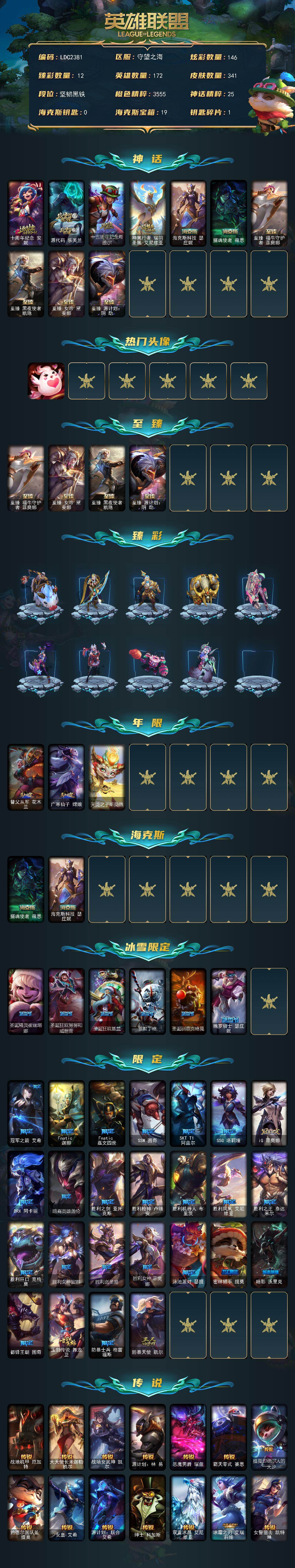 【ldc2381】172英雄/341皮肤/10神话/35限定/12臻彩/146炫彩/38传说/69史诗/未定级账号等级:862/十周年纪念安妮/源代码乐芙兰/十五周年纪念希维尔/神凰行者瑞羽圣凰艾尼维亚/海克斯科技瑟庄妮/摄魂使者薇恩/至臻福牛守护者菲奥娜/至臻黑夜使者凯隐/至臻女帝黛安娜/至臻源计划阴劫/爱情鸽头像/天龙之子卡莎飞龙乘云/无畏骑士瑟庄妮赤子初心/冠军之箭艾希凯旋圣装/冠军之志瑞兹凯旋圣装/征服者阿利斯塔炫金/幻灵战斗猫金克丝梦幻强袭/星之守护者金克丝黑洞/星之守护者卡莎热情之光/可爱可爱粉红红布里茨/魔女阿卡丽虚荣/净雪之月莫甘娜冬虹/水晶玫瑰斯维因纯洁花蕾/替父从军花木兰/广寒仙子嫦娥/天龙之子斯莫德/圣诞精灵崔丝塔娜/圣诞狂欢努努和威朗普/圣诞狂欢基兰/雪默丁格/圣诞驯鹿克格莫/魄罗骑士瑟庄妮/冠军之箭艾希/fnatic迦娜/fnatic嘉文四世/ssw图奇/sktt1阿兹尔/ssg塔莉垭/ig菲奥娜/drx阿卡丽/暗裔英雄盖伦/胜利之剑亚托克斯/胜利呛神卢锡安/胜利机器人布里茨/胜利凤凰艾尼维亚/胜利之王泰达米尔/胜利巨口克格莫/胜利女神娑娜/胜利剑圣易/胜利女神菲奥娜/泳池派对瑟提/密林猎手提莫/暗影沃里克/都铎王朝图奇/玉剑传说舞龙卫/防暴士兵格雷福斯/防暴天使凯尔/战地机甲厄加特/大天使长米迦勒凯尔/战场女武神凯尔/源计划林易/恶魔男爵瑞兹/霸天零式赛恩/提莫约德尔人的一大步/约德尔国队长提莫/女皇艾希/源计划联合艾希/绅士科加斯/双重冰晶艾尼维亚/冰霜之刃艾瑞莉娅/女警狙击凯特琳/苹果机器人布里茨/地狱行者孙悟空/丧尸布兰德/神龙尊者圣龙李青/驯龙学者黑默丁格/炼狱魔犬内瑟斯/腥红之月鬼武姬阿卡丽/钢铁军团盖伦/黎明使者锐雯/枯萎之壤泽拉斯/黯黑魔龙希瓦娜/冰霜亚龙希瓦娜/焰尾妖狐阿狸/苍穹之光韦鲁斯/宇航员诺提勒斯/女校长菲奥娜/霸天异形卡兹克/灌篮高手德莱厄斯/青花瓷奥瑞利安索尔/奥德赛凯隐/星之守护者卡莎/神龙尊者昼日真龙亚索/暗星尊烬/星之守护者金克丝/安伯斯与提妮/摄魂男爵弗拉基米尔/圣光审判凯尔/天人合一易/战场公主希维尔/钢铁之心希维尔/兔宝宝提莫/狼外婆沃里克/国王泰达米尔/少林武僧贾克斯/刀锋女王莫甘娜/炼金狂士辛吉德/卡尔萨斯祸害之光/小小骑士阿木木/殇之机器人阿木木/武动巅峰萨科/战争血统蒙多/五杀摇滚键盘手娑娜/掠星魔刃卡萨丁/夜行义贼艾瑞莉娅/穿着正装的恶魔维迦/抵抗军天使凯特琳/海贼魅影卡特琳娜/暗夜猫女卡特琳娜/前线指挥官卡特琳娜/蓝焰梦魔魔腾/符文战神雷克顿/暗星奥莉安娜/v字仇杀者布兰德/屠龙勇士薇恩/法老王朝内瑟斯/四神之力乌迪尔/血色之锤波比/飞车暴走族古拉加斯/钢铁意志潘森/死亡领主莫德凯撒/银色之牙阿卡丽/至高君王玛尔扎哈/刺客信条锐雯/帝王斑蝶克格莫/星际迷航拉克丝/虚空海灵菲兹/银河魔装机神菲兹/铁血猎人雷恩加尔/暗黑武士雷恩加尔/夜鸦菲奥娜/奥术大师吉格斯/驯龙女巫璐璐/永恒之森赫卡里姆/沙之守护卡兹克/生化骑士德莱厄斯/暗黑女武神黛安娜/无限烈焰黛安娜/勇敢的心奎因/萌侦探喵尔摩斯/邪恶魔人扎克/西部牛仔亚索/源计划风亚索/苍穹之光维克兹/弗雷尔卓德塔莉垭/西部牛仔烬/黑帮狂花金克丝/源计划阴劫/爵士克烈/时之砂艾克/锦鲤娜美/虚空使者俄洛伊/上古战魂雷克塞/冰雪游神巴德/西部牛仔崔斯特/战地之王加里奥/创意工坊黑默丁格/银河魔装机神安妮/黑暗骑士奥拉夫/幽蓝梦魇加里奥/风执事加里奥/皇家守卫赵信/潮流女王乐芙兰/弗拉基米尔伯爵/弗拉基米尔侯爵/学生会长弗拉基米尔/波江星神弗拉基米尔/幽魂费德提克/末世天使凯尔/暗影易/星战易/灵魂莲华易/金牛座阿利斯塔/斗牛士阿利斯塔/荒野镖客阿利斯塔/宗师级法师训练师瑞兹/瑞兹白须/武仙座海格力斯赛恩/星之守护者索拉卡/欧米伽小队魔鬼伞兵/披着海牛的狼沃里克/海牛狼人沃里克/荒野巨兽努努和威朗普/西部牛仔厄运小姐/极地女神艾希/魔女艾希/梦魇泰达米尔/宗师级钓鱼训练师贾克斯/源计划孤狼贾克斯/地狱厨房莫甘娜/玉剑传说苍鸾/时间机器基兰/腥红之月基兰/机械污染辛吉德/冲浪高手辛吉德/科学狂人辛吉德/黑暗女王伊芙琳/假面女皇伊芙琳/探戈灵魂伊芙琳/惊天魔盗伊芙琳/kdaallout伊芙琳/屠龙勇士图奇/五杀摇滚主唱卡尔萨斯/梦魇科加斯/狂欢阿木木/情绪摇滚阿木木/王子不是我阿木木/地狱火阿木木/沙之守护拉莫斯/千纸凤凰艾尼维亚/万能小丑萨科/战栗之毒蒙多/健美教练蒙多/泳池派对蒙多/寒冰王座卡萨丁/深海一号卡萨丁/凌云之翼艾瑞莉娅/玉剑传说风仙子/老兵普朗克/大力水手普朗克/昔日霸主普朗克/电玩上校库奇/日冕女神卡尔玛/樱花乱舞卡尔玛/光明骑士卡尔玛/神龙尊者宁静之龙卡尔玛/绿水晶光辉塔里克/冰壶选手维迦/宇航员维迦/里尔击球手特朗德尔/垃圾场特朗德尔/荒野治安官凯特琳/双城之战凯特琳/铁锈斑斑布里茨/暮色呛骑布里茨/珊瑚礁墨菲特/红牌退场卡特琳娜/战斗学院卡特琳娜/幻影梦魔魔腾/图腾古树茂凯/荒野之咬雷克顿/猛龙雷克顿/屠龙勇士嘉文四世/银河魔装机神伊莉丝/传统僧侣李青/热带丛林兰博/太空律动串烧大师兰博/沙暴巨蝎斯卡纳/单身贵族内瑟斯/枭姬孙尚香/黎明使者奈德丽/武力全开乌迪尔/龙神之力乌迪尔/乡村农夫古拉加斯/美酒节特使古拉加斯/狂热球迷古拉加斯/古拉加