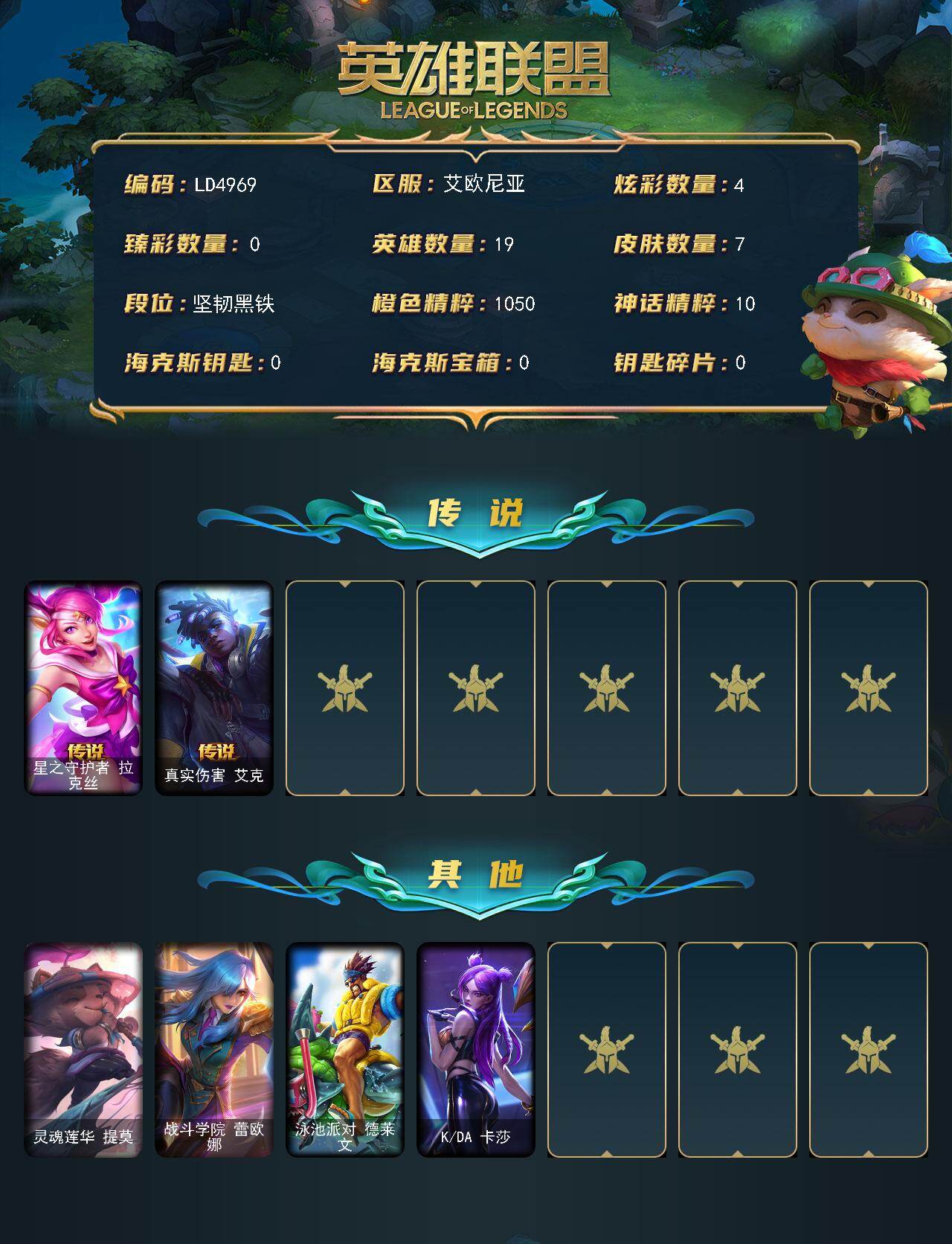 【ld4969】19英雄/7皮肤/1限定/4炫彩/2传说/未定级账号等级:232/星之守护者拉克丝/真实伤害艾克/灵魂莲华提莫/战斗学院蕾欧娜/泳池派对德莱文/kda卡莎