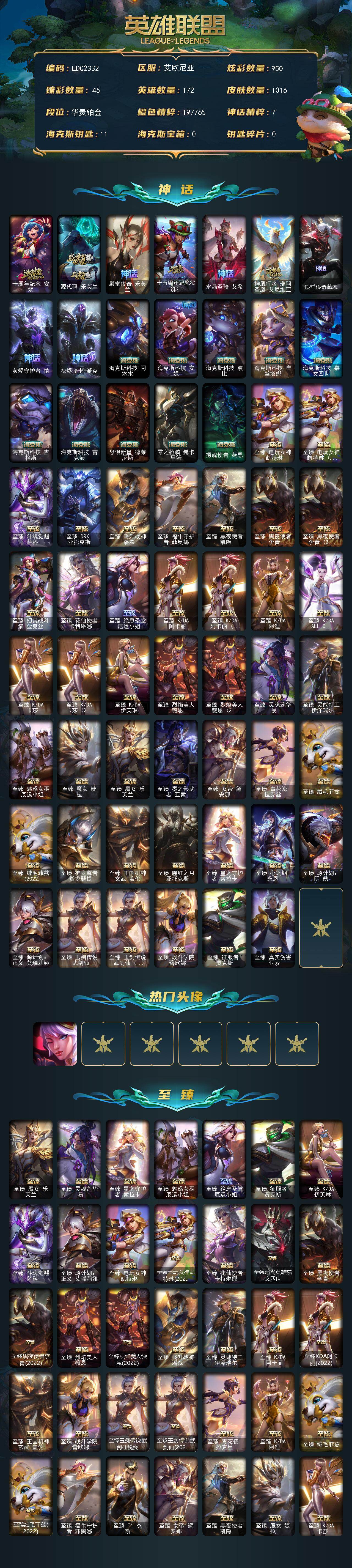 【ldc2332】172英雄/1016皮肤/3终极/65神话/144限定/45臻彩/950炫彩/92传说/207史诗/铂金/10周年安妮/源代码乐芙兰/殿堂传奇乐芙兰/十五周年纪念希维尔/水晶圣骑艾希/10周年神凰行者瑞羽圣凰艾尼维亚/殿堂传奇薇恩/灰烬守护者慎/灰烬骑士派克/海克斯阿木木/海克斯安妮/海克斯波比/海克斯科技崔丝塔娜/海克斯科技嘉文四世/海克斯科技吉格斯/海克斯雷克顿/海克斯恐