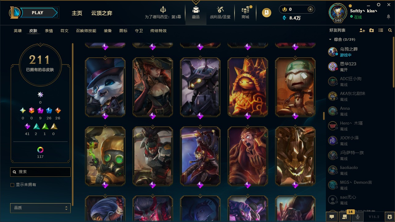 [16388743]9神话 26限定 26传说 41史诗 211皮肤 139炫彩 172英雄 可二次 可修改实名 【至臻】至臻 心之钢 永恩至臻 斗魂觉醒 萨科至臻 永恒星灵 佐伊至臻 k/da 卡莎至臻 神龙尊者均衡之龙 沃利贝尔至臻 北极星使者 沃里克 【限定】玉剑传说 翼剑仙 【赛季限定皮】胜利行刑官 德莱文胜利凤凰 艾尼维亚胜利女神-菲奥娜胜利之运 崔斯特胜利女神 娑娜胜利巨口 克格莫胜利呛神 卢锡安胜利机器人 布里茨胜利女神 瑟庄妮 【冰雪节限定】冰雪节 格雷福斯魄罗骑士 瑟庄妮圣诞开心鬼 提莫 【泳池派对】泳池派对 吉格斯 【万圣节限定】鬼影重重 魔腾南瓜头王子 阿木木无头骑士 赫卡里姆 【年限】点心宝贝 阿木木天龙之子 斯莫德王国机神苍狼 瑟提 【周年】10周年 安妮10周年 凤凰 【其他限定/神话皮】暗裔英雄 盖伦暗影 沃里克波比的巧克力工坊都铎王朝 图奇防暴士兵 辛吉德警用试作体k-9 内瑟斯征服者 韦鲁斯