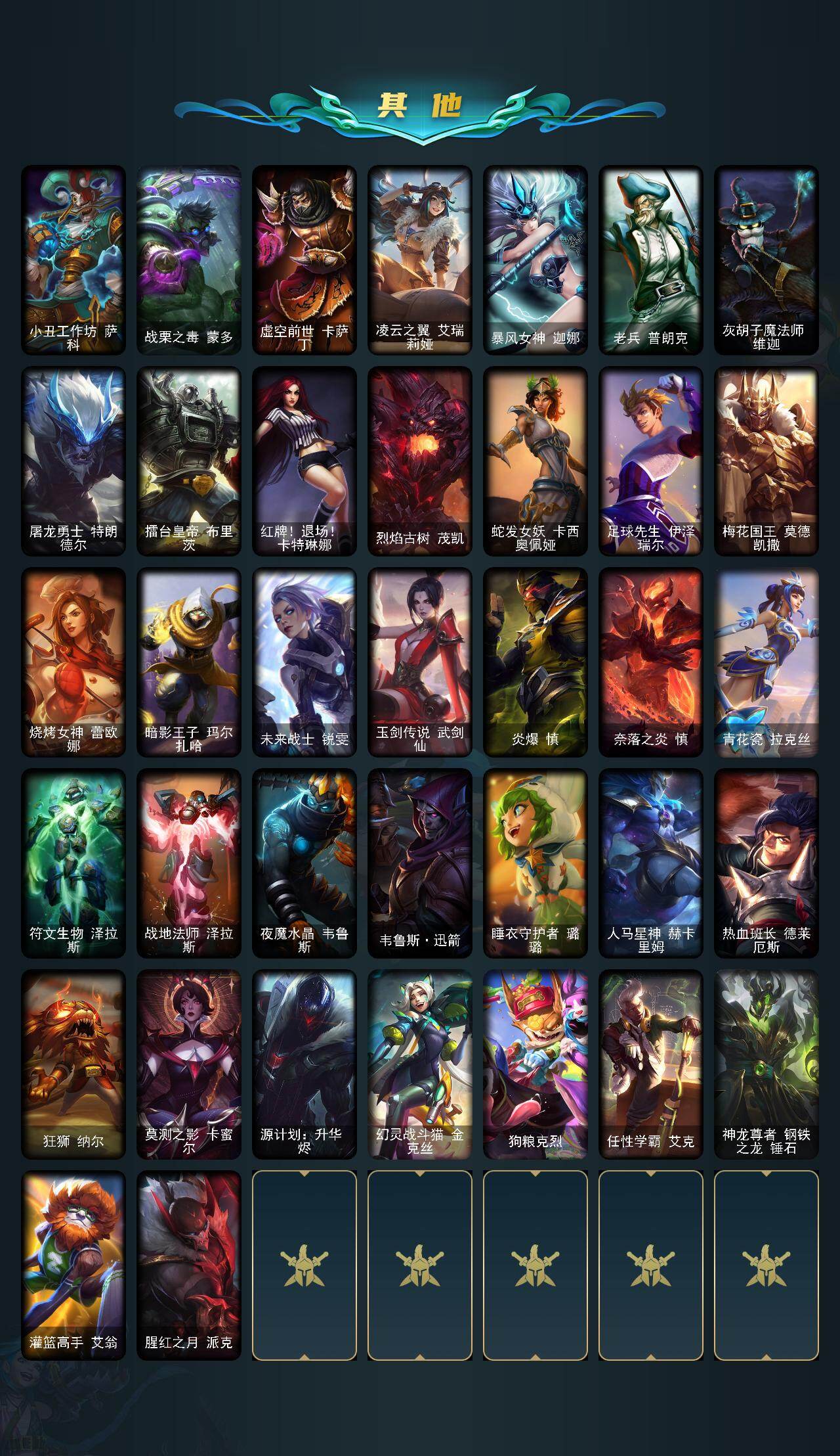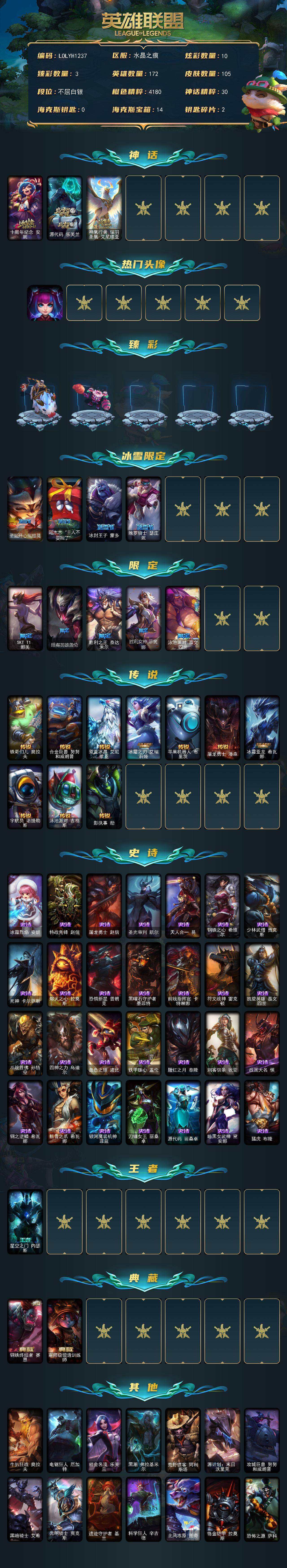 【lolyh1237】172英雄/105皮肤/3神话/10限定/3臻彩/10炫彩/10传说/28史诗/白银/十周年纪念安妮/源代码乐芙兰/神凰行者瑞羽圣凰艾尼维亚/银河魔装机神安妮头像/无畏骑士瑟庄妮赤子初心/战斗学院卡特琳娜盛典礼服/可爱可爱粉红红布里茨/圣诞开心鬼提莫/阿木木“主人不要我了”/冰封王子蒙多/魄罗骑士瑟庄妮/sktt1娜美/暗裔英雄盖伦/胜利之王泰达米尔/胜利女神菲奥娜/泳池派对嘉文四世/铁哥们儿奥拉夫/合金巨兽努努和威朗普/双重冰晶艾尼维亚/冰霜之刃艾瑞莉娅/苹果机器人布里茨/屠龙勇士潘森/冰霜亚龙希瓦娜/宇航员诺提勒斯/泳池派对吉格斯/影执事劫/冰霜烈焰安妮/特战先锋赵信/屠龙勇士赵信/圣光审判凯尔/天人合一易/钢铁之心希维尔/少林武僧贾克斯/死神卡尔萨斯/熔火之心拉莫斯/恐惧新星普朗克/黑曜石守护者墨菲特/前线指挥官卡特琳娜/符文战神雷克顿/凯旋英雄嘉文四世/斗战胜佛孙悟空/四神之力乌迪尔/血色之锤波比/铁甲雄心盖伦/腥红之月泰隆/刺客信条锐雯/战国大名慎/钢之逆鳞希瓦娜/骸骨之爪希瓦娜/银河魔装机神菲兹/刀锋女王丽桑卓/源代码丽桑卓/暗黑女武神黛安娜/猛虎布隆/星空之门内瑟斯/钢铁终结者赛恩/宗师级锻造训练师/牛扒狂战奥拉夫/电锯狂人厄加特/社会名流乐芙兰/黑潮弗拉基米尔/荒野镖客阿利斯塔/源计划末日沃里克/攻城巨兽努努和威朗普/黑暗骑士艾希/光明骑士贾克斯/遗迹守护者基兰/科学狂人辛吉德/北风冻原图奇/铬金铠甲拉莫斯/恐怖之源萨科/小丑工作坊萨科/战栗之毒蒙多/虚空前世卡萨丁/凌云之翼艾瑞莉娅/暴风女神迦娜/老兵普朗克/灰胡子魔法师维迦/屠龙勇士特朗德尔/擂台皇帝布里茨/红牌退场卡特琳娜/烈焰古树茂凯/蛇发女妖卡西奥佩娅/足球先生伊泽瑞尔/梅花国王莫德凯撒/烧烤女神蕾欧娜/暗影王子玛尔扎哈/未来战士锐雯/玉剑传说武剑仙/炎爆慎/奈落之炎慎/青花瓷拉克丝/符文生物泽拉斯/战地法师泽拉斯/夜魔水晶韦鲁斯/韦鲁斯迅箭/睡衣守护者璐璐/人马星神赫卡里姆/热血班长德莱厄斯/狂狮纳尔/莫测之影卡蜜尔/源计划升华烬/幻灵战斗猫金克丝/狗粮克烈/任性学霸艾克/神龙尊者钢铁之龙锤石/灌篮高手艾翁/腥红之月派克