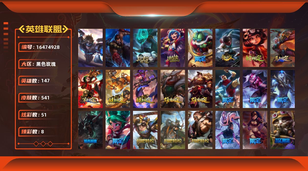 [16474928]【店主推荐捡漏号!可直接换绑】未定级段位-147英雄-541皮肤-51炫彩-2终极-3神话-90限定-43传说-154史诗 【热门头像】:爱意绵绵头像,爱情之歌头像,觅心游侠卢锡安头像 【臻彩皮肤】:天龙之子卡莎飞龙乘云,墨之影武者亚索金墨耀影,冠军之隐劫凯旋圣装,弹幕天使卡莎炽天使勇敢,弹幕天使卡莎炽天使公正,魔女阿卡丽虚荣,净雪之月莫甘娜冬虹,心之钢伊泽瑞尔天纵才华 【年限皮肤】:银龙裁决泰隆,你看见过我的熊猫吗安妮,碧玉之牙卡西奥佩娅,替父从军花木兰,神龙烈焰金克丝,美猴王孙悟空,玉净夜叉凯特琳,张辽文远,司马懿仲达 【情人节限定】:甜心宝贝安妮,甜心宝贝娑娜,觅心猎手薇恩 【冰雪限定】:幸福女神乐芙兰,圣诞开心鬼提莫,圣诞精灵崔丝塔娜,圣诞狂欢努努和威朗普,圣诞狂欢基兰,阿木木“主人不要我了”,胡桃夹子萨科,平安夜女神娑娜,冬季仙境卡尔玛,邪恶圣诞老人维迦,喜庆之树茂凯,冬季仙境奥莉安娜,雪默丁格,雪装奈德丽,圣诞玩偶波比,圣诞老人古拉加斯,圣诞驯鹿克格莫,魄罗骑士瑟庄妮,雪球也能爆炸吉格斯,寒冬精灵璐璐 【终极皮肤】:灵魂守卫乌迪尔,未来战士伊泽瑞尔 【神话皮肤】:十周年纪念安妮,源代码乐芙兰,神凰行者瑞羽圣凰艾尼维亚 【限定皮肤】:哥特萝莉安妮,战熊骑士瑟庄妮,奥斯曼大帝普朗克,巨角幻兽阿利斯塔,舞会公主安妮,创星之灵璐璐,穿星魔锋赵信,fnatic古拉加斯,fnatic迦娜,fnatic嘉文四世,fnatic库奇,暗杀星努努和威朗普,暗杀星伊泽瑞尔,sktt1婕拉,ssw辛吉德,ssw图奇,sktt1阿利斯塔,sktt1瑞兹,sktt1伊莉丝,sktt1艾克,ssg嘉文四世,电玩女神厄运小姐,电玩勇者锐雯,电玩女神阿狸,星之守护者伊泽瑞尔,胜利女神奥莉安娜,胜利呛神卢锡安,海贼瑞兹,南瓜头费德提克,鬼影重重魔腾,鬼影森森茂凯,无头骑士赫卡里姆,死亡誓约劫,糖果使徒费德提克,泳池派对格雷福斯,泳池派对雷克顿,泳池派对蕾欧娜,泳池派对李青,蓝色忧郁崔斯特,密林猎手提莫,女猎手希维尔,外星装甲库奇,暗影沃里克,野兽猎人德莱文,野兽猎人瑟庄妮,野兽猎人泰达米尔,波比的巧克力工坊,勇者奈德丽,电玩战魂赫卡里姆,御星魔矢艾希,钢铁之翼艾尼维亚,红桃杰克崔斯特,制胜金靴李青,防暴机器人布里茨,防暴士兵辛吉德,防暴天使凯尔,惊悚派对费德提克,警用试作体k9内瑟斯 【