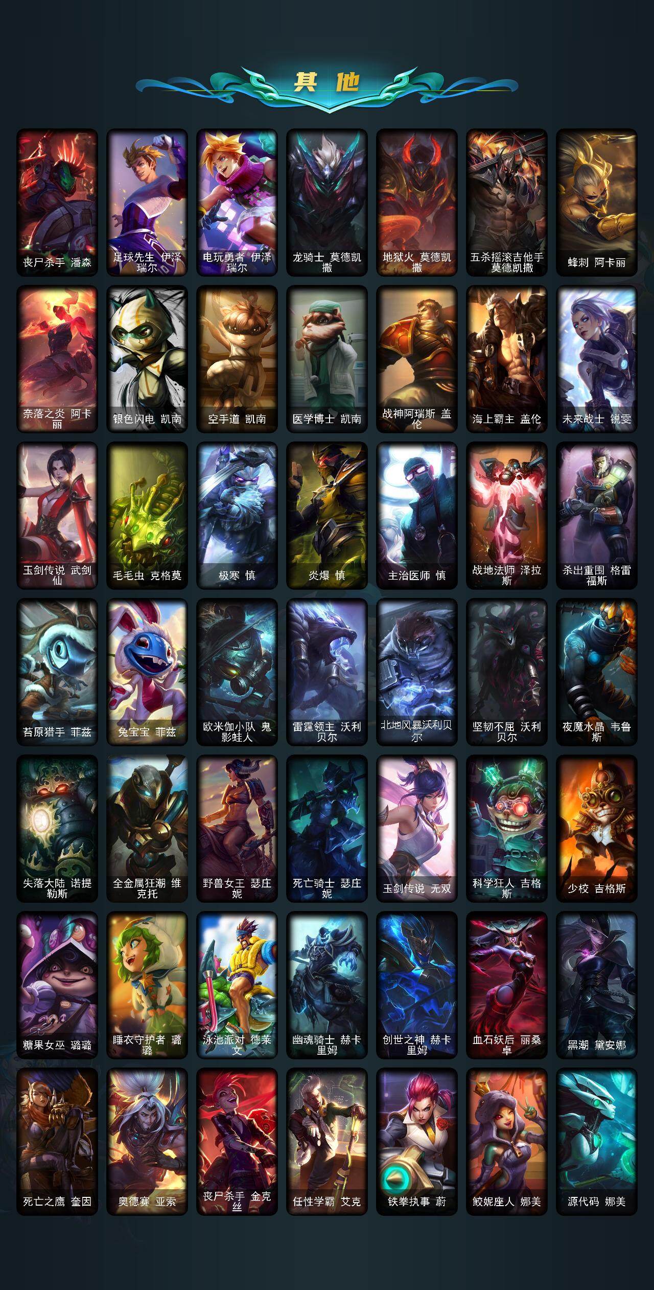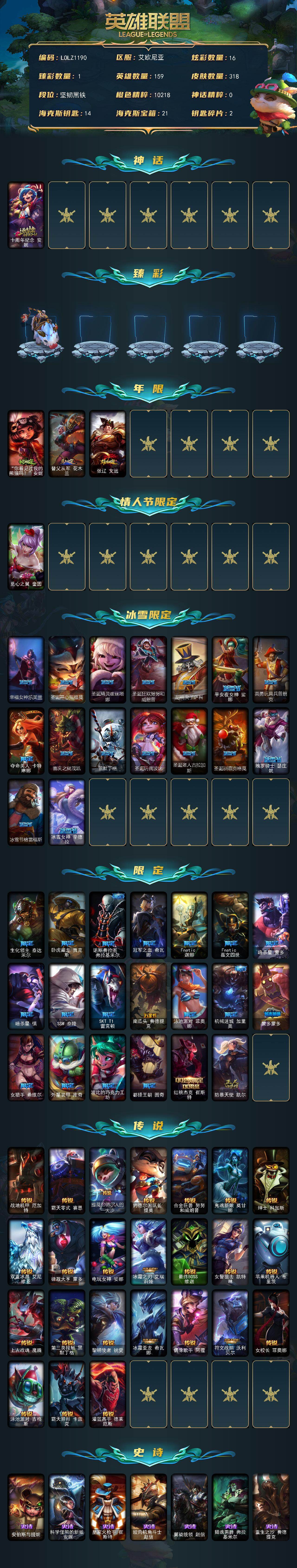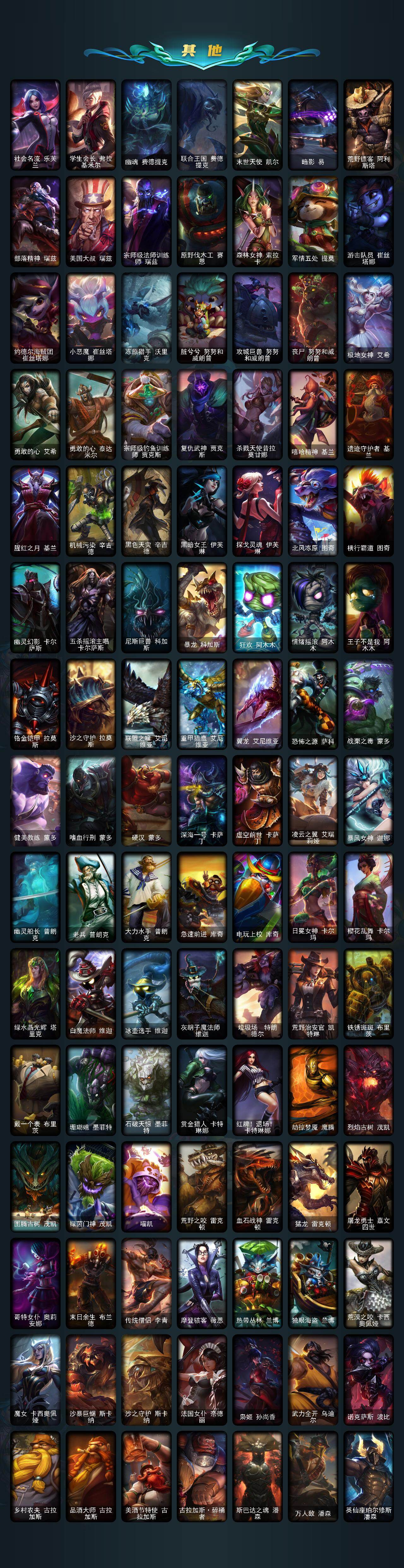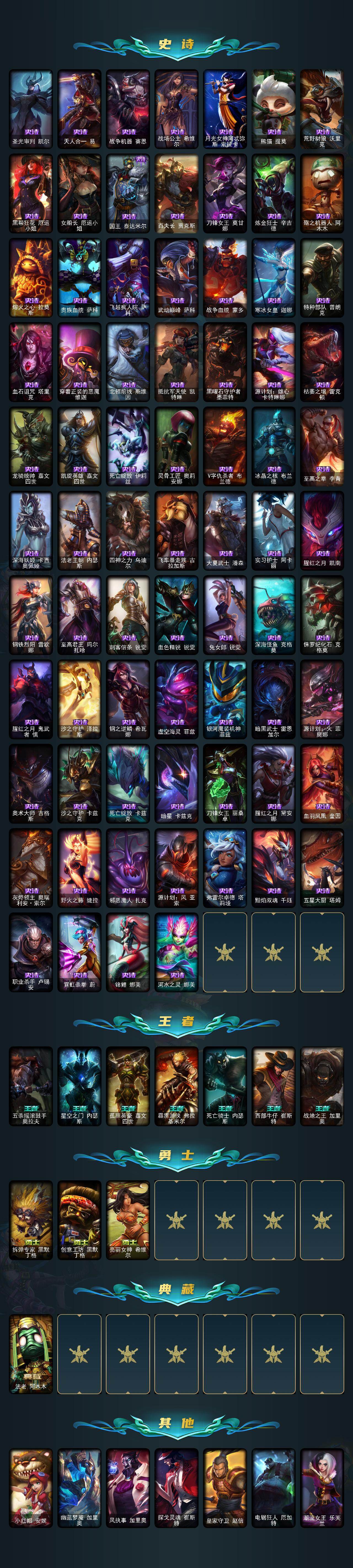 【lolz1190】159英雄/318皮肤/1神话/40限定/1臻彩/16炫彩/24传说/81史诗/未定级/十周年纪念安妮/无畏骑士瑟庄妮赤子初心/你看见过我的熊猫吗安妮/替父从军花木兰/张辽文远/觅心之翼奎因/幸福女神乐芙兰/圣诞开心鬼提莫/圣诞精灵崔丝塔娜/圣诞狂欢努努和威朗普/胡桃夹子萨科/平安夜女神娑娜/英勇玩具兵普朗克/夺命美人卡特琳娜/喜庆之树茂凯/雪默丁格/圣诞玩偶波比/圣诞老人古拉加斯/圣诞驯鹿克格莫/魄罗骑士瑟庄妮/冰雪节格雷福斯/冰雪女神辛德拉/生化领主泰达米尔/卧虎藏龙贾克斯/诺斯费拉图弗拉基米尔/冠军之血希瓦娜/fnatic迦娜/fnatic嘉文四世/暗杀星蒙多/暗杀星慎/ssw泰隆/sktt1雷克顿/南瓜头费德提克/泳池派对菲奥娜/机械迷城加里奥/蒙多蒙多/女猎手希维尔/外星装甲库奇/波比的巧克力工坊/都铎王朝图奇/红桃杰克崔斯特/防暴天使凯尔/战地机甲厄加特/霸天零式赛恩/提莫约德尔人的一大步/约德尔国队长提莫/合金巨兽努努和威朗普/鬼魂新娘莫甘娜/绅士科加斯/双重冰晶艾尼维亚/律政大亨蒙多/电玩女神娑娜/冰霜之刃艾瑞莉娅/最终boss维迦/女警狙击凯特琳/苹果机器人布里茨/上古战魂魔腾/第三类接触黑默丁格/黎明使者锐雯/冰霜亚龙希瓦娜/偶像歌手阿狸/符文战熊沃利贝尔/女校长菲奥娜/泳池派对吉格斯/霸天异形卡兹克/灌篮高手德莱厄斯/安伯斯与提妮/科学怪熊的新娘安妮/皇家火呛手崔斯特/绞肉机角斗士赵信/翼骑统领赵信/摄魂男爵弗拉基米尔/重生之沙费德提克/圣光审判凯尔/天人合一易/战争机器赛恩/战场公主希维尔/月光女神阿忒弥斯索拉卡/熊猫提莫/荒野豺狼沃里克/黑帮狂花厄运小姐/女船长厄运小姐/国王泰达米尔/百夫长贾克斯/刀锋女王莫甘娜/炼金狂士辛吉德/殇之机器人阿木木/熔火之心拉莫斯/贵族血统萨科/飞越疯人院萨科/武动巅峰萨科/战争血统蒙多/寒冰女皇迦娜/特种部队普朗克/血石诅咒塔里克/穿着正装的恶魔维迦/北领前线斯维因/抵抗军天使凯特琳/黑曜石守护者墨菲特/源计划雄心卡特琳娜/枯萎之壤雷克顿/龙骑统帅嘉文四世/凯旋英雄嘉文四世/死亡绽放伊莉丝/灵骨工匠奥莉安娜/v字仇杀者布兰德/冰晶之核布兰德/至高之拳李青/深海妖姬卡西奥佩娅/法老王朝内瑟斯/四神之力乌迪尔/飞车暴走族古拉加斯/大夏武士潘森/实习护士阿卡丽/腥红之月凯南/钢铁烈阳蕾欧娜/至高君王玛尔扎哈/刺客信条锐雯/血色精锐锐雯/兔女郎锐雯/深海怪鱼克格莫/侏罗纪化石克格莫/腥红之月鬼武者慎/沙之守护泽拉斯/钢之逆鳞希瓦娜/虚空海灵菲兹/银河魔装机神菲兹/暗黑武士雷恩加尔/源计划火菲奥娜/奥术大师吉格斯/沙之守护卡兹克/死亡绽放卡兹克/暗星卡兹克/刀锋女王丽桑卓/腥红之月黛安娜/血羽凤凰奎因/灰烬领主奥瑞利安索尔/野火之藤婕拉/邪恶魔人扎克/源计划风亚索/弗雷尔卓德塔莉垭/黯焰双魂千珏/五星大厨塔姆/职业杀手卢锡安/霓虹杀拳蔚/锦鲤娜美/河水之灵娜美/五杀摇滚鼓手奥拉夫/星空之门内瑟斯/孤胆英豪嘉文四世/霹雳游侠弗拉基米尔/死亡骑士内瑟斯/西部牛仔崔斯特/战地之王加里奥/拆弹专家黑默丁格/创意工坊黑默丁格/亮丽女神希维尔/法老阿木木/小红帽安妮/幽蓝梦魇加里奥/风执事加里奥/探戈灵魂崔斯特/皇家守卫赵信/电锯狂人厄加特/潮流女王乐芙兰/社会名流乐芙兰/学生会长弗拉基米尔/幽魂费德提克/联合王国费德提克/末世天使凯尔/暗影易/荒野镖客阿利斯塔/部落精神瑞兹/美国大叔瑞兹/宗师级法师训练师瑞兹/原野伐木工赛恩/森林女神索拉卡/军情五处提莫/游击队员崔丝塔娜/约德尔海贼团崔丝塔娜/小恶魔崔丝塔娜/冻原猎手沃里克/脏兮兮努努和威朗普/攻城巨兽努努和威朗普/丧尸努努和威朗普/极地女神艾希/勇敢的心艾希/勇敢的心泰达米尔/宗师级钓鱼训练师贾克斯/复仇武神贾克斯/杀戮天使昔拉莫甘娜/嘻哈精神基兰/遗迹守护者基兰/腥红之月基兰/机械污染辛吉德/黑色天灾辛吉德/黑暗女王伊芙琳/探戈灵魂伊芙琳/北风冻原图奇/横行霸道图奇/幽灵幻影卡尔萨斯/五杀摇滚主唱卡尔萨斯/尼斯巨兽科加斯/暴龙科加斯/狂欢阿木木/情绪摇滚阿木木/王子不是我阿木木/铬金铠甲拉莫斯/沙之守护拉莫斯/联盟之喙艾尼维亚/重甲猎鹰艾尼维亚/翼龙艾尼维亚/恐怖之源萨科/战栗之毒蒙多/健美教练蒙多/嗜血行刑蒙多/硬汉蒙多/深海一号卡萨丁/虚空前世卡萨丁/凌云之翼艾瑞莉娅/暴风女神迦娜/幽灵船长普朗克/老兵普朗克/大力水手普朗克/急速前进库奇/电玩上校库奇/日冕女神卡尔玛/樱花乱舞卡尔玛/绿水晶光辉塔里克/白魔法师维迦/冰壶选手维迦/灰胡子魔法师维迦/垃圾场特朗德尔/荒野治安官凯特琳/铁锈斑斑布里茨/戴一个表布里茨/珊瑚礁墨菲特/石破天惊墨菲特/赏金猎人卡特琳娜/红牌退场卡特琳娜/劫掠梦魇魔腾/烈焰古树茂凯/图腾古树茂凯/绿茵门神茂凯/喵凯/荒野之咬雷克顿/血石战神雷克顿/猛龙雷克顿/屠龙勇士嘉文四世/哥特女仆奥莉安娜/末日余生布兰德/传统僧侣李青/摩登骇客薇恩/热带丛林兰博/独眼海盗兰博/荒漠之咬卡西奥佩娅/魔女卡西奥佩娅/沙暴巨蝎斯卡纳/沙之守护斯卡纳/法国女仆奈德丽/枭姬孙尚香/武力全开乌迪尔/诺克萨斯波比/乡村农夫古拉加斯/品酒大师古拉加斯/美酒节特使古拉加斯/古拉加斯碎桶者/斯巴达之魂潘森/万人敌潘森/英仙座珀尔修斯潘森/丧尸杀手
