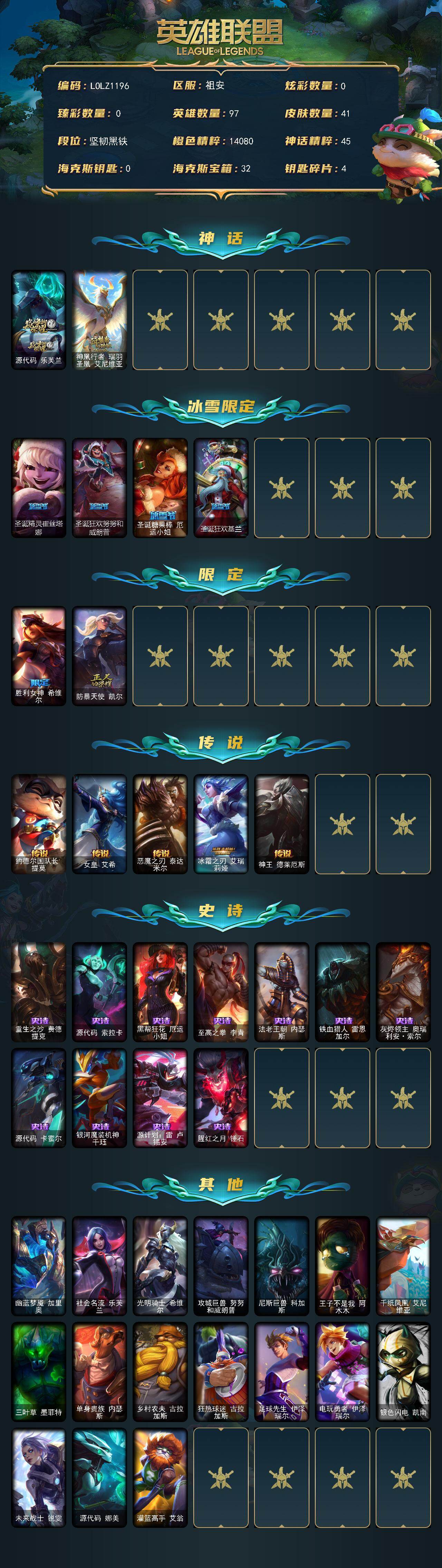 【lolz1196】97英雄/41皮肤/2神话/6限定/5传说/11史诗/未定级/源代码乐芙兰/神凰行者瑞羽圣凰艾尼维亚/圣诞精灵崔丝塔娜/圣诞狂欢努努和威朗普/圣诞糖果棒厄运小姐/圣诞狂欢基兰/胜利女神希维尔/防暴天使凯尔/约德尔国队长提莫/女皇艾希/恶魔之刃泰达米尔/冰霜之刃艾瑞莉娅/神王德莱厄斯/重生之沙费德提克/源代码索拉卡/黑帮狂花厄运小姐/至高之拳李青/法老王朝内瑟斯/铁血猎人雷恩加尔/灰烬领主奥瑞利安索尔/源代码卡蜜尔/银河魔装机神千珏/源计划雷卢锡安/腥红之月锤石/幽蓝梦魇加里奥/社会名流乐芙兰/光明骑士希维尔/攻城巨兽努努和威朗普/尼斯巨兽科加斯/王子不是我阿木木/千纸凤凰艾尼维亚/三叶草墨菲特/单身贵族内瑟斯/乡村农夫古拉加斯/狂热球迷古拉加斯/足球先生伊泽瑞尔/电玩勇者伊泽瑞尔/银色闪电凯南/未来战士锐雯/源代码娜美/灌篮高手艾翁