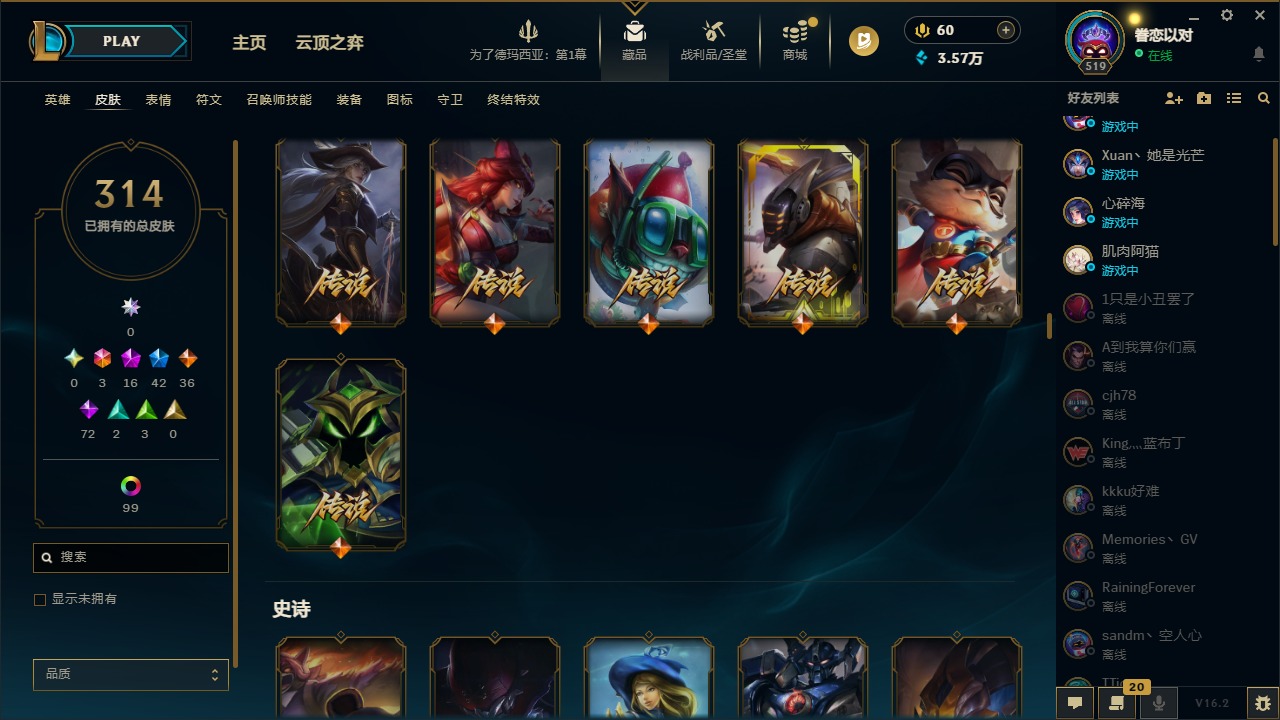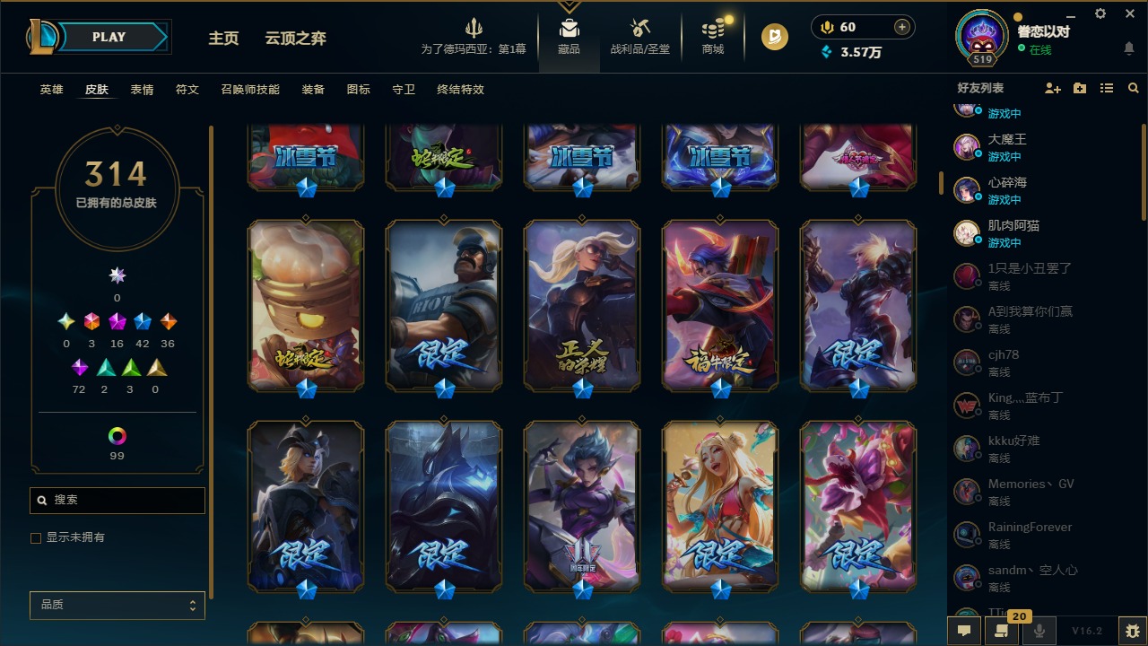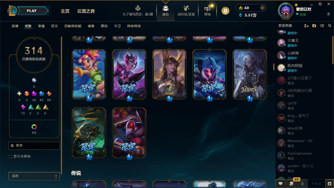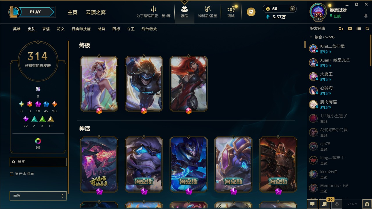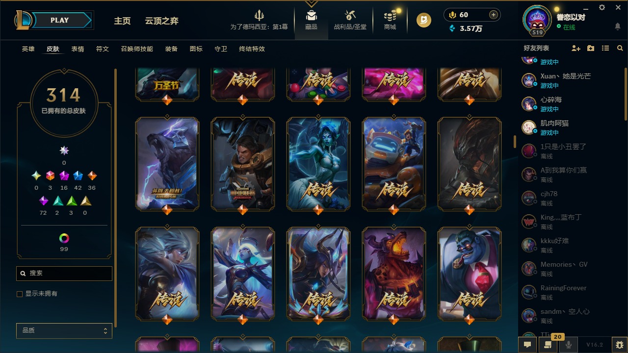 [16341696]3终极 16神话 42限定 36传说 72史诗 314皮肤 121炫彩 172英雄 可二次 可修改实名 【至臻】至臻 墨之影武者 亚索至臻 k/da 伊芙琳至臻 真实伤害 亚索至臻 灵能特工 伊泽瑞尔至臻 源计划:逆流 塞拉斯至臻 源计划:阴 劫至臻 飞升战神 潘森