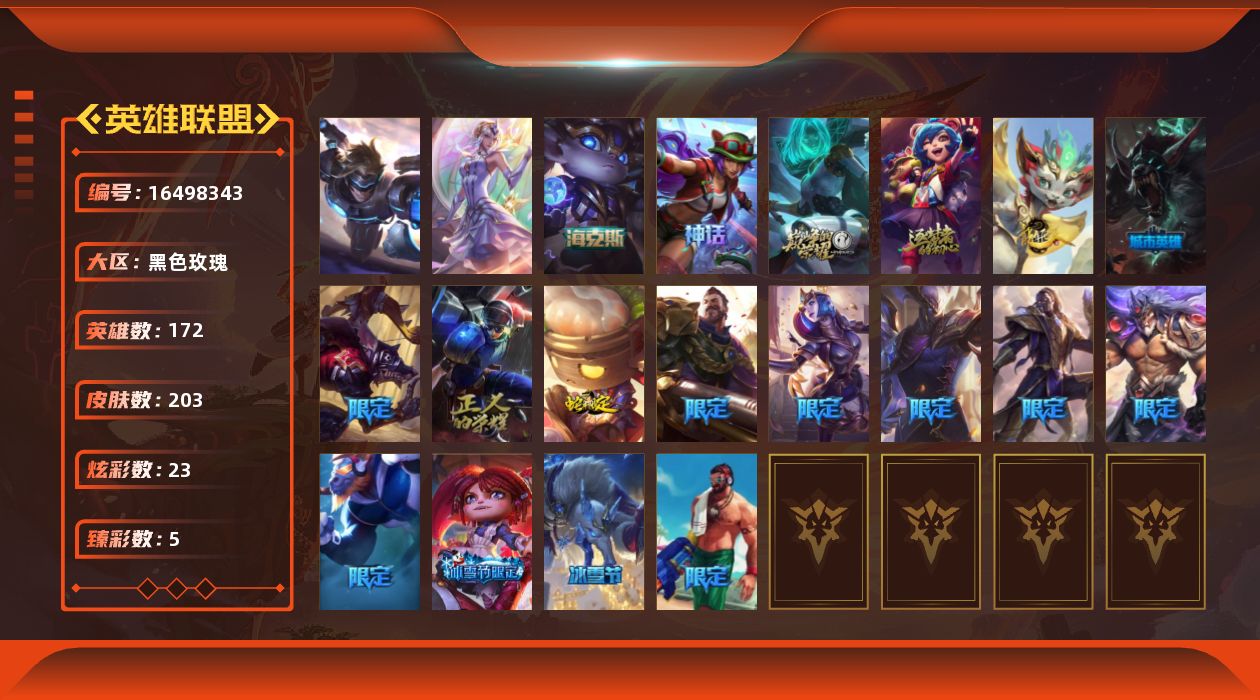 [16498343]【特价出售/店主推荐】未定级段位-172英雄-203皮肤-23炫彩-2终极-5神话-14限定-16传说-56史诗 【神话皮肤】:十周年纪念安妮,源代码乐芙兰,十五周年纪念希维尔,神凰行者瑞羽圣凰艾尼维亚,海克斯科技波比 【臻彩皮肤】:无畏骑士瑟庄妮赤子初心,玉剑传说无极麒麟,灵魂莲华锐雯流火,魔女阿卡丽虚荣,花仙子崔丝塔娜蓝闪 【年限皮肤】:天龙之子斯莫德,点心宝贝阿木木 【海克斯皮肤】:海克斯科技波比 【冰雪限定】:狂心冰王图奇,圣诞玩偶波比 【终极皮肤】:大元素使拉克丝,未来战士伊泽瑞尔 【限定皮肤】:sktt1阿利斯塔,胜利呛神格雷福斯,胜利女神奥莉安娜,胜利之剑亚托克斯,胜利呛神卢锡安,胜利之王泰达米尔,泳池派对格雷福斯,暗影沃里克,都铎王朝图奇,防暴天使凯尔 【传说皮肤】:铁哥们儿奥拉夫,战场女武神凯尔,日蚀骑士希维尔,约德尔国队长提莫,合金巨兽努努和威朗普,恶魔之刃泰达米尔,至尊魔女莫甘娜,绅士科加斯,律政大亨蒙多,电玩女神娑娜,银河魔装机神兰博,焰尾妖狐阿狸,宇航员诺提勒斯,女校长菲奥娜,泳池派对吉格斯,金牌主播德莱文 【史诗皮肤】:安伯斯与提妮,绞肉机角斗士赵信,圣光审判凯尔,天人合一易,兔宝宝提莫,熊猫提莫,黑帮狂花厄运小姐,少林武僧贾克斯,贵族血统萨科,夜行义贼艾瑞莉娅,特种部队普朗克,穿着正装的恶魔维迦,北领前线斯维因,抵抗军天使凯特琳,古墓丽影凯特琳,海贼魅影卡特琳娜,前线指挥官卡特琳娜,死亡绽放伊莉丝,灵骨工匠奥莉安娜,生化博士黑默丁格,法老王朝内瑟斯,四神之力乌迪尔,血色之锤波比,冰川勇者伊泽瑞尔,死亡领主莫德凯撒,银色之牙阿卡丽,刺客信条凯南,铁甲雄心盖伦,刺客信条锐雯,血色精锐锐雯,深海怪鱼克格莫,腥红之月鬼武者慎,战国大名慎,奥术光辉拉克丝,钢之逆鳞希瓦娜,暗影妖狐阿狸,银河魔装机神菲兹,铁血猎人雷恩加尔,皇家守卫菲奥娜,驯龙女巫璐璐,绞肉机刽子手德莱文,永恒之森赫卡里姆,死亡绽放卡兹克,铁血帝皇德莱厄斯,生化骑士德莱厄斯,仲裁圣女辛德拉,最后一只恐龙纳尔,西部牛仔亚索,源代码卡蜜尔,银河魔装机神千珏,霸天剑魔亚托克斯,锦鲤娜美,幽冥领主阿兹尔,腥红之月锤石,糖果之王艾翁,冰雪游神巴德 【王者皮肤】:西部牛仔崔斯特 【勇士皮肤】:冰河时代奥拉夫,亮丽女神希维尔 【典藏皮肤】:魔导绅士维迦 【其他皮肤1】:银河魔装机神安妮,风执事加