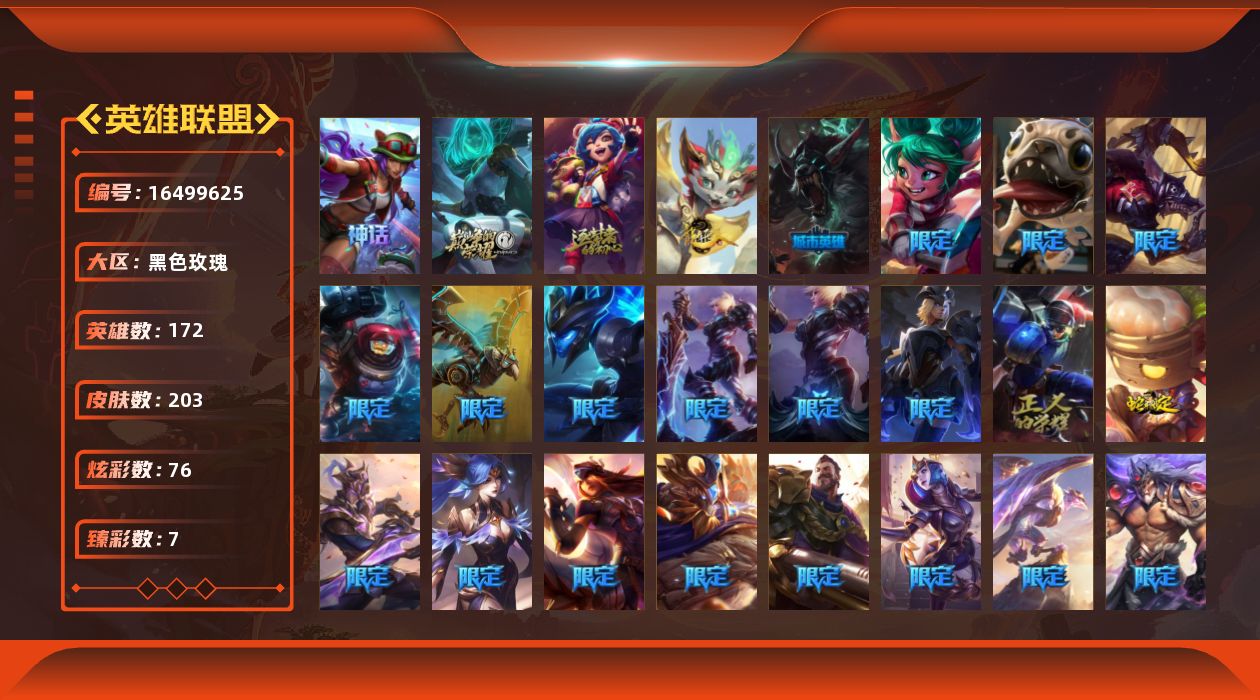 [16499625]【店主推荐捡漏号】未定级段位-172英雄-203皮肤-76炫彩-0终极-4神话-29限定-16传说-48史诗 【神话皮肤】:十周年纪念安妮,源代码乐芙兰,十五周年纪念希维尔,神凰行者瑞羽圣凰艾尼维亚 【珍稀头像】:雪花头像 【臻彩皮肤】:冠军之刃锐雯2016凯旋圣装,霸天战士雷恩加尔星啸天火,星之守护者辛德拉未来之光,玉剑传说琴仙子丁香,星之守护者霞烈羽,魔女阿卡丽虚荣,幽梦玫瑰泰隆浪漫花蕾 【年限皮肤】:天龙之子斯莫德,点心宝贝阿木木 【冰雪限定】:雪默丁格 【限定皮肤】:冠军之刃锐雯,冠军之血希瓦娜,冠军之矛卡莉丝塔,冠军之刃锐雯2016,fnatic迦娜,sktt1雷克顿,暗裔英雄盖伦,胜利女神希维尔,胜利之树茂凯,胜利呛神格雷福斯,胜利女神奥莉安娜,胜利凤凰艾尼维亚,胜利之王泰达米尔,胜利巨口克格莫,胜利女神娑娜,胜利剑圣易,胜利女神菲奥娜,泳池派对布隆,暗影沃里克,波比的巧克力工坊,都铎王朝图奇,钢铁之翼艾尼维亚,防暴机器人布里茨,防暴天使凯尔,克格汪 【传说皮肤】:地狱之门卫士加里奥,约德尔国队长提莫,烈焰雄心崔丝塔娜,鬼魂新娘莫甘娜,绅士科加斯,黯晶凤凰艾尼维亚,电玩女神娑娜,最终boss维迦,银河魔装机神兰博,第三类接触黑默丁格,炼狱魔犬内瑟斯,焰尾妖狐阿狸,宇航员诺提勒斯,女校长菲奥娜,金牌主播德莱文,黑夜使者亚索 【史诗皮肤】:安伯斯与提妮,科学怪熊的新娘安妮,皇家火呛手崔斯特,圣光审判凯尔,天人合一易,圣洁化身索拉卡,女船长厄运小姐,小小骑士阿木木,熔火之心拉莫斯,全金属狂潮拉莫斯,武动巅峰萨科,掠星魔刃卡萨丁,夜行义贼艾瑞莉娅,驯龙大师斯维因,符文战神雷克顿,腥红之月伊莉丝,地下拳王李青,苍穹之光薇恩,深海妖姬卡西奥佩娅,四神之力乌迪尔,军神战甲波比,血色之锤波比,死亡领主莫德凯撒,实习护士阿卡丽,银色之牙阿卡丽,至高君王玛尔扎哈,刺客信条锐雯,血色精锐锐雯,深海怪鱼克格莫,侏罗纪化石克格莫,腥红之月鬼武者慎,钢之逆鳞希瓦娜,铁血猎人雷恩加尔,暗黑武士雷恩加尔,白色死神韦鲁斯,绞肉机刽子手德莱文,生化骑士德莱厄斯,全金属狂潮杰斯,刀锋女王丽桑卓,暗黑女武神黛安娜,邪恶魔人扎克,西部牛仔亚索,源计划风亚索,战地机甲维克兹,腥红之月烬,源计划雷卢锡安,腥红之月锤石,虚空使者俄洛伊 【王者皮肤】:孤胆英豪嘉文四世,战地之王加里奥 【勇士皮肤】:亮