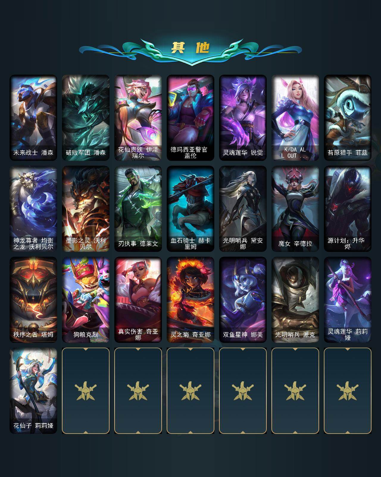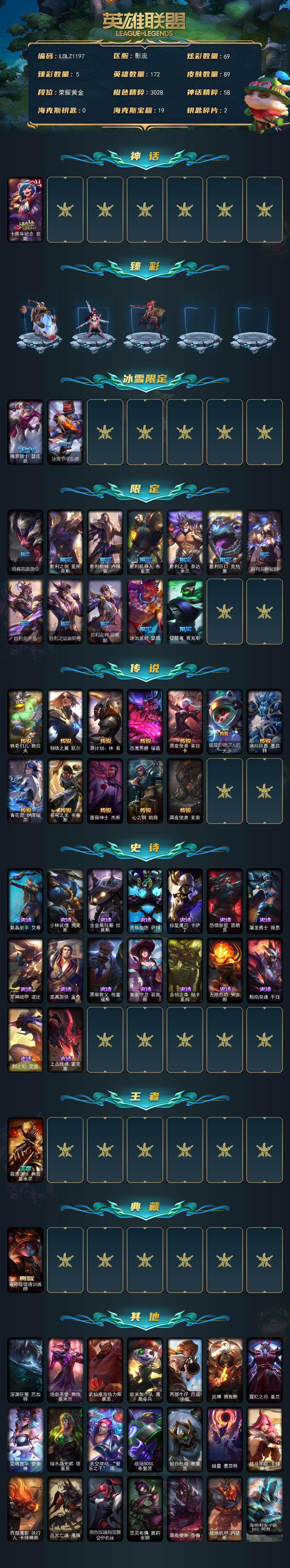 【lolz1197】172英雄/89皮肤/1神话/15限定/5臻彩/69炫彩/12传说/16史诗/黄金/十周年纪念安妮/无畏骑士瑟庄妮赤子初心/玉剑传说舞剑仙承影/黎明使者锐雯黑夜使者/星之守护者阿卡丽热情之光/霸天异形卡兹克黄金异端/魄罗骑士瑟庄妮/冰雪节辛吉德/暗裔英雄盖伦/胜利之剑亚托克斯/胜利呛神卢锡安/胜利机器人布里茨/胜利之王泰达米尔/胜利巨口克格莫/胜利女神娑娜/胜利剑圣易/胜利之运崔斯特/胜利女神菲奥娜/泳池派对瑟提/征服者贾克斯/铁哥们儿奥拉夫/钢铁之翼凯尔/源计划林易/恶魔男爵瑞兹/黑夜使者索拉卡/提莫约德尔人的一大步/冰川巨兽墨菲特/青花瓷伊泽瑞尔/苍穹之光韦鲁斯/蔷薇绅士杰斯/心之钢凯隐/黑夜使者亚索/紫晶射手艾希/少林武僧贾克斯/全金属狂潮拉莫斯/贵族血统萨科/掠星魔刃卡萨丁/恐惧新星普朗克/屠龙勇士薇恩/军神战甲波比/孤高游侠盖伦/黑帮教父格雷福斯/皇家守卫菲奥娜/永恒之森赫卡里姆/无限烈焰黛安娜/黯焰双魂千珏/时之砂艾克/上古战魂雷克塞/霹雳游侠弗拉基米尔/宗师级锻造训练师/深渊巨蟹厄加特/绝息圣堂弗拉基米尔/武仙座海格力斯赛恩/欧米伽小队魔鬼伞兵/西部牛仔厄运小姐/武神贾克斯/腥红之月基兰/灵魂莲华伊芙琳/绿水晶光辉塔里克/太空律动爱乐之子塔里克/战场boss布里茨/银白呛骑布里茨/暗星墨菲特/战斗学院卡特琳娜/西部魔影执行人卡特琳娜/恶咒亡魂魔腾/黑色玫瑰假面舞会伊莉丝/恶灵布偶奥莉安娜/黑夜使者李青/战地机甲内瑟斯/海珀利安小队s02阿努比斯内瑟斯/未来战士潘森/破败军团潘森/花仙贵族伊泽瑞尔/德玛西亚警官盖伦/灵魂莲华锐雯/kdaallout阿狸/苔原猎手菲兹/神龙尊者均衡之龙沃利贝尔/墨影之灵沃利贝尔/刃执事德莱文/血石骑士赫卡里姆/光明哨兵黛安娜/魔女辛德拉/源计划升华烬/秩序之舌塔姆/狗粮克烈/真实伤害奇亚娜/灵之菊奇亚娜/双鱼星神娜美/光明哨兵派克/灵魂莲华莉莉娅/花仙子莉莉娅