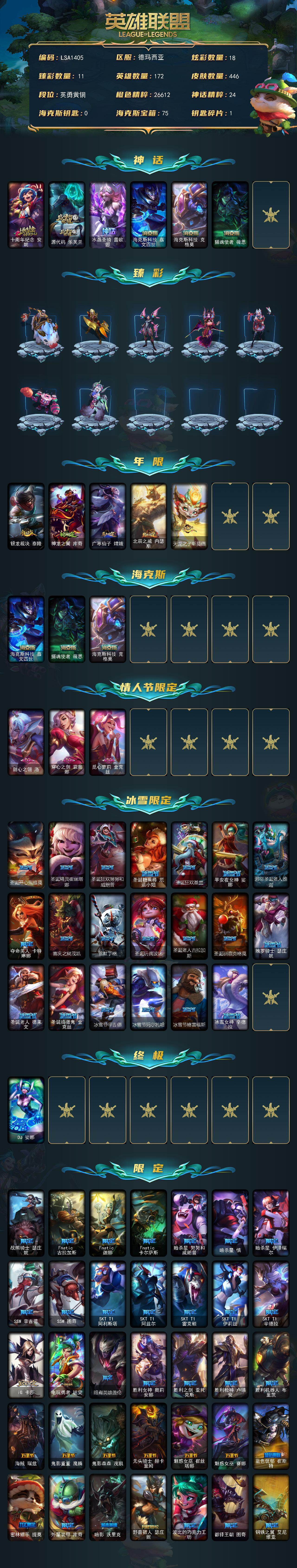 【lsa1405】172英雄/446皮肤/1终极/6神话/69限定/11臻彩/18炫彩/48传说/111史诗/青铜账号等级:718/十周年纪念安妮/源代码乐芙兰/水晶圣骑蕾欧娜/海克斯科技嘉文四世/海克斯科技克格莫/摄魂使者薇恩/天龙之子卡莎飞龙乘云/无畏骑士瑟庄妮赤子初心/墨之影武者亚索金墨耀影/征服者韦鲁斯炫金/弹幕天使卡莎炽天使勇敢/幻灵战斗蝠薇恩梦幻强袭/星之吞噬者莫甘娜热情之末/星之守护者卡莎热情之光/可爱可爱粉红红布里茨/魔女阿卡丽虚荣/净雪之月莫甘娜冬虹/银龙裁决泰隆/神龙之翼库奇/广寒仙子嫦娥/北辰之威内瑟斯/天龙之子斯莫德/甜心之翎洛/穿心之剑菲奥娜/觅心萝莉金克丝/圣诞开心鬼提莫/圣诞精灵崔丝塔娜/圣诞狂欢努努和威朗普/圣诞糖果棒厄运小姐/圣诞狂欢基兰/平安夜女神娑娜/邪恶圣诞老人维迦/夺命美人卡特琳娜/喜庆之树茂凯/雪默丁格/圣诞玩偶波比/圣诞老人古拉加斯/圣诞驯鹿克格莫/魄罗骑士瑟庄妮/圣诞老人德莱文/圣诞捣蛋鬼金克丝/冰雪节辛吉德/冰雪节玛尔扎哈/冰雪节格雷福斯/冰雪女神辛德拉/dj娑娜/战熊骑士瑟庄妮/fnatic古拉加斯/fnatic迦娜/fnatic卡尔萨斯/暗杀星努努和威朗普/暗杀星慎/暗杀星伊泽瑞尔/ssw辛吉德/ssw图奇/sktt1阿利斯塔/sktt1阿兹尔/sktt1雷克顿/sktt1伊莉丝/sktt1辛德拉/ig卡莎/电玩勇者锐雯/暗裔英雄盖伦/胜利女神奥莉安娜/胜利之剑亚托克斯/胜利呛神卢锡安/胜利机器人布里茨/海贼瑞兹/鬼影重重魔腾/鬼影森森茂凯/无头骑士赫卡里姆/魅惑女巫崔丝塔娜/魅惑女巫赛娜/蓝色忧郁崔斯特/密林猎手提莫/外星装甲库奇/暗影沃里克/野兽猎人瑟庄妮/波比的巧克力工坊/都铎王朝图奇/钢铁之翼艾尼维亚/制胜金靴李青/防暴天使凯尔/海之歌泽丽/警用试作体k9内瑟斯/克格汪/铁哥们儿奥拉夫/地狱之门卫士加里奥/魔幻卡牌崔斯特/大天使长米迦勒凯尔/战场女武神凯尔/源计划林易/霸天零式赛恩/黑夜使者索拉卡/合金巨兽努努和威朗普/女皇艾希/源计划联合艾希/鬼魂新娘莫甘娜/绅士科加斯/战地巨兽科加斯/双重冰晶艾尼维亚/黯晶凤凰艾尼维亚/律政大亨蒙多/最终boss维迦/女警狙击凯特琳/陆地王者4wd布里茨/冰川巨兽墨菲特/上古战魂魔腾/地狱行者孙悟空/丧尸布兰德/神拳李青/源计划净化薇恩/第三类接触黑默丁格/腥红之月鬼武姬阿卡丽/死亡骑士盖伦/钢铁军团盖伦/神王盖伦/黎明使者锐雯/星之守护者拉克丝/枯萎之壤泽拉斯/黯黑魔龙希瓦娜/冰霜亚龙希瓦娜/焰尾妖狐阿狸/符文战熊沃利贝尔/苍穹之光韦鲁斯/女校长菲奥娜/灌篮高手德莱厄斯/神王德莱厄斯/蔷薇绅士杰斯/黑夜使者亚索/星之守护者金克丝/西部魔影卢锡安/天煞劫/暗星锤石/冰霜烈焰安妮/安伯斯与提妮/皇家火呛手崔斯特/腥红之月崔斯特/特战先锋赵信/铁钩船长费德提克/重生之沙费德提克/侍魂易/地狱火阿利斯塔/战场公主希维尔/钢铁之心希维尔/圣洁化身索拉卡/兔宝宝提莫/火牙狼人沃里克/女船长厄运小姐/国王泰达米尔/少林武僧贾克斯/黑色荆棘莫甘娜/炼金狂士辛吉德/死神卡尔萨斯/卡尔萨斯祸害之光/侏罗纪化石科加斯/贵族血统萨科/飞越疯人院萨科/战争血统蒙多/恐惧新星普朗克/穿着正装的恶魔维迦/北领前线斯维因/驯龙大师斯维因/抵抗军天使凯特琳/铁血狙击手凯特琳/黑曜石守护者墨菲特/无畏号墨菲特/符文战神雷克顿/枯萎之壤雷克顿/龙骑统帅嘉文四世/死亡绽放伊莉丝/腥红之月伊莉丝/灵骨工匠奥莉安娜/三昧真火孙悟空/斗战胜佛孙悟空/灵魂烈焰布兰德/防弹武僧李青/至高之拳李青/地下拳王李青/苍穹之光薇恩/深海妖姬卡西奥佩娅/战地机甲斯卡纳/法老王朝内瑟斯/艳后奈德丽/军神战甲波比/血色之锤波比/飞车暴走族古拉加斯/死亡领主莫德凯撒/钢铁烈阳蕾欧娜/源计划山蕾欧娜/至高君王玛尔扎哈/腥红之月泰隆/血色精锐锐雯/帝王斑蝶克格莫/深海怪鱼克格莫/侏罗纪化石克格莫/腥红之月鬼武者慎/战国大名慎/奥术光辉拉克丝/odst地狱伞兵拉克丝/星际迷航拉克丝/沙之守护泽拉斯/钢之逆鳞希瓦娜/骸骨之爪希瓦娜/银河魔装机神菲兹/铁血猎人雷恩加尔/源计划火菲奥娜/奥术大师吉格斯/驯龙女巫璐璐/星之守护者璐璐/永恒之森赫卡里姆/沙之守护卡兹克/生化骑士德莱厄斯/全金属狂潮杰斯/天启骑士杰斯/暗黑女武神黛安娜/无限烈焰黛安娜/腥红之月黛安娜/血羽凤凰奎因/仲裁圣女辛德拉/野火之藤婕拉/驯龙女巫婕拉/最后一只恐龙纳尔/邪恶魔人扎克/西部牛仔亚索/腥红之月亚索/猛虎布隆/西部牛仔烬/腥红之月烬/黯焰双魂千珏/银河魔装机神千珏/黑帮狂花金克丝/五星大厨塔姆/职业杀手卢锡安/爵士克烈/源计划自由艾克/霓虹杀拳蔚/炼狱魔女蔚/仲裁圣骑亚托克斯/霸天剑魔亚托克斯/腥红之月锤石/上古战魂雷克塞/糖果之王艾翁/永恒之森巴德/暮星之羽霞/五杀摇滚鼓手奥拉夫/霹雳游侠弗拉基米尔/死亡骑士内瑟斯/战地之王加里奥/拆弹专家黑默丁格/冰河时代奥拉夫/亮丽女神希维尔/烈焰猛士奥拉夫/法老阿木木/钢铁终结者赛恩/深潜蛙人古拉加斯/嗜血狂暴沃里克/小红帽安妮/牛扒狂战奥拉夫/幽蓝梦魇加里奥/风执事加里奥/未来战士崔斯特/地下都市梦魇崔斯特/赵云子龙/深渊巨蟹厄加特/社会名流乐芙兰/弗拉基米尔伯爵/弗拉基米尔侯爵/幽魂费德提克/钢铁审判官凯尔/五杀摇滚女声主唱凯尔/星战易/金牛座阿利斯塔/后场堡垒阿利斯塔/哞利斯