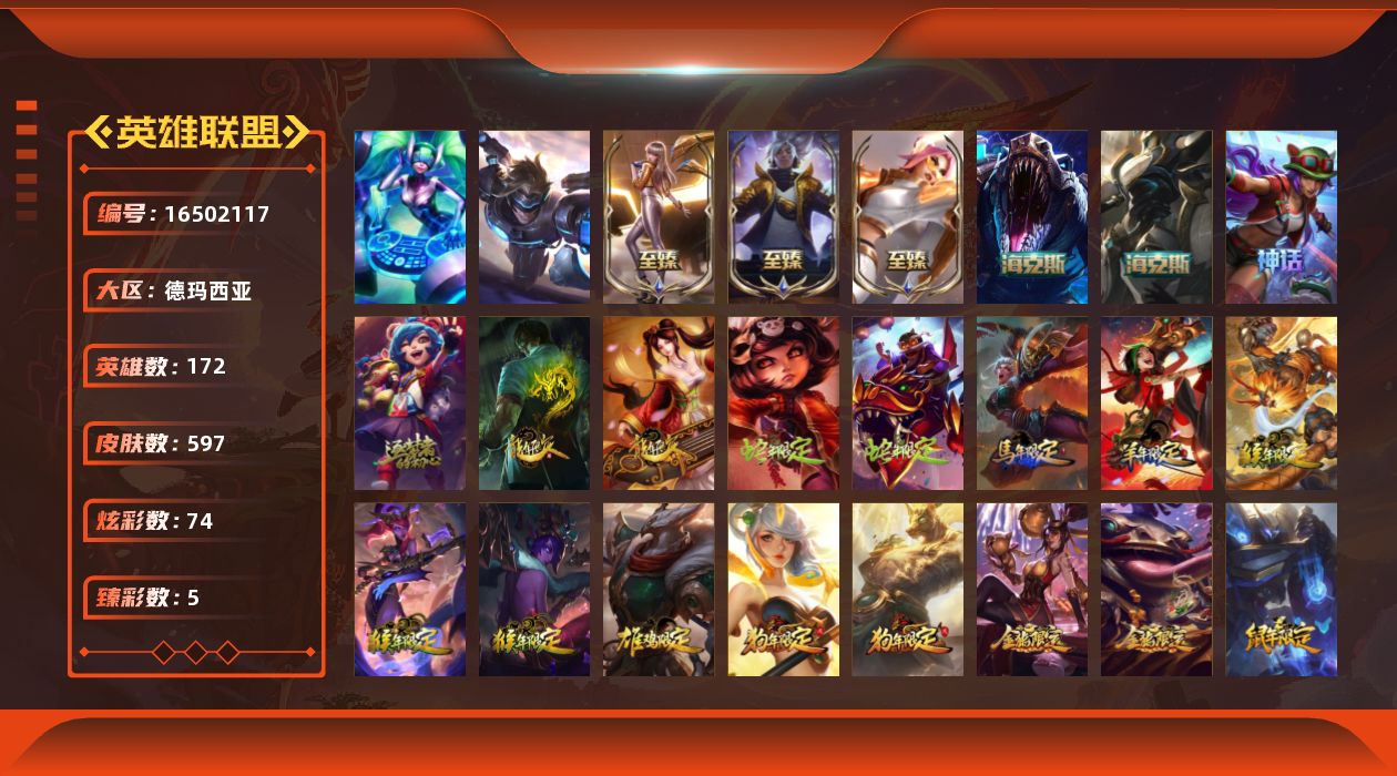 [16502117]【店主推荐捡漏号】未定级段位-172英雄-597皮肤-74炫彩-2终极-7神话-99限定-43传说-162史诗 【珍稀头像】:雪花头像 【热门头像】:觅心游侠卢锡安头像 【至臻皮肤】:至臻福牛守护者菲奥娜,至臻kda卡莎,至臻真实伤害亚索 【臻彩皮肤】:冠军掠夺者卡兹克凯旋圣装,雾雨之刃锐雯,神龙尊者圣龙李青登龙,弹幕天使卡莎炽天使公正,玉剑传说神机花火青竹 【年限皮肤】:龙的传人李青,古琴余韵娑娜,你看见过我的熊猫吗安妮,碧玉之牙卡西奥佩娅,神龙之翼库奇,替父从军花木兰,神龙烈焰金克丝,美猴王孙悟空,紫金罗刹莫甘娜,玉净夜叉凯特琳,司马懿仲达,北辰之威内瑟斯,春晖神女拉克丝,烈焰美人薇恩,纳财大帝塔姆,王国机神玄武盖伦 【海克斯皮肤】:海克斯科技雷克顿,零之呛骑赫卡里姆 【情人节限定】:碎心之拳蔚,觅心猎手薇恩,觅心魔灵奥莉安娜 【冰雪限定】:幸福女神乐芙兰,持胡萝卜的雪人易,圣诞开心鬼提莫,圣诞精灵崔丝塔娜,圣诞狂欢努努和威朗普,圣诞糖果棒厄运小姐,圣诞狂欢基兰,阿木木“主人不要我了”,胡桃夹子萨科,冰封王子蒙多,平安夜女神娑娜,英勇玩具兵普朗克,邪恶圣诞老人维迦,夺命美人卡特琳娜,喜庆之树茂凯,冬季仙境奥莉安娜,雪默丁格,圣诞玩偶波比,冰雪驯鹿波比,圣诞老人古拉加斯,圣诞驯鹿克格莫,圣诞老人布隆,冰雪节辛吉德,冰雪节玛尔扎哈,冰雪节格雷福斯 【终极皮肤】:dj娑娜,未来战士伊泽瑞尔 【神话皮肤】:十周年纪念安妮,十五周年纪念希维尔,海克斯科技雷克顿,零之呛骑赫卡里姆,至臻真实伤害亚索,至臻福牛守护者菲奥娜,至臻kda卡莎 【限定皮肤】:创星之灵璐璐,斩星魔剑易,冠军之血希瓦娜,冠军之矛卡莉丝塔,冠军之箭艾希,冠军掠夺者卡兹克,fnatic古拉加斯,fnatic迦娜,fnatic嘉文四世,fnatic卡尔萨斯,fnatic库奇,暗杀星蒙多,暗杀星慎,暗杀星伊泽瑞尔,sktt1贾克斯,sktt1婕拉,sktt1薇恩,ssw图奇,ssw泰隆,sktt1阿利斯塔,sktt1阿兹尔,sktt1雷克顿,sktt1瑞兹,sktt1艾克,sktt1烬,ssg纳尔,ssg霞,ig卡莎,勇敢的心德莱厄斯,电玩女神阿狸,星之守护者伊泽瑞尔,玉剑传说舞剑仙,暗裔英雄盖伦,海贼瑞兹,南瓜头费德提克,鬼影重重魔腾,鬼影森森茂凯,无头骑士赫卡里姆,糖果使徒费德提克,泳池派对菲奥娜,泳池派