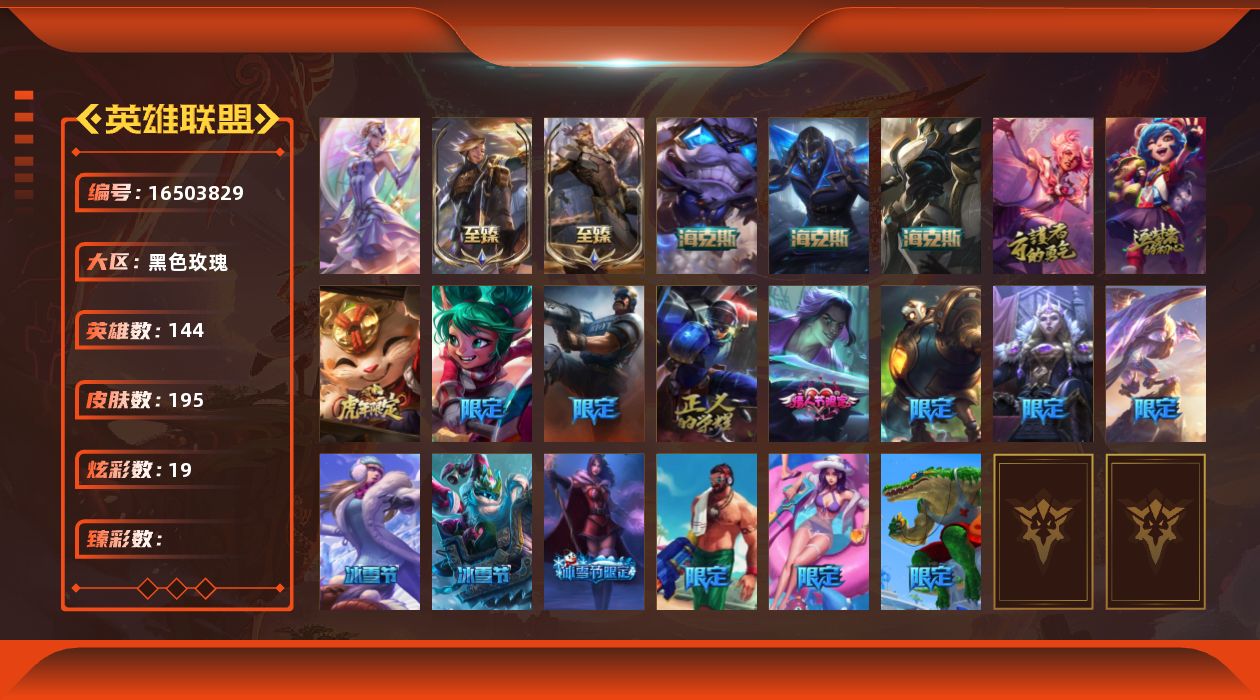 [16503829]可二次【特价出售/店主推荐】未定级段位-144英雄-195皮肤-19炫彩-1终极-8神话-20限定-28传说-46史诗 【至臻皮肤】:至臻灵能特工伊泽瑞尔,至臻源计划逆流塞拉斯 【年限皮肤】:招财进宝提莫 【海克斯皮肤】:海克斯科技卡萨丁,海克斯科技吉格斯,零之呛骑赫卡里姆 【情人节限定】:幽梦玫瑰泰隆 【冰雪限定】:幸福女神乐芙兰,圣诞狂欢努努和威朗普,英勇玩具兵普朗克,邪恶圣诞老人维迦,喜庆之树茂凯,圣诞老人古拉加斯,冰雪节辛吉德,冰雪女神辛德拉 【终极皮肤】:大元素使拉克丝 【神话皮肤】:十周年纪念安妮,神凰行者瑞羽圣凰艾尼维亚,星之守护者塔莉垭,海克斯科技吉格斯,海克斯科技卡萨丁,零之呛骑赫卡里姆,至臻灵能特工伊泽瑞尔,至臻源计划逆流塞拉斯 【限定皮肤】:玉剑传说无影,胜利机器人布里茨,胜利女神瑟庄妮,胜利凤凰艾尼维亚,泳池派对格雷福斯,泳池派对凯特琳,泳池派对雷克顿,波比的巧克力工坊,防暴士兵格雷福斯,防暴天使凯尔 【传说皮肤】:地狱之门卫士加里奥,邪鸦魅影乐芙兰,血石领主弗拉基米尔,大天使长米迦勒凯尔,恶魔男爵瑞兹,欧米伽小队幽灵特工,烈焰雄心崔丝塔娜,源计划联合艾希,双重冰晶艾尼维亚,灵能特工娑娜,红色男爵库奇,女帝卡特琳娜,地狱行者孙悟空,神龙尊者圣龙李青,光明哨兵薇恩,银河魔装机神兰博,炼狱魔犬内瑟斯,神王盖伦,黯黑魔龙希瓦娜,灵魂莲华阿狸,苍穹之光韦鲁斯,霸天异形卡兹克,神王德莱厄斯,蔷薇绅士杰斯,星之守护者金克丝,西部魔影卢锡安,真实伤害艾克,星之守护者洛 【史诗皮肤】:冰霜烈焰安妮,安伯斯与提妮,战争机器赛恩,钢铁之心希维尔,熊猫提莫,火牙狼人沃里克,黑帮狂花厄运小姐,女船长厄运小姐,紫晶射手艾希,国王泰达米尔,炼金狂士辛吉德,卡尔萨斯祸害之光,侏罗纪化石科加斯,全金属狂潮拉莫斯,掠星魔刃卡萨丁,特种部队普朗克,霸天巨兽墨菲特,无畏号墨菲特,海贼魅影卡特琳娜,前线指挥官卡特琳娜,蓝焰梦魔魔腾,符文战神雷克顿,死亡绽放伊莉丝,法老王朝内瑟斯,军神战甲波比,飞车暴走族古拉加斯,战国大名慎,银河魔装机神希瓦娜,黑帮教父格雷福斯,虚空海灵菲兹,铁血猎人雷恩加尔,奥术大师吉格斯,驯龙女巫璐璐,铁血帝皇德莱厄斯,生化骑士德莱厄斯,天启骑士杰斯,刀锋女王丽桑卓,暗黑女武神黛安娜,灰烬领主奥瑞利安索尔,最后一只恐龙纳尔,源代码卡蜜尔,黯焰双魂千珏,源计划雷