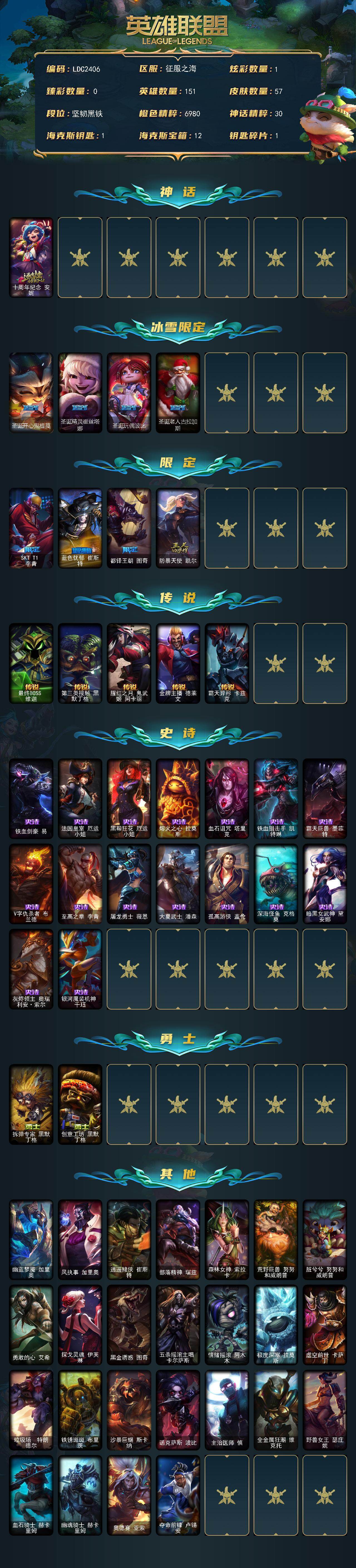 【ldc2406】151英雄/57皮肤/1神话/8限定/1炫彩/5传说/16史诗/未定级/十周年纪念安妮/圣诞开心鬼提莫/圣诞精灵崔丝塔娜/圣诞玩偶波比/圣诞老人古拉加斯/sktt1李青/蓝色忧郁崔斯特/都铎王朝图奇/防暴天使凯尔/最终boss维迦/第三类接触黑默丁格/腥红之月鬼武姬阿卡丽/金牌主播德莱文/霸天异形卡兹克/铁血剑豪易/法国皇室厄运小姐/黑帮狂花厄运小姐/熔火之心拉莫斯/血石诅咒塔里克/铁血狙击手凯特琳/霸天巨兽墨菲特/v字仇杀者布兰德/至高之拳李青/屠龙勇士薇恩/大夏武士潘森/孤高游侠盖伦/深海怪鱼克格莫/暗黑女武神黛安娜/灰烬领主奥瑞利安索尔/银河魔装机神千珏/拆弹专家黑默丁格/创意工坊黑默丁格/幽蓝梦魇加里奥/风执事加里奥/赌侠崔斯特/部落精神瑞兹/森林女神索拉卡/荒野巨兽努努和威朗普/脏兮兮努努和威朗普/勇敢的心艾希/探戈灵魂伊芙琳/黑金诱惑图奇/五杀摇滚主唱卡尔萨斯/情绪摇滚阿木木/极度深寒拉莫斯/虚空前世卡萨丁/垃圾场特朗德尔/铁锈斑斑布里茨/沙暴巨蝎斯卡纳/诺克萨斯波比/主治医师慎/全金属狂潮维克托/野兽女王瑟庄妮/血石骑士赫卡里姆/幽魂骑士赫卡里姆/奥德赛亚索/夺命前锋卢锡安