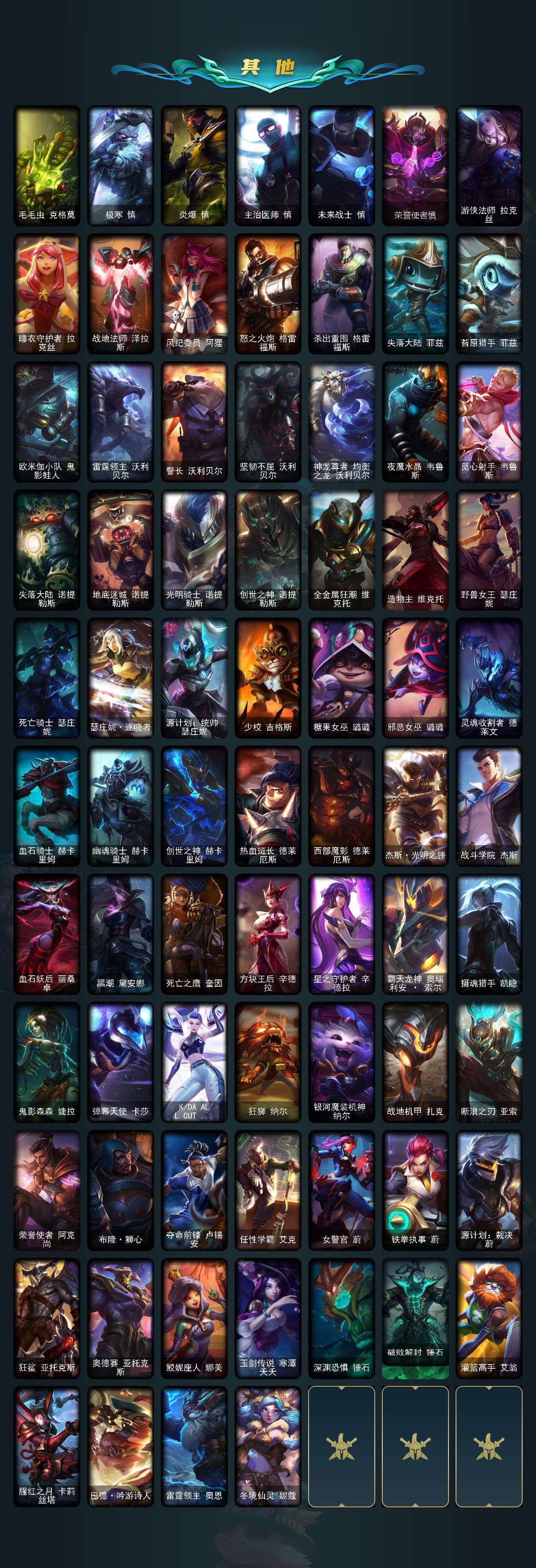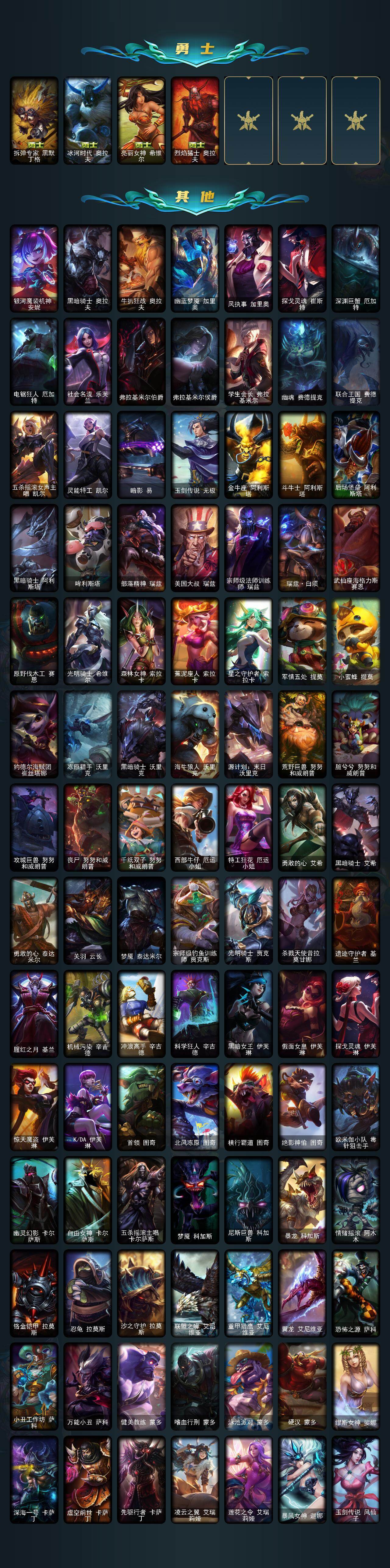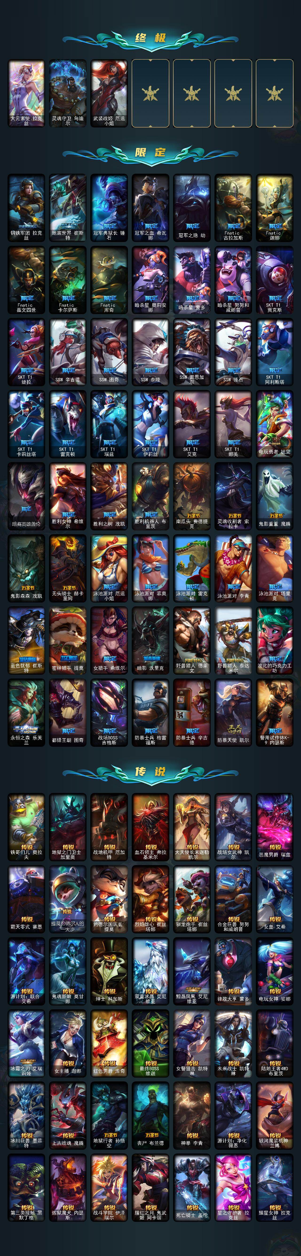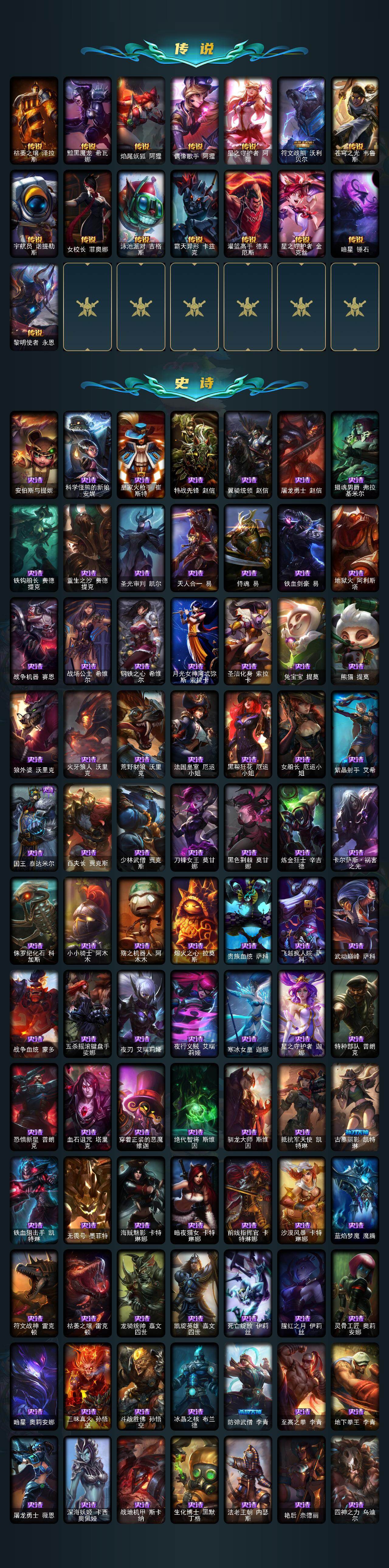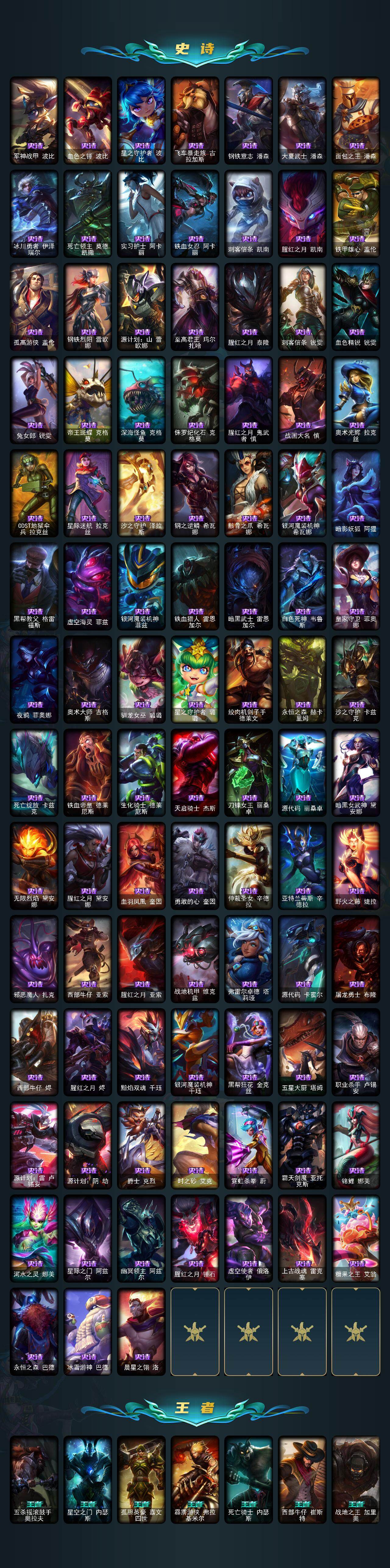黄金段位-172英雄-637皮肤-16炫彩-3终极-20神话-90限定-57传说-178史诗 【神话皮肤】:十周年纪念安妮,十五周年纪念希维尔,暗星科加斯,海克斯科技阿利斯塔,海克斯科技阿木木,海克斯科技波比,海克斯科技嘉文四世,海克斯科技吉格斯,海克斯科技克格莫,海克斯科技拉莫斯,海克斯科技斯维因,恐惧新星德莱厄斯,零之呛骑赫卡里姆,摄魂使者薇恩,新创战纪希维尔,至臻真实伤害赛娜,至臻灵能特工伊泽瑞尔,至臻魔女婕拉,至臻未来战士卢锡安,至臻星之守护者索拉卡 【热门头像】:星守索拉卡头像 【至臻皮肤】:至臻星之守护者索拉卡,至臻灵能特工伊泽瑞尔,至臻魔女婕拉,至臻真实伤害赛娜,至臻未来战士卢锡安 【臻彩皮肤】:天龙之子卡莎飞龙乘云,墨之影武者亚索金墨耀影,魔女阿卡丽虚荣,魔女阿狸饕餮,净雪之月莫甘娜冬虹,心之钢伊泽瑞尔天纵才华 【年限皮肤】:银龙裁决泰隆,定海神珍孙悟空,碧玉之牙卡西奥佩娅,北辰之威内瑟斯,春晖神女拉克丝,金猪烈焰瑟庄妮,天龙之子斯莫德,点心宝贝阿木木 【海克斯皮肤】:海克斯科技阿利斯塔,新创战纪希维尔,海克斯科技阿木木,海克斯科技拉莫斯,海克斯科技斯维因,海克斯科技嘉文四世,摄魂使者薇恩,海克斯科技波比,海克斯科技克格莫,海克斯科技吉格斯,零之呛骑赫卡里姆,恐惧新星德莱厄斯 【情人节限定】:觅心猎手薇恩 【冰雪限定】:幸福女神乐芙兰,圣诞开心鬼提莫,圣诞精灵崔丝塔娜,圣诞狂欢努努和威朗普,圣诞糖果棒厄运小姐,圣诞狂欢基兰,阿木木“主人不要我了”,胡桃夹子萨科,平安夜女神娑娜,冬季仙境卡尔玛,邪恶圣诞老人维迦,喜庆之树茂凯,冬季仙境奥莉安娜,雪默丁格,圣诞玩偶波比,圣诞老人古拉加斯,圣诞驯鹿克格莫,魄罗骑士瑟庄妮,雪球也能爆炸吉格斯,寒冬精灵璐璐,圣诞老人布隆,冰雪节辛吉德,冰雪节玛尔扎哈,冰雪节格雷福斯,冰雪女神辛德拉 【终极皮肤】:大元素使拉克丝,灵魂守卫乌迪尔,武装战姬厄运小姐 【限定皮肤】:钢铁军团拉克丝,地底世界崔斯特,冠军典狱长锤石,冠军之血希瓦娜,冠军之隐劫,fnatic古拉加斯,fnatic迦娜,fnatic嘉文四世,fnatic卡尔萨斯,fnatic库奇,暗杀星奥莉安娜,暗杀星蒙多,暗杀星努努和威朗普,sktt1贾克斯,sktt1婕拉,ssw辛吉德,ssw图奇,ssw泰隆,ssw雷恩加尔,ssw锤石,sktt1阿利斯塔,sktt1卡莉丝塔,sktt1雷克顿,sktt1瑞兹,sktt1伊莉丝,sktt1艾克,sktt1娜美,电玩勇者锐雯,暗裔英雄盖伦,胜利女神希维尔,胜利之树茂凯,胜利机器人布里茨,南瓜头费德提克,灵魂收割者索拉卡,鬼影重重魔腾,鬼影森森茂凯,无头骑士赫卡里姆,泳池派对厄运小姐,泳池派对菲奥娜,泳池派对雷克顿,泳池派对李青,泳池派对塔里克,蓝色忧郁崔斯特,密林猎手提莫,女猎手希维尔,暗影沃里克,野兽猎人德莱文,野兽猎人泰达米尔,波比的巧克力工坊,永恒之森乐芙兰,都铎王朝图奇,战场boss吉格斯,防暴士兵格雷福斯,防暴士兵辛吉德,防暴天使凯尔,警用试作体k9内瑟斯 【传说皮肤】:铁哥们儿奥拉夫,地狱之门卫士加里奥,战地机甲厄加特,血石领主弗拉基米尔,大天使长米迦勒凯尔,战场女武神凯尔,恶魔男爵瑞兹,霸天零式赛恩,提莫约德尔人的一大步,约德尔国队长提莫,烈焰雄心崔丝塔娜,驯龙炮手崔丝塔娜,合金巨兽努努和威朗普,女皇艾希,源计划联合艾希,鬼魂新娘莫甘娜,绅士科加斯,双重冰晶艾尼维亚,黯晶凤凰艾尼维亚,律政大亨蒙多,电玩女神娑娜,冰霜之刃艾瑞莉娅,女主播迦娜,红色男爵库奇,最终boss维迦,女警狙击凯特琳,未来战士凯特琳,陆地王者4wd布里茨,冰川巨兽墨菲特,上古战魂魔腾,地狱行者孙悟空,丧尸布兰德,神拳李青,源计划净化薇恩,银河魔装机神兰博,第三类接触黑默丁格,炼狱魔犬内瑟斯,战斗学院伊泽瑞尔,腥红之月鬼武姬阿卡丽,死亡骑士盖伦,星之守护者拉克丝,耀星女神拉克丝,枯萎之壤泽拉斯,黯黑魔龙希瓦娜,焰尾妖狐阿狸,偶像歌手阿狸,星之守护者阿狸,符文战熊沃利贝尔,苍穹之光韦鲁斯,宇航员诺提勒斯,女校长菲奥娜,泳池派对吉格斯,霸天异形卡兹克,灌篮高手德莱厄斯,星之守护者金克丝,暗星锤石,黎明使者永恩 【史诗皮肤】:安伯斯与提妮,科学怪熊的新娘安妮,皇家火呛手崔斯特,特战先锋赵信,翼骑统领赵信,屠龙勇士赵信,摄魂男爵弗拉基米尔,铁钩船长费德提克,重生之沙费德提克,圣光审判凯尔,天人合一易,侍魂易,铁血剑豪易,地狱火阿利斯塔,战争机器赛恩,战场公主希维尔,钢铁之心希维尔,月光女神阿忒弥斯索拉卡,圣洁化身索拉卡,兔宝宝提莫,熊猫提莫,狼外婆沃里克,火牙狼人沃里克,荒野豺狼沃里克,法国皇室厄运小姐,黑帮狂花厄运小姐,女船长厄运小姐,紫晶射手艾希,国王泰达米尔,百夫长贾克斯,少林武僧贾克斯,刀锋女王莫甘娜,黑色荆棘莫甘娜,炼金狂士辛吉德,卡尔萨斯祸害之光,侏罗纪化石科加斯,小小骑士阿木木,殇之机器人阿木木,熔火之心拉莫斯,贵族血统萨科,飞越疯人院萨科,武动巅峰萨科,战争血统蒙多,五杀摇滚键盘手娑娜,夜刃艾瑞莉娅,夜行义贼艾瑞莉娅,寒冰女皇迦娜,星之守护者迦娜,特种部队普朗克,恐惧新星普朗克,血石诅咒塔里克,穿着正装的恶魔维迦,绝代智将斯维因,驯龙大师斯维因,抵抗军天使凯特琳,古墓丽影凯特琳,铁血狙击手凯特琳,无畏号墨菲特,海贼魅影卡特琳娜,暗夜猫女卡特琳娜,前线指挥官卡特琳娜,沙漠风暴卡特琳娜,蓝焰梦魔魔腾,符文战神雷克顿,枯