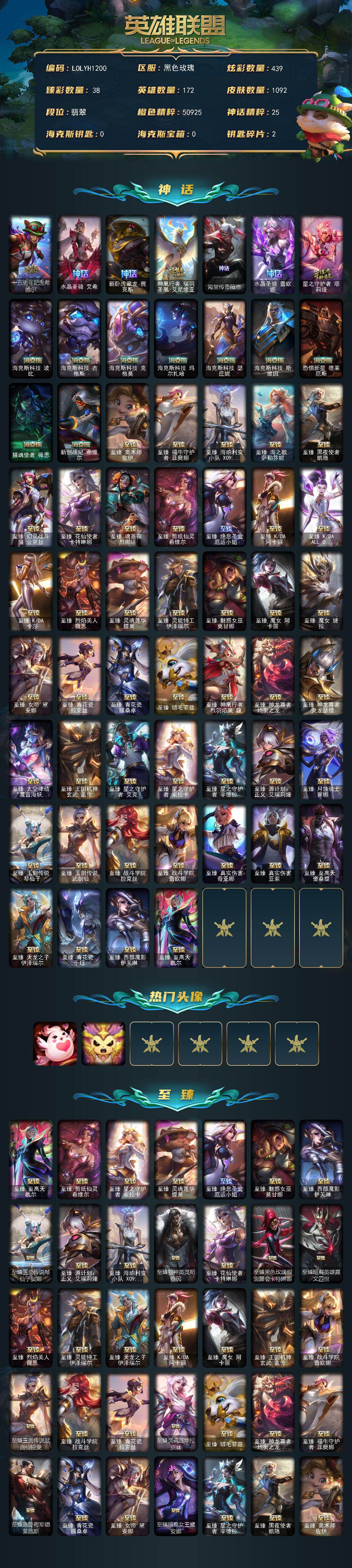 【lolyh1200】172英雄/1092皮肤/3终极/70神话/138限定/38臻彩/439炫彩/115传说/188史诗/流光翡翠账号等级:834/十五周年纪念希维尔/水晶圣骑艾希/新卧虎藏龙贾克斯/10周年神凰行者瑞羽圣凰艾尼维亚/殿堂传奇薇恩/水晶圣骑蕾欧娜/星之守护者塔莉垭/海克斯波比/海克斯科技吉格斯/海克斯科技克格莫/海克斯科技玛尔扎哈/海克斯科技瑟庄妮/海克斯科技斯维因/海克斯恐