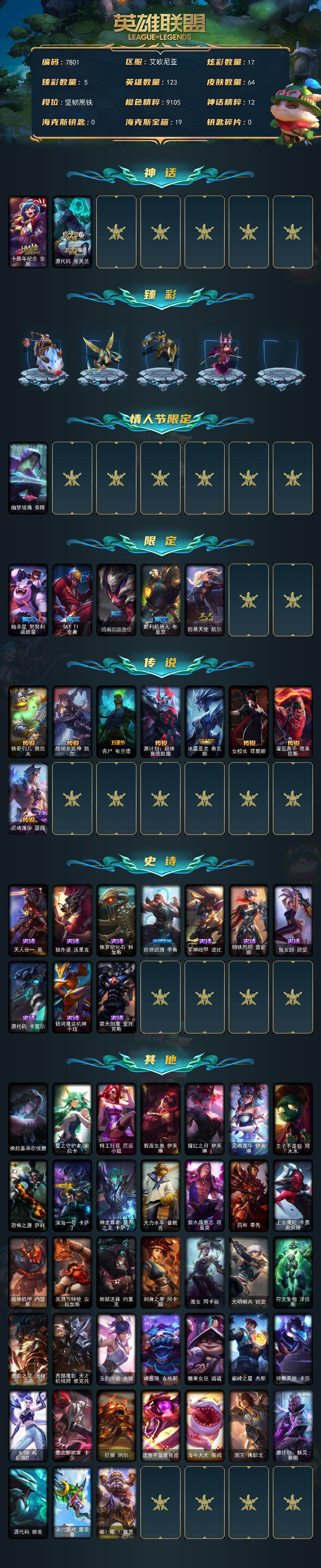 未定级段位-123英雄-64皮肤-17炫彩-0终极-2神话-6限定-8传说-10史诗 【神话皮肤】:十周年纪念安妮,源代码乐芙兰 【臻彩皮肤】:无畏骑士瑟庄妮赤子初心,冠军掠夺者卡兹克凯旋圣装,冠军之血希瓦娜凯旋圣装,星之吞噬者莫甘娜热情之末,红莲之刃锐雯 【情人节限定】:幽梦玫瑰泰隆 【限定皮肤】:暗杀星努努和威朗普,sktt1李青,暗裔英雄盖伦,胜利机器人布里茨,防暴天使凯尔 【传说皮肤】:铁哥们儿奥拉夫,战场女武神凯尔,丧尸布兰德,源计划超体莫德凯撒,冰霜亚龙希瓦娜,女校长菲奥娜,灌篮高手德莱厄斯,灵魂莲华瑟提 【史诗皮肤】:天人合一易,狼外婆沃里克,侏罗纪化石科加斯,防弹武僧李青,军神战甲波比,钢铁烈阳蕾欧娜,兔女郎锐雯,源代码卡蜜尔,银河魔装机神千珏,霸天剑魔亚托克斯 【其他皮肤1】:弗拉基米尔侯爵,星之守护者索拉卡,特工狂花厄运小姐,假面女皇伊芙琳,腥红之月伊芙琳,灵魂莲华伊芙琳,王子不是我阿木木,恐怖之源萨科,深海一号卡萨丁,神龙尊者星界之龙卡萨丁,大力水手普朗克,紫水晶意志塔里克,吕布奉先,上古魔蛇卡西奥佩娅,战地机甲内瑟斯,美酒节特使古拉加斯,地狱送葬约里克,刺身之拳阿卡丽,魔女阿卡丽,光明哨兵锐雯,符文生物泽拉斯,墨影之灵沃利贝尔,西部魔影天才机械师维克托,玉剑传说无双,魂蔷薇吉格斯,糖果女巫璐璐,巅峰之星杰斯,弹幕天使卡莎,kdaallout卡莎,墨之影武者卡莎,狂狮纳尔,这货不是维克兹,海牛大大塔姆,国王佛耶戈,源计划魅灵赛娜,源代码娜美,泳池派对雷克塞,嘟嘟奥恩