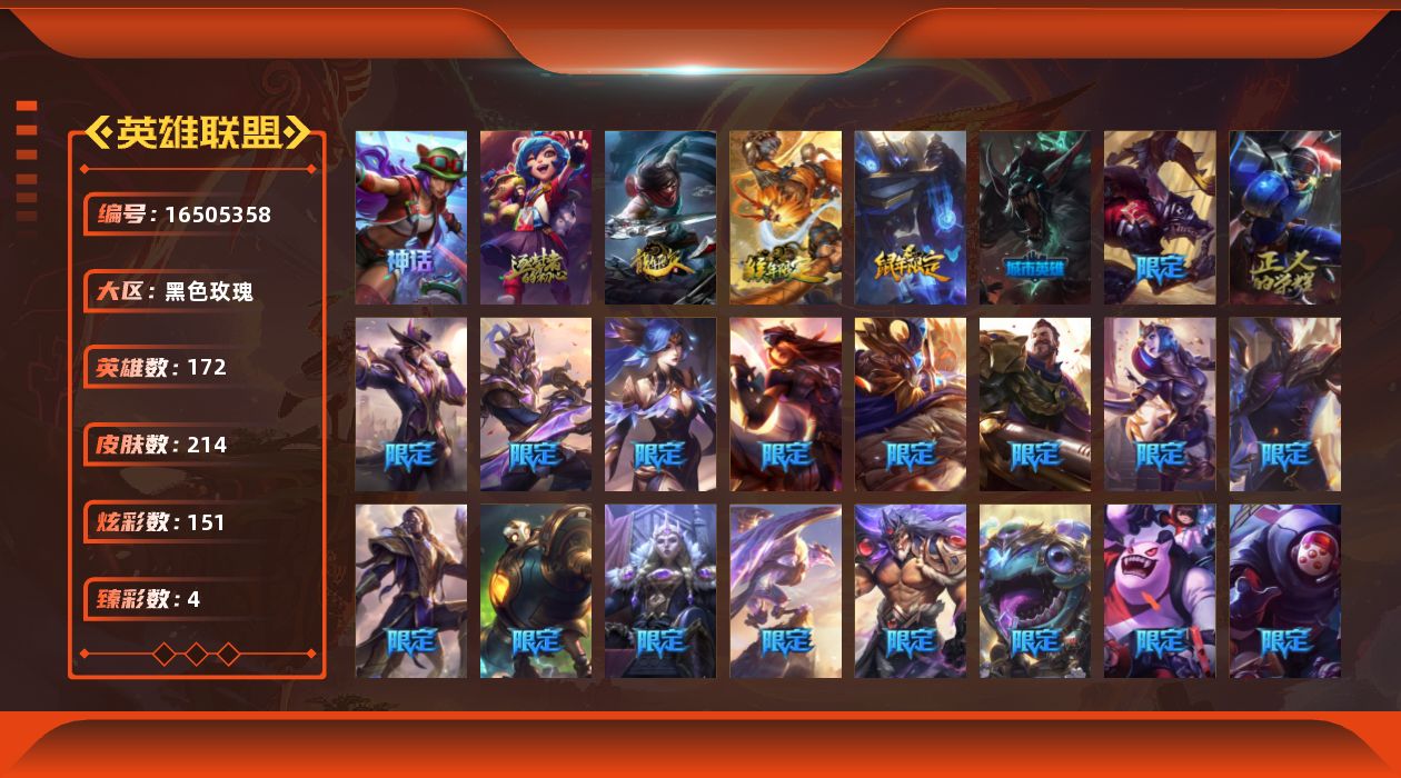 [16505358]【特价出售/店主推荐】铂金段位-172英雄-214皮肤-151炫彩-0终极-2神话-30限定-15传说-55史诗 【臻彩皮肤】:无畏骑士瑟庄妮赤子初心,星之守护者娑娜未来之光,星之守护者阿卡丽热情之光,水晶玫瑰迦娜甜蜜花蕾 【年限皮肤】:银龙裁决泰隆,美猴王孙悟空,王国机神玄武盖伦 【冰雪限定】:持胡萝卜的雪人易,夺命美人卡特琳娜,喜庆之树茂凯,寒冬精灵璐璐,冰雪节辛吉德 【神话皮肤】:十周年纪念安妮,十五周年纪念希维尔 【限定皮肤】:暗杀星努努和威朗普,sktt1贾克斯,sktt1薇恩,暗裔英雄盖伦,胜利女神希维尔,胜利之树茂凯,胜利呛神格雷福斯,胜利女神奥莉安娜,胜利之剑亚托克斯,胜利呛神卢锡安,胜利机器人布里茨,胜利女神瑟庄妮,胜利凤凰艾尼维亚,胜利之王泰达米尔,胜利巨口克格莫,胜利女神娑娜,胜利剑圣易,胜利之运崔斯特,暗影沃里克,都铎王朝图奇,防暴天使凯尔,海之歌永恩 【传说皮肤】:战地机甲厄加特,霸天零式赛恩,提莫约德尔人的一大步,约德尔国队长提莫,战斗学院凯特琳,丧尸布兰德,神拳李青,第三类接触黑默丁格,腥红之月鬼武姬阿卡丽,钢铁军团盖伦,黎明使者锐雯,黯黑魔龙希瓦娜,焰尾妖狐阿狸,星之守护者金克丝,暗星锤石 【史诗皮肤】:冰霜烈焰安妮,重生之沙费德提克,圣光审判凯尔,地狱火阿利斯塔,源代码索拉卡,黑帮狂花厄运小姐,女船长厄运小姐,刀锋女王莫甘娜,炼金狂士辛吉德,熔火之心拉莫斯,夜行义贼艾瑞莉娅,海克斯科技迦娜,寒冰女皇迦娜,星之守护者迦娜,恐惧新星普朗克,血石诅咒塔里克,古墓丽影凯特琳,铁血狙击手凯特琳,海贼魅影卡特琳娜,前线指挥官卡特琳娜,死亡绽放伊莉丝,腥红之月伊莉丝,三昧真火孙悟空,防弹武僧李青,地下拳王李青,生化博士黑默丁格,法老王朝内瑟斯,艳后奈德丽,血色之锤波比,飞车暴走族古拉加斯,刺客信条凯南,至高君王玛尔扎哈,血色精锐锐雯,深海怪鱼克格莫,战国大名慎,odst地狱伞兵拉克丝,海牛猎手菲兹,白色死神韦鲁斯,暗星韦鲁斯,源计划火菲奥娜,驯龙女巫璐璐,星之守护者璐璐,绞肉机刽子手德莱文,死亡绽放卡兹克,天启骑士杰斯,源代码丽桑卓,血羽凤凰奎因,勇敢的心奎因,西部牛仔亚索,源计划风亚索,源计划雷卢锡安,源计划阴劫,炼狱魔女蔚,上古战魂雷克塞,永恒之森巴德 【王者皮肤】:星空之门内瑟斯,霹雳游侠弗拉基米尔 【勇士皮肤】:亮丽女神希维尔 【其他皮