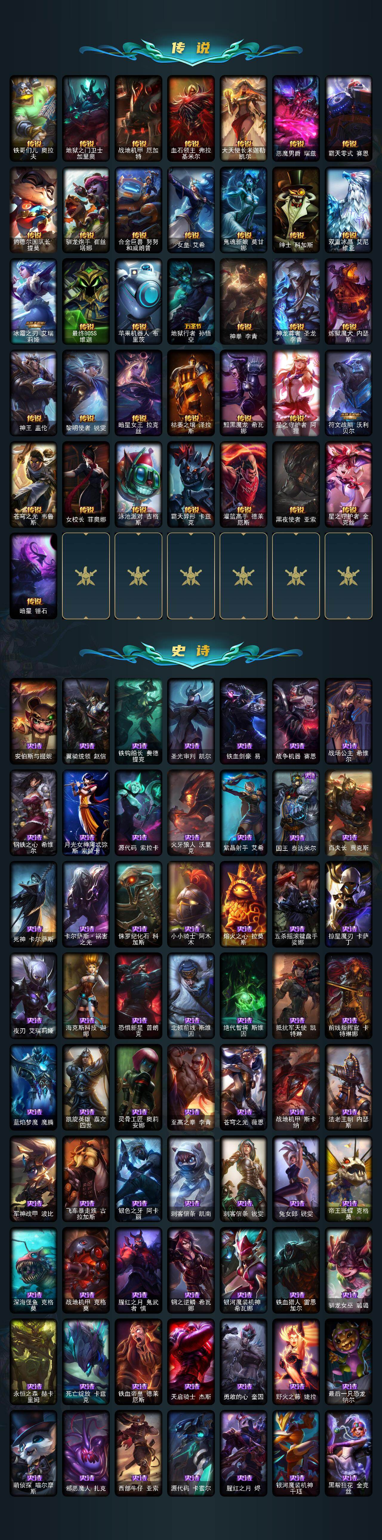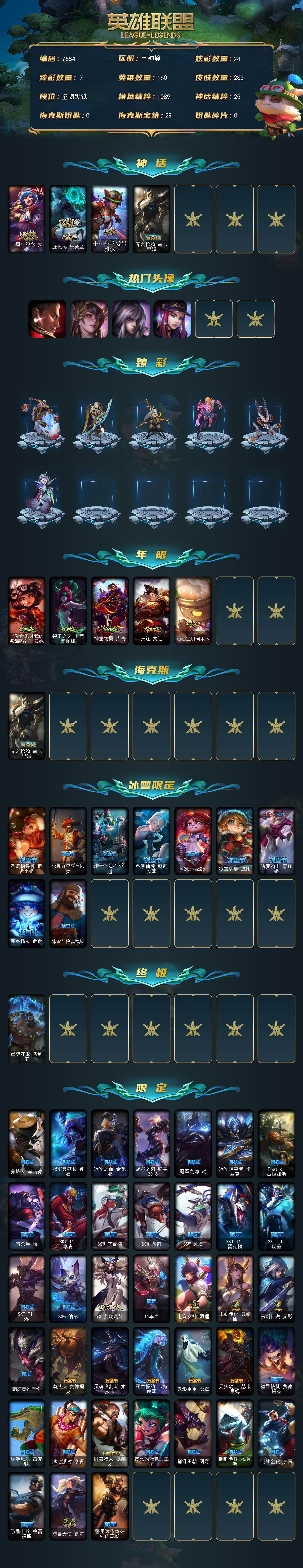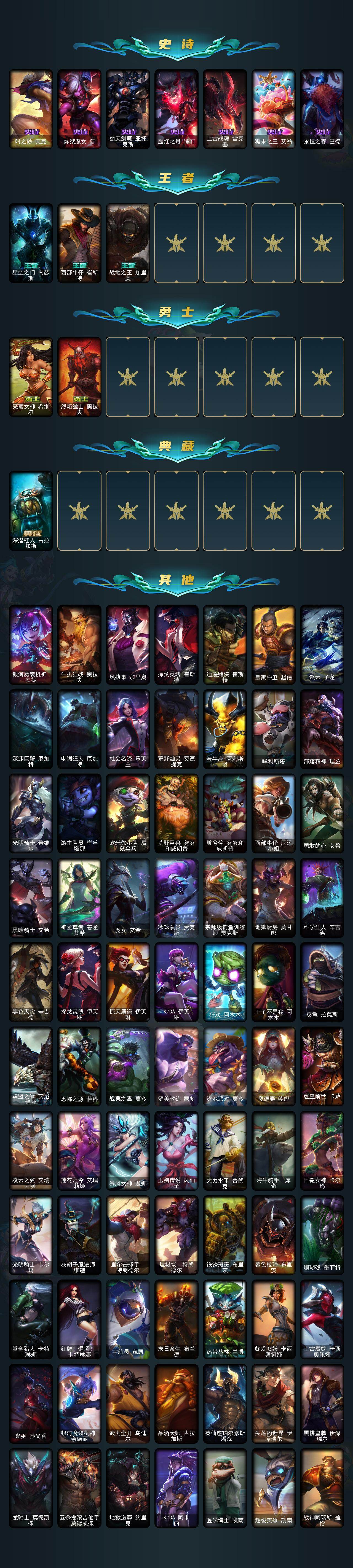 未定级段位-160英雄-282皮肤-24炫彩-1终极-4神话-52限定-36传说-70史诗 【神话皮肤】:十周年纪念安妮,源代码乐芙兰,十五周年纪念希维尔,零之呛骑赫卡里姆 【热门头像】:觅心游侠卢锡安头像,玉剑传说舞剑仙头像,玉剑传说无影头像,kda阿卡丽头像 【臻彩皮肤】:无畏骑士瑟庄妮赤子初心,冠军之箭艾希凯旋圣装,玉剑传说舞剑仙轩辕,神龙尊者圣龙李青登龙,霸天异形卡兹克刹那银光,魔女阿卡丽虚荣,净雪之月莫甘娜冬虹 【年限皮肤】:你看见过我的熊猫吗安妮,碧玉之牙卡西奥佩娅,神龙之翼库奇,张辽文远,点心宝贝阿木木 【海克斯皮肤】:零之呛骑赫卡里姆 【冰雪限定】:圣诞糖果棒厄运小姐,英勇玩具兵普朗克,邪恶圣诞老人维迦,冬季仙境奥莉安娜,圣诞玩偶波比,冰雪驯鹿波比,魄罗骑士瑟庄妮,寒冬精灵璐璐,冰雪节格雷福斯 【终极皮肤】:灵魂守卫乌迪尔 【限定皮肤】:养蜂人辛吉德,冠军典狱长锤石,冠军之血希瓦娜,冠军之刃锐雯2016,冠军之隐劫,冠军掠夺者卡兹克,fnatic古拉加斯,暗杀星慎,sktt1李青,ssw辛吉德,ssw图奇,ssw锤石,sktt1雷克顿,sktt1瑞兹,sktt1烬,ssg纳尔,ig艾瑞莉娅,t1李青,电玩女神阿狸,玉剑传说舞剑仙,玉剑传说无影,暗裔英雄盖伦,南瓜头费德提克,灵魂收割者索拉卡,死亡誓约卡特琳娜,鬼影重重魔腾,无头骑士赫卡里姆,糖果使徒费德提克,泳池派对雷克顿,泳池派对李青,野兽猎人德莱文,波比的巧克力工坊,都铎王朝图奇,制胜金球拉莫斯,制胜金靴李青,防暴士兵格雷福斯,防暴天使凯尔,警用试作体k9内瑟斯 【传说皮肤】:铁哥们儿奥拉夫,地狱之门卫士加里奥,战地机甲厄加特,血石领主弗拉基米尔,大天使长米迦勒凯尔,恶魔男爵瑞兹,霸天零式赛恩,约德尔国队长提莫,驯龙炮手崔丝塔娜,合金巨兽努努和威朗普,女皇艾希,鬼魂新娘莫甘娜,绅士科加斯,双重冰晶艾尼维亚,冰霜之刃艾瑞莉娅,最终boss维迦,苹果机器人布里茨,地狱行者孙悟空,神拳李青,神龙尊者圣龙李青,炼狱魔犬内瑟斯,神王盖伦,黎明使者锐雯,暗星女王拉克丝,枯萎之壤泽拉斯,黯黑魔龙希瓦娜,星之守护者阿狸,符文战熊沃利贝尔,苍穹之光韦鲁斯,女校长菲奥娜,泳池派对吉格斯,霸天异形卡兹克,灌篮高手德莱厄斯,黑夜使者亚索,星之守护者金克丝,暗星锤石 【史诗皮肤】:安伯斯与提妮,翼骑统领赵信,铁钩船长费德提克,圣光审判凯尔,铁血剑豪易,战争机器赛恩,战场公主希维尔,钢铁之心希维尔,月光女神阿忒弥斯索拉卡,源代码索拉卡,火牙狼人沃里克,紫晶射手艾希,国王泰达米尔,百夫长贾克斯,死神卡尔萨斯,卡尔萨斯祸害之光,侏罗纪化石科加斯,小小骑士阿木木,熔火之心拉莫斯,五杀摇滚键盘手娑娜,掠星魔刃卡萨丁,夜刃艾瑞莉娅,海克斯科技迦娜,恐惧新星普朗克,北领前线斯维因,绝代智将斯维因,抵抗军天使凯特琳,前线指挥官卡特琳娜,蓝焰梦魔魔腾,凯旋英雄嘉文四世,灵骨工匠奥莉安娜,至高之拳李青,苍穹之光薇恩,战地机甲斯卡纳,法老王朝内瑟斯,军神战甲波比,飞车暴走族古拉加斯,银色之牙阿卡丽,刺客信条凯南,刺客信条锐雯,兔女郎锐雯,帝王斑蝶克格莫,深海怪鱼克格莫,战地机甲克格莫,腥红之月鬼武者慎,钢之逆鳞希瓦娜,银河魔装机神希瓦娜,铁血猎人雷恩加尔,驯龙女巫璐璐,永恒之森赫卡里姆,死亡绽放卡兹克,铁血帝皇德莱厄斯,天启骑士杰斯,勇敢的心奎因,野火之藤婕拉,最后一只恐龙纳尔,萌侦探喵尔摩斯,邪恶魔人扎克,西部牛仔亚索,源代码卡蜜尔,腥红之月烬,银河魔装机神千珏,黑帮狂花金克丝,时之砂艾克,炼狱魔女蔚,霸天剑魔亚托克斯,腥红之月锤石,上古战魂雷克塞,糖果之王艾翁,永恒之森巴德 【王者皮肤】:星空之门内瑟斯,西部牛仔崔斯特,战地之王加里奥 【勇士皮肤】:亮丽女神希维尔,烈焰猛士奥拉夫 【典藏皮肤】:深潜蛙人古拉加斯 【其他皮肤1】:银河魔装机神安妮,牛扒狂战奥拉夫,风执事加里奥,探戈灵魂崔斯特,赌侠崔斯特,皇家守卫赵信,赵云子龙,深渊巨蟹厄加特,电锯狂人厄加特,社会名流乐芙兰,荒野幽灵费德提克,金牛座阿利斯塔,哞利斯塔,部落精神瑞兹,光明骑士希维尔,游击队员崔丝塔娜,欧米伽小队魔鬼伞兵,荒野巨兽努努和威朗普,脏兮兮努努和威朗普,西部牛仔厄运小姐,勇敢的心艾希,黑暗骑士艾希,神龙尊者苍龙艾希,魔女艾希,冰球队员贾克斯,宗师级钓鱼训练师贾克斯,地狱厨房莫甘娜,科学狂人辛吉德,黑色天灾辛吉德,探戈灵魂伊芙琳,惊天魔盗伊芙琳,kda伊芙琳,狂欢阿木木,王子不是我阿木木,忍龟拉莫斯,联盟之喙艾尼维亚,恐怖之源萨科,战栗之毒蒙多,健美教练蒙多,泳池派对蒙多,奥德赛娑娜,虚空前世卡萨丁,凌云之翼艾瑞莉娅,莲花之令艾瑞莉娅,暴风女神迦娜,玉剑传说风仙子,大力水手普朗克,海牛骑手库奇,日冕女神卡尔玛,光明骑士卡尔玛,灰胡子魔法师维迦,里尔击球手特朗德尔,垃圾场特朗德尔,铁锈斑斑布里茨,暮色呛骑布里茨,珊瑚礁墨菲特,赏金猎人卡特琳娜,红牌退场卡特琳娜,宇航员茂凯,末日余生布兰德,热带丛林兰博,蛇发女妖卡西奥佩娅,上古魔蛇卡西奥佩娅,枭姬孙尚香,银河魔装机神奈德丽,武力全开乌迪尔,品酒大师古拉加斯,英仙座珀尔修斯潘森,失落的世界伊泽瑞尔,黑桃皇牌伊泽瑞尔,龙骑士莫德凯撒,五杀摇滚吉他手莫德凯撒,地狱送葬约里克,kda阿卡丽,医学博士凯南,超级英雄凯南,战神阿瑞斯盖伦,暗影王子玛尔扎哈,魔灵玛尔扎哈