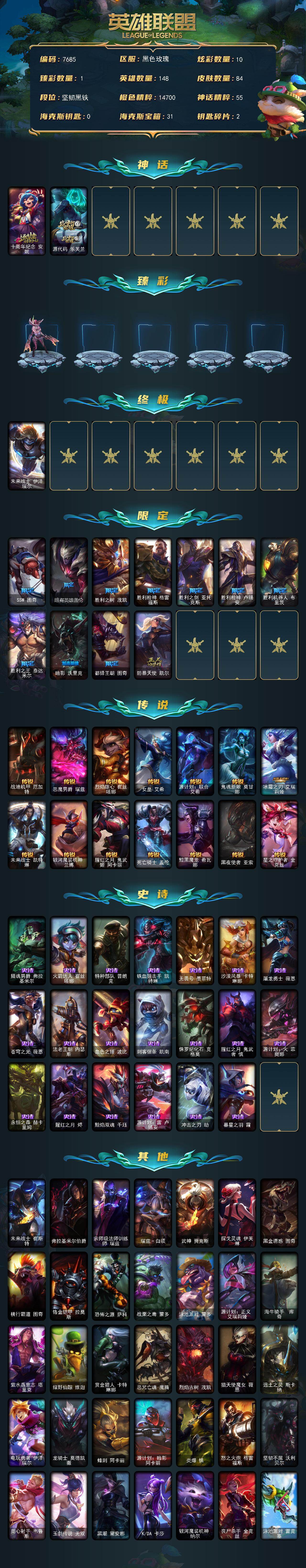 【皇冠号】未定级段位-148英雄-84皮肤-10炫彩-1终极-2神话-11限定-14传说-20史诗 【神话皮肤】:十周年纪念安妮,源代码乐芙兰 【臻彩皮肤】:破败军团厄运小姐灵岛征伐使 【终极皮肤】:未来战士伊泽瑞尔 【限定皮肤】:ssw图奇,暗裔英雄盖伦,胜利之树茂凯,胜利呛神格雷福斯,胜利之剑亚托克斯,胜利呛神卢锡安,胜利机器人布里茨,胜利之王泰达米尔,暗影沃里克,都铎王朝图奇,防暴天使凯尔 【传说皮肤】:战地机甲厄加特,恶魔男爵瑞兹,烈焰雄心崔丝塔娜,女皇艾希,源计划联合艾希,鬼魂新娘莫甘娜,冰霜之刃艾瑞莉娅,未来战士凯特琳,银河魔装机神兰博,腥红之月鬼武姬阿卡丽,死亡骑士盖伦,黯黑魔龙希瓦娜,黑夜使者亚索,星之守护者金克丝 【史诗皮肤】:摄魂男爵弗拉基米尔,火箭达人崔丝塔娜,特种部队普朗克,铁血狙击手凯特琳,无畏号墨菲特,沙漠风暴卡特琳娜,屠龙勇士薇恩,苍穹之光薇恩,法老王朝内瑟斯,血色之锤波比,刺客信条凯南,侏罗纪化石克格莫,腥红之月鬼武者慎,源计划火菲奥娜,永恒之森赫卡里姆,腥红之月烬,黯焰双魂千珏,源计划雷卢锡安,冲击之刃劫,暮星之羽霞 【其他皮肤1】:未来战士崔斯特,弗拉基米尔伯爵,宗师级法师训练师瑞兹,瑞兹白须,武神贾克斯,探戈灵魂伊芙琳,黑金诱惑图奇,横行霸道图奇,铬金铠甲拉莫斯,恐怖之源萨科,战栗之毒蒙多,泳池派对蒙多,源计划正义艾瑞莉娅,海牛骑手库奇,紫水晶意志塔里克,绿野仙踪维迦,赏金猎人卡特琳娜,恶咒亡魂魔腾,烈焰古树茂凯,猎天使魔女薇恩,远土之灵斯卡纳,电玩勇者伊泽瑞尔,龙骑士莫德凯撒,蜂刺阿卡丽,源计划暗影阿卡丽,炎爆慎,怒之火炮格雷福斯,坚韧不屈沃利贝尔,觅心射手韦鲁斯,玉剑传说无双,黑潮黛安娜,kda卡莎,银河魔装机神纳尔,丧尸杀手金克丝,泳池派对雷克塞,永恒之森霞