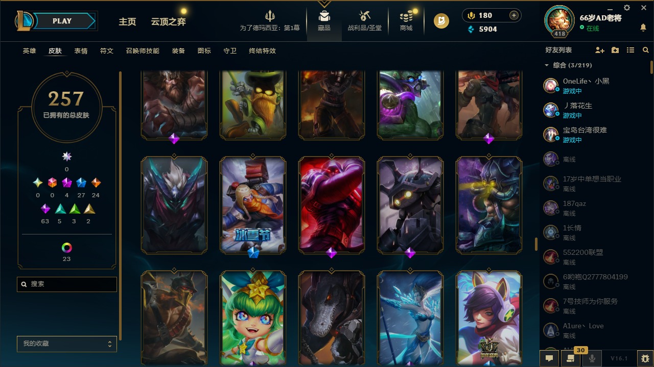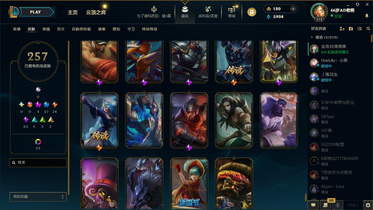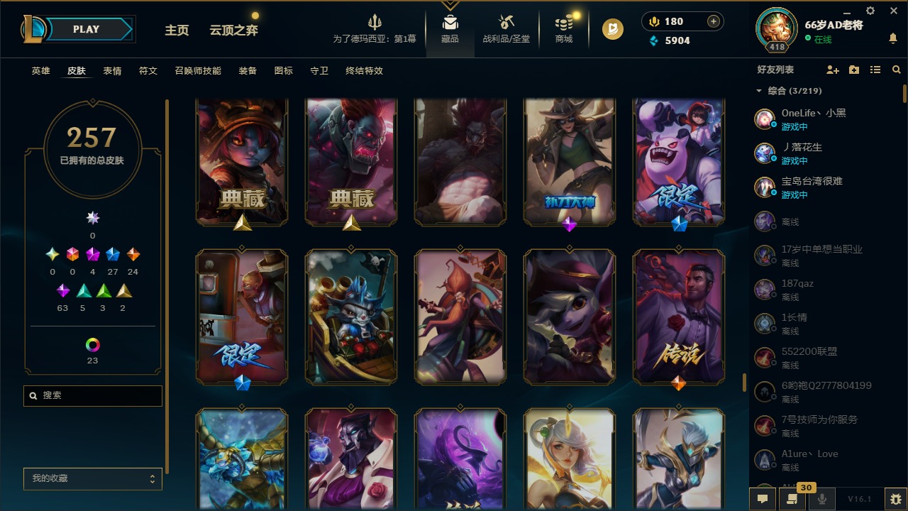 [16507838]4神话 27限定 24传说 63史诗 257皮肤 27炫彩 166英雄 可二次 可修改实名 【至臻】至臻 k/da 阿狸 【海克斯】海克斯 克格莫 【赛季限定皮】胜利之剑 亚托克斯 【冠军限定系列】s2 暗杀星 蒙多s2 暗杀星 努努s4 ssw 图奇 【冰雪节限定】冰雪风暴 希维尔冰雪节 辛吉德冰雪兽 纳尔胡桃夹子 萨科平安夜女神 娑娜 【泳池派对】泳池派对 吉格斯泳池派对 凯特琳 【万圣节限定】鬼影森森 茂凯克烈古拉伯爵魅惑女巫 奈德丽死亡誓约 维克托 【年限】定海神针 孙悟空紫金罗刹 莫甘娜春晖神女 拉克丝 【周年】5周年 阿狸10周年 安妮 【其他限定/神话皮】源代码 乐芙兰防暴天使 凯尔暗影 沃里克都铎王朝 图奇防暴机器人 布里茨防暴士兵 辛吉德惊悚派对 阿木木野兽猎人 德莱文野兽猎人 瑟庄妮勇者 阿狸