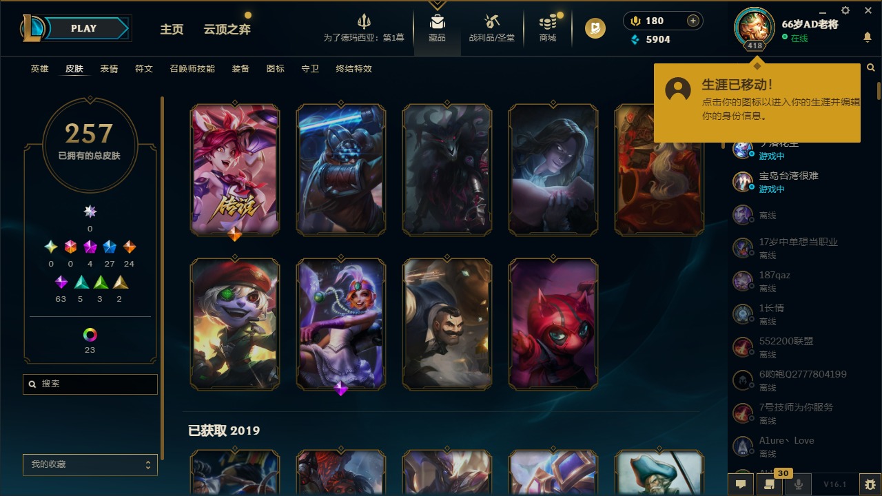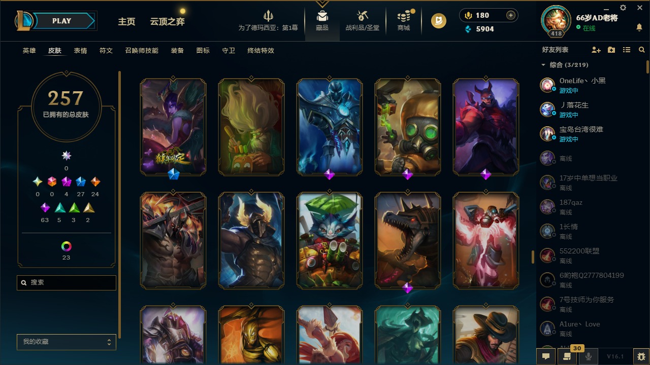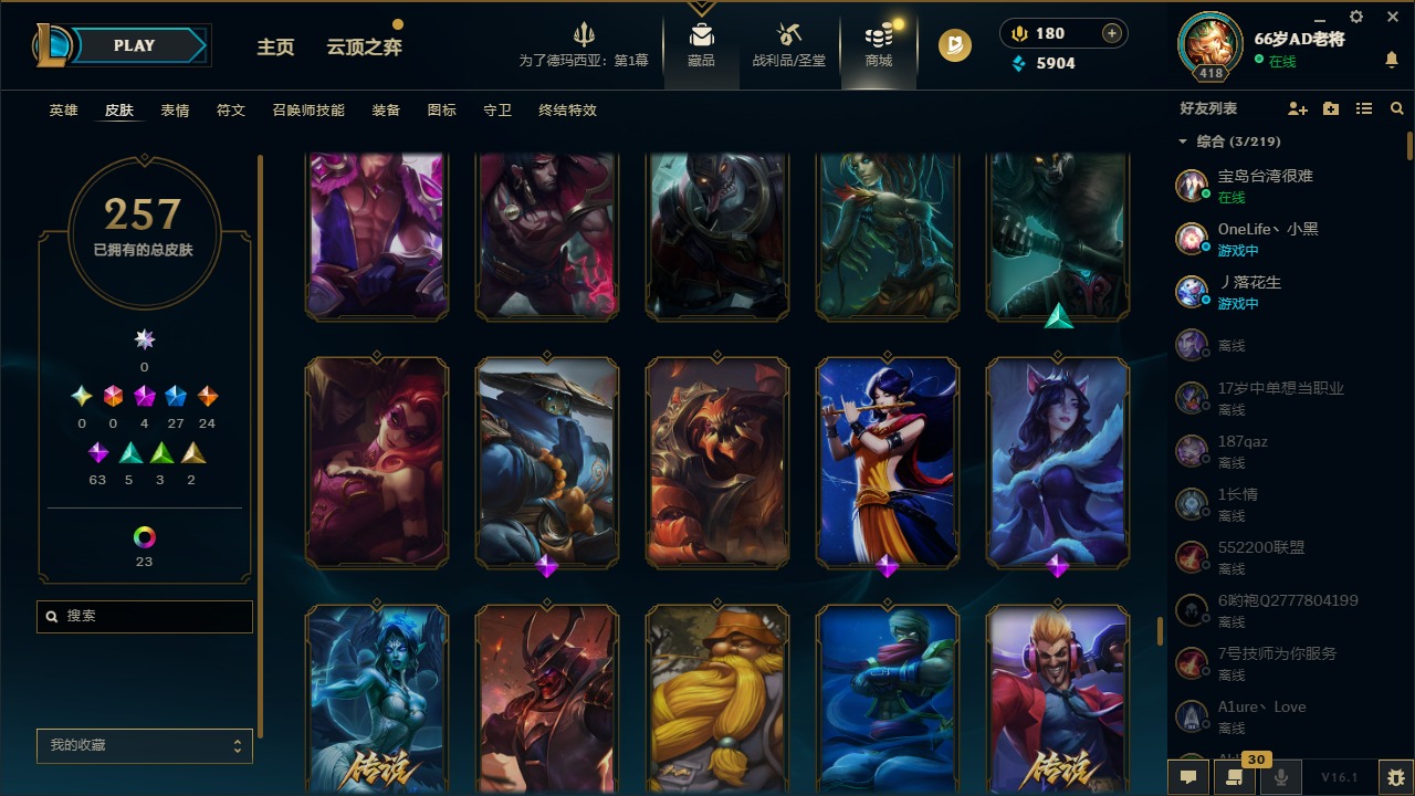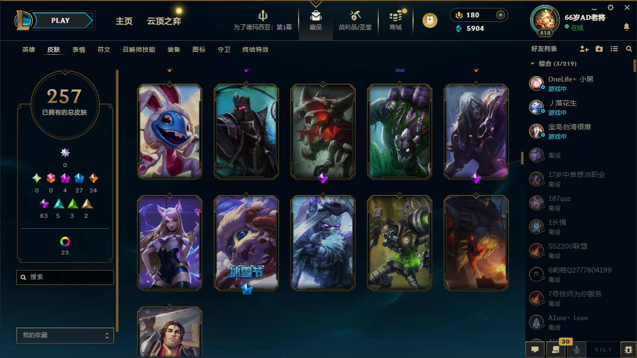 [16507838]4神话 27限定 24传说 63史诗 257皮肤 27炫彩 166英雄 可二次 可修改实名 【至臻】至臻 k/da 阿狸 【海克斯】海克斯 克格莫 【赛季限定皮】胜利之剑 亚托克斯 【冠军限定系列】s2 暗杀星 蒙多s2 暗杀星 努努s4 ssw 图奇 【冰雪节限定】冰雪风暴 希维尔冰雪节 辛吉德冰雪兽 纳尔胡桃夹子 萨科平安夜女神 娑娜 【泳池派对】泳池派对 吉格斯泳池派对 凯特琳 【万圣节限定】鬼影森森 茂凯克烈古拉伯爵魅惑女巫 奈德丽死亡誓约 维克托 【年限】定海神针 孙悟空紫金罗刹 莫甘娜春晖神女 拉克丝 【周年】5周年 阿狸10周年 安妮 【其他限定/神话皮】源代码 乐芙兰防暴天使 凯尔暗影 沃里克都铎王朝 图奇防暴机器人 布里茨防暴士兵 辛吉德惊悚派对 阿木木野兽猎人 德莱文野兽猎人 瑟庄妮勇者 阿狸