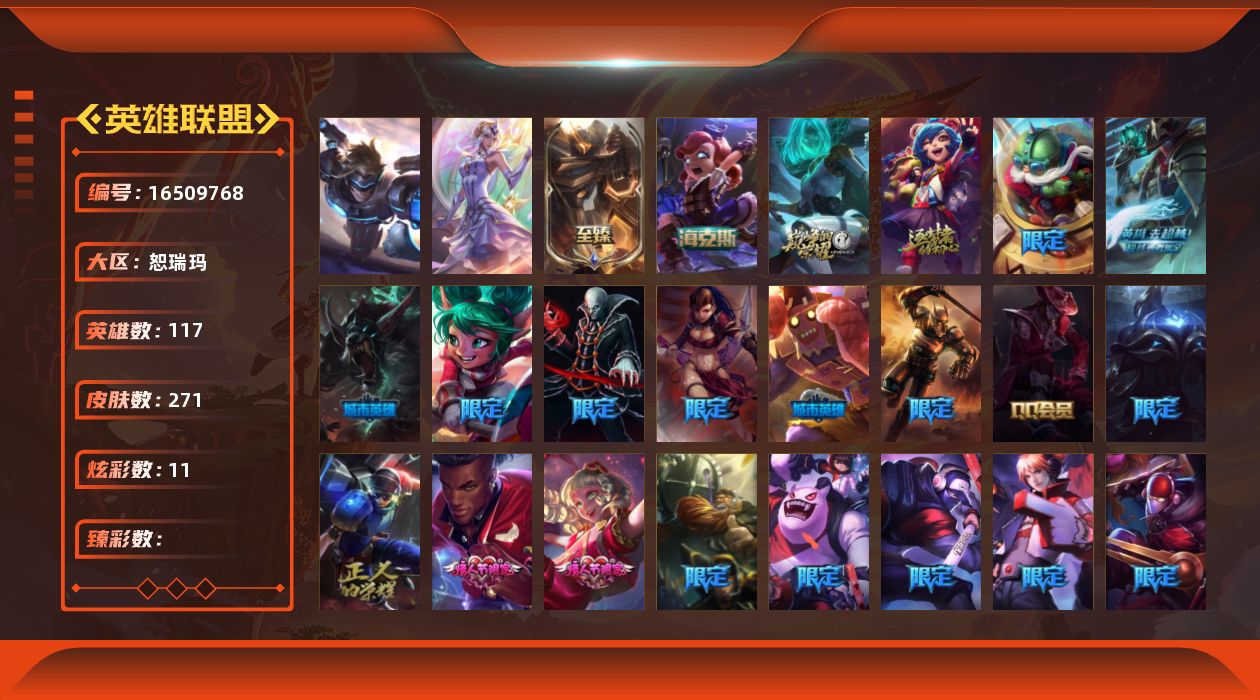 [16509768]2终极 4神话 33限定 16传说 85史诗 271皮肤 11炫彩 117英雄 可二次 可修改实名 【至臻】:至臻 王国机神玄武 盖伦 【海克斯】:海克斯 安妮 【情人节限定】:觅心游侠 卢锡安甜心宝贝 安妮 【冠军限定系列】:s1fnc 酒桶s2 暗杀星 努努s2 暗杀星 慎s2 暗杀星 伊泽瑞尔s3 skt t1 劫s4 ssw 泰隆s4 ssw 炼金 【冰雪节限定】:阿木木:“主人不要我了”冰雪节 辛吉德胡桃夹子 萨科平安夜女神 娑娜魄罗骑士 瑟庄妮圣诞精灵 崔丝塔娜圣诞狂欢 努努和威朗普圣诞糖果棒 厄运小姐圣诞玩偶 波比幸福女神 乐芙兰雪默丁格 【泳池派对】:泳池派对 蕾欧娜 【万圣节限定】:无头骑士 赫卡里姆 【周年】:10周年 安妮 【其他限定/神话皮】:外星装甲 库奇源代码 乐芙兰防暴天使 凯尔暗影 沃里克波比的巧克力工坊地底世界 崔斯特冠军之隐 劫红桃杰克 崔斯特警用试作体k-9 内瑟斯蒙多蒙多女猎手 希维尔诺斯费拉图 弗拉基米尔
