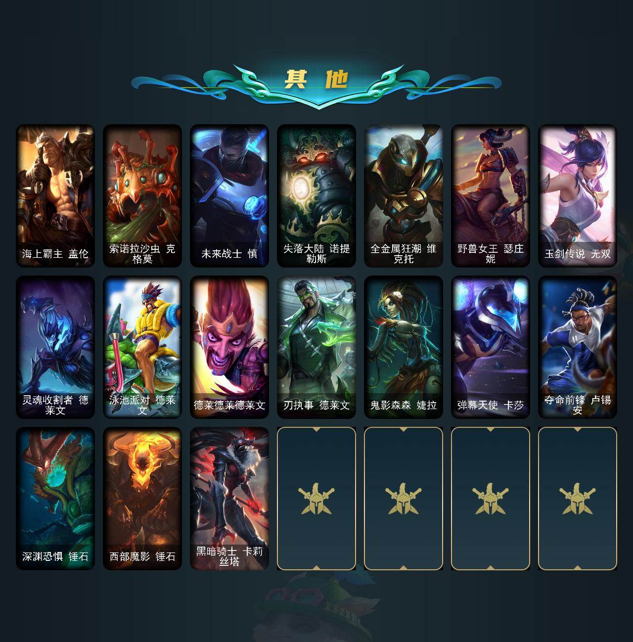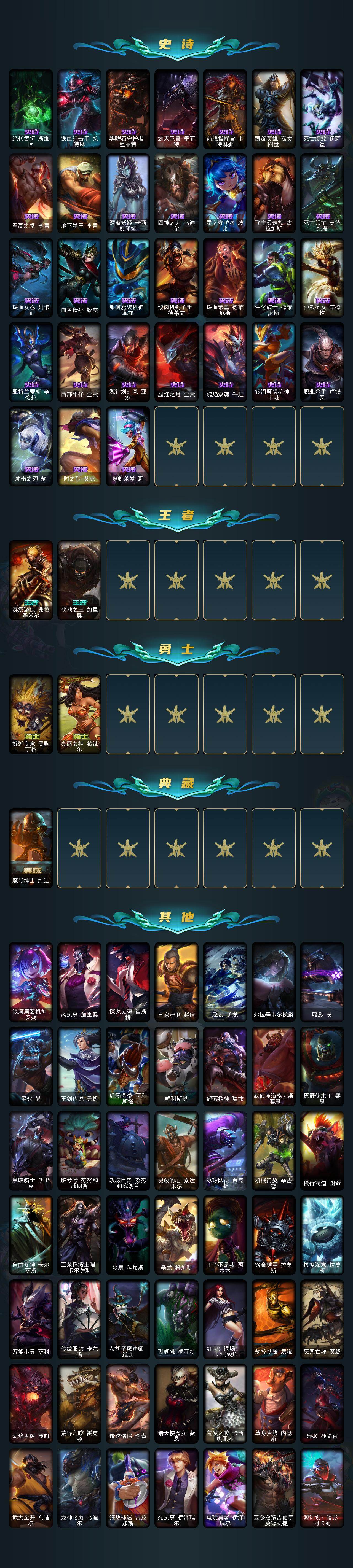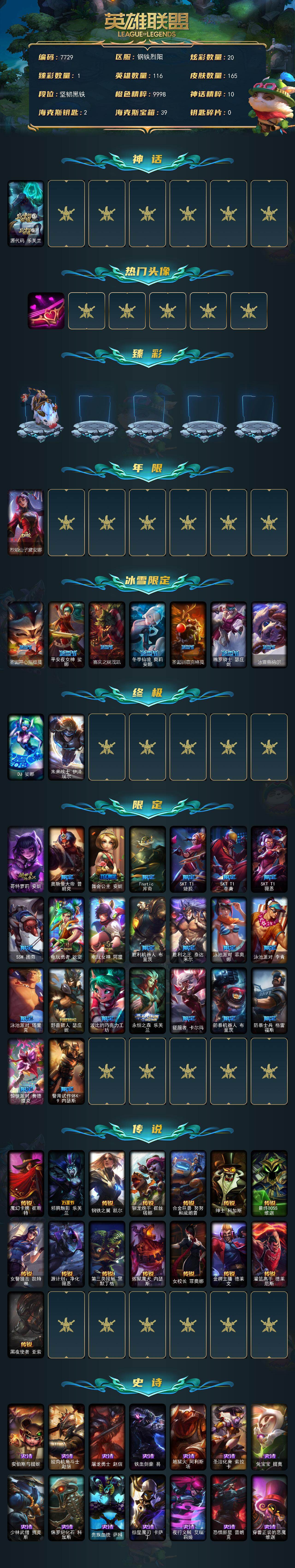 未定级段位-116英雄-165皮肤-20炫彩-2终极-1神话-31限定-15传说-45史诗 【神话皮肤】:源代码乐芙兰 【热门头像】:爱情之歌头像 【臻彩皮肤】:无畏骑士瑟庄妮赤子初心 【年限皮肤】:烈焰仙子黛安娜 【冰雪限定】:圣诞开心鬼提莫,平安夜女神娑娜,喜庆之树茂凯,冬季仙境奥莉安娜,圣诞驯鹿克格莫,魄罗骑士瑟庄妮,冰雪兽纳尔 【终极皮肤】:dj娑娜,未来战士伊泽瑞尔 【限定皮肤】:哥特萝莉安妮,奥斯曼大帝普朗克,舞会公主安妮,fnatic库奇,sktt1婕拉,sktt1李青,sktt1薇恩,ssw图奇,电玩勇者锐雯,电玩女神阿狸,胜利机器人布里茨,胜利之王泰达米尔,泳池派对菲奥娜,泳池派对李青,泳池派对塔里克,野兽猎人瑟庄妮,波比的巧克力工坊,永恒之森乐芙兰,征服者卡尔玛,防暴机器人布里茨,防暴士兵格雷福斯,惊悚派对费德提克,警用试作体k9内瑟斯 【传说皮肤】:魔幻卡牌崔斯特,邪鸦魅影乐芙兰,钢铁之翼凯尔,驯龙炮手崔丝塔娜,合金巨兽努努和威朗普,绅士科加斯,最终boss维迦,女警狙击凯特琳,源计划净化薇恩,第三类接触黑默丁格,炼狱魔犬内瑟斯,女校长菲奥娜,金牌主播德莱文,灌篮高手德莱厄斯,黑夜使者亚索 【史诗皮肤】:安伯斯与提妮,绞肉机角斗士赵信,屠龙勇士赵信,铁血剑豪易,地狱火阿利斯塔,圣洁化身索拉卡,兔宝宝提莫,少林武僧贾克斯,侏罗纪化石科加斯,贵族血统萨科,掠星魔刃卡萨丁,夜行义贼艾瑞莉娅,恐惧新星普朗克,穿着正装的恶魔维迦,绝代智将斯维因,铁血狙击手凯特琳,黑曜石守护者墨菲特,霸天巨兽墨菲特,前线指挥官卡特琳娜,凯旋英雄嘉文四世,死亡绽放伊莉丝,至高之拳李青,地下拳王李青,深海妖姬卡西奥佩娅,四神之力乌迪尔,星之守护者波比,飞车暴走族古拉加斯,死亡领主莫德凯撒,铁血女忍阿卡丽,血色精锐锐雯,银河魔装机神菲兹,绞肉机刽子手德莱文,铁血帝皇德莱厄斯,生化骑士德莱厄斯,仲裁圣女辛德拉,亚特兰蒂斯辛德拉,西部牛仔亚索,源计划风亚索,腥红之月亚索,黯焰双魂千珏,银河魔装机神千珏,职业杀手卢锡安,冲击之刃劫,时之砂艾克,霓虹杀拳蔚 【王者皮肤】:霹雳游侠弗拉基米尔,战地之王加里奥 【勇士皮肤】:拆弹专家黑默丁格,亮丽女神希维尔 【典藏皮肤】:魔导绅士维迦 【其他皮肤1】:银河魔装机神安妮,风执事加里奥,探戈灵魂崔斯特,皇家守卫赵信,赵云子龙,弗拉基米尔侯爵,暗影易,星战易,玉剑传说无极,后场堡垒阿利斯塔,哞利斯塔,部落精神瑞兹,武仙座海格力斯赛恩,原野伐木工赛恩,黑暗骑士沃里克,脏兮兮努努和威朗普,攻城巨兽努努和威朗普,勇敢的心泰达米尔,冰球队员贾克斯,机械污染辛吉德,横行霸道图奇,自由女神卡尔萨斯,五杀摇滚主唱卡尔萨斯,梦魇科加斯,暴龙科加斯,王子不是我阿木木,铬金铠甲拉莫斯,极度深寒拉莫斯,万能小丑萨科,传统服饰卡尔玛,灰胡子魔法师维迦,珊瑚礁墨菲特,红牌退场卡特琳娜,劫掠梦魇魔腾,恶咒亡魂魔腾,烈焰古树茂凯,荒野之咬雷克顿,传统僧侣李青,猎天使魔女薇恩,荒漠之咬卡西奥佩娅,单身贵族内瑟斯,枭姬孙尚香,武力全开乌迪尔,龙神之力乌迪尔,狂热球迷古拉加斯,光执事伊泽瑞尔,电玩勇者伊泽瑞尔,五杀摇滚吉他手莫德凯撒,源计划暗影阿卡丽,海上霸主盖伦,索诺拉沙虫克格莫,未来战士慎,失落大陆诺提勒斯,全金属狂潮维克托,野兽女王瑟庄妮,玉剑传说无双,灵魂收割者德莱文,泳池派对德莱文,德莱德莱德莱文,刃执事德莱文,鬼影森森婕拉,弹幕天使卡莎,夺命前锋卢锡安,深渊恐惧锤石,西部魔影锤石,黑暗骑士卡莉丝塔