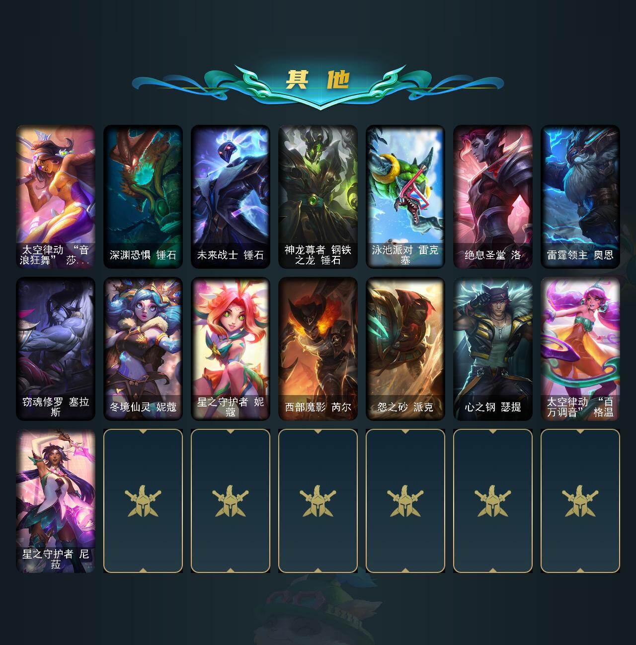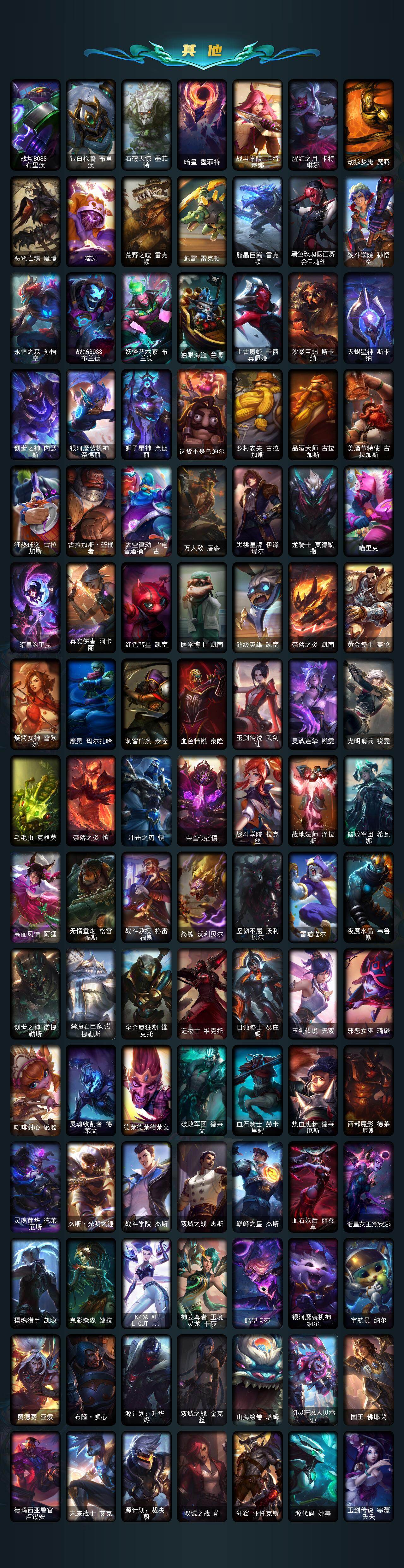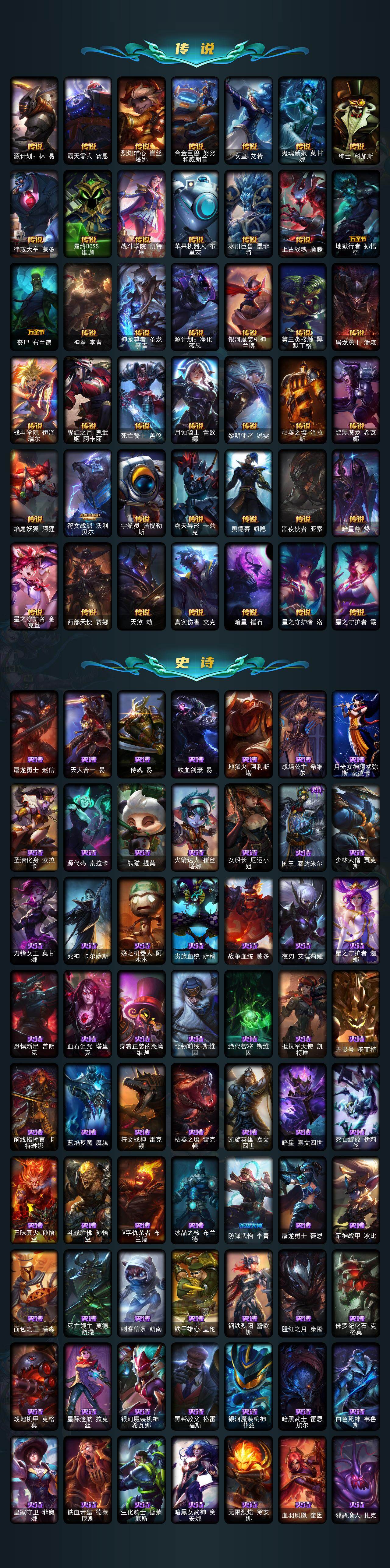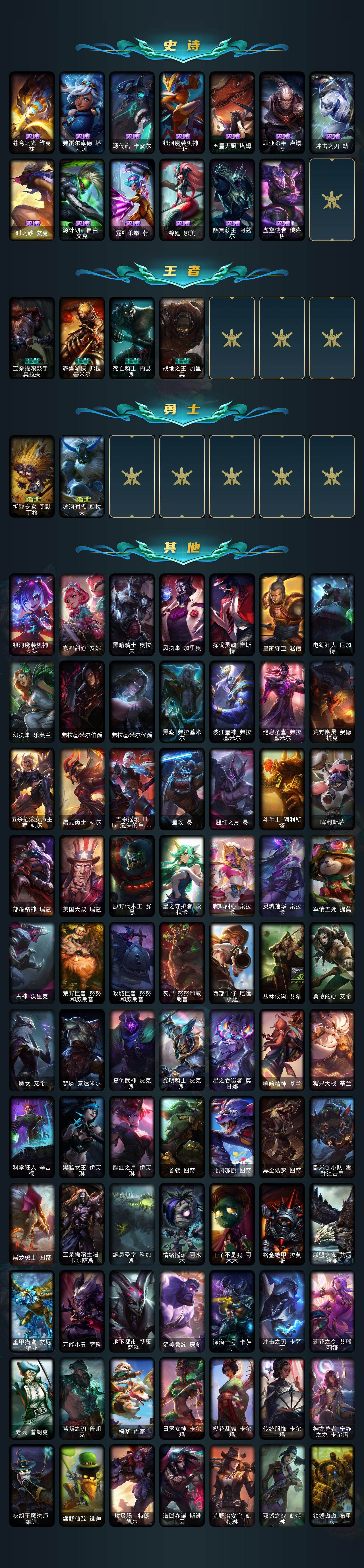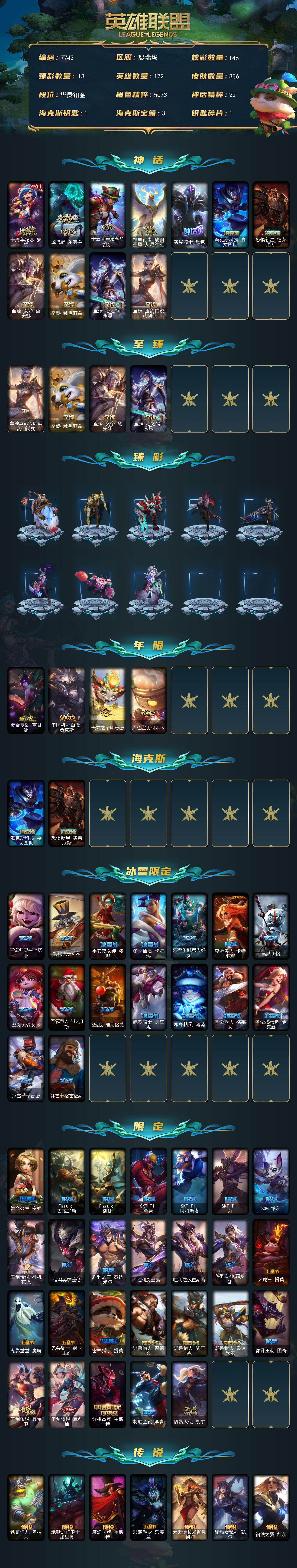 铂金段位-172英雄-386皮肤-146炫彩-0终极-11神话-47限定-49传说-76史诗 【神话皮肤】:十周年纪念安妮,源代码乐芙兰,十五周年纪念希维尔,神凰行者瑞羽圣凰艾尼维亚,灰烬骑士派克,海克斯科技嘉文四世,恐惧新星德莱厄斯,至臻女帝黛安娜,至臻绒毛菲兹,至臻心之钢永恩,至臻玉剑传说武剑仙 【至臻皮肤】:至臻玉剑传说武剑仙锐雯,至臻绒毛菲兹,至臻女帝黛安娜,至臻心之钢永恩 【臻彩皮肤】:天龙之子卡莎飞龙乘云,无畏骑士瑟庄妮赤子初心,冠军之隐劫凯旋圣装,霸天战士雷恩加尔星啸天火,西部魔影卢锡安贝利尔之怠,西部天使赛娜神选天使长,星之守护者奥莉安娜未来之光,星之守护者金克丝黑洞,灵魂莲华亚索霜见之时,可爱可爱粉红红布里茨,魔女阿卡丽虚荣,净雪之月莫甘娜冬虹,心之钢伊泽瑞尔锐意曲风 【年限皮肤】:紫金罗刹莫甘娜,王国机神白虎贾克斯,天龙之子斯莫德,点心宝贝阿木木 【海克斯皮肤】:海克斯科技嘉文四世,恐惧新星德莱厄斯 【冰雪限定】:圣诞精灵崔丝塔娜,胡桃夹子萨科,平安夜女神娑娜,冬季仙境卡尔玛,邪恶圣诞老人维迦,夺命美人卡特琳娜,雪默丁格,圣诞玩偶波比,圣诞老人古拉加斯,圣诞驯鹿克格莫,魄罗骑士瑟庄妮,寒冬精灵璐璐,圣诞老人德莱文,圣诞捣蛋鬼金克丝,冰雪节辛吉德,冰雪节格雷福斯 【限定皮肤】:舞会公主安妮,fnatic古拉加斯,fnatic迦娜,sktt1李青,sktt1阿利斯塔,sktt1烬,ssg纳尔,玉剑传说神机花火,暗裔英雄盖伦,胜利之王泰达米尔,胜利剑圣易,胜利之运崔斯特,胜利女神菲奥娜,大魔王提莫,鬼影重重魔腾,无头骑士赫卡里姆,密林猎手提莫,野兽猎人德莱文,野兽猎人瑟庄妮,野兽猎人泰达米尔,都铎王朝图奇,玉剑传说舞龙卫,玉剑传说翼剑仙,红桃杰克崔斯特,制胜金靴李青,防暴天使凯尔 【传说皮肤】:铁哥们儿奥拉夫,地狱之门卫士加里奥,魔幻卡牌崔斯特,邪鸦魅影乐芙兰,大天使长米迦勒凯尔,战场女武神凯尔,钢铁之翼凯尔,源计划林易,霸天零式赛恩,烈焰雄心崔丝塔娜,合金巨兽努努和威朗普,女皇艾希,鬼魂新娘莫甘娜,绅士科加斯,律政大亨蒙多,最终boss维迦,战斗学院凯特琳,苹果机器人布里茨,冰川巨兽墨菲特,上古战魂魔腾,地狱行者孙悟空,丧尸布兰德,神拳李青,神龙尊者圣龙李青,源计划净化薇恩,银河魔装机神兰博,第三类接触黑默丁格,屠龙勇士潘森,战斗学院伊泽瑞尔,腥红之月鬼武姬阿卡丽,死亡骑士盖伦,月蚀骑士蕾欧娜,黎明使者锐雯,枯萎之壤泽拉斯,黯黑魔龙希瓦娜,焰尾妖狐阿狸,符文战熊沃利贝尔,宇航员诺提勒斯,霸天异形卡兹克,奥德赛凯隐,黑夜使者亚索,暗星尊烬,星之守护者金克丝,西部天使赛娜,天煞劫,真实伤害艾克,暗星锤石,星之守护者洛,星之守护者霞 【史诗皮肤】:屠龙勇士赵信,天人合一易,侍魂易,铁血剑豪易,地狱火阿利斯塔,战场公主希维尔,月光女神阿忒弥斯索拉卡,圣洁化身索拉卡,源代码索拉卡,熊猫提莫,火箭达人崔丝塔娜,女船长厄运小姐,国王泰达米尔,少林武僧贾克斯,刀锋女王莫甘娜,死神卡尔萨斯,殇之机器人阿木木,贵族血统萨科,战争血统蒙多,夜刃艾瑞莉娅,星之守护者迦娜,恐惧新星普朗克,血石诅咒塔里克,穿着正装的恶魔维迦,北领前线斯维因,绝代智将斯维因,抵抗军天使凯特琳,无畏号墨菲特,前线指挥官卡特琳娜,蓝焰梦魔魔腾,符文战神雷克顿,枯萎之壤雷克顿,凯旋英雄嘉文四世,暗星嘉文四世,死亡绽放伊莉丝,三昧真火孙悟空,斗战胜佛孙悟空,v字仇杀者布兰德,冰晶之核布兰德,防弹武僧李青,屠龙勇士薇恩,军神战甲波比,面包之王潘森,死亡领主莫德凯撒,刺客信条凯南,铁甲雄心盖伦,钢铁烈阳蕾欧娜,腥红之月泰隆,侏罗纪化石克格莫,战地机甲克格莫,星际迷航拉克丝,银河魔装机神希瓦娜,黑帮教父格雷福斯,银河魔装机神菲兹,暗黑武士雷恩加尔,白色死神韦鲁斯,皇家守卫菲奥娜,铁血帝皇德莱厄斯,生化骑士德莱厄斯,暗黑女武神黛安娜,无限烈焰黛安娜,血羽凤凰奎因,邪恶魔人扎克,苍穹之光维克兹,弗雷尔卓德塔莉垭,源代码卡蜜尔,银河魔装机神千珏,五星大厨塔姆,职业杀手卢锡安,冲击之刃劫,时之砂艾克,源计划自由艾克,霓虹杀拳蔚,锦鲤娜美,幽冥领主阿兹尔,虚空使者俄洛伊 【王者皮肤】:五杀摇滚鼓手奥拉夫,霹雳游侠弗拉基米尔,死亡骑士内瑟斯,战地之王加里奥 【勇士皮肤】:拆弹专家黑默丁格,冰河时代奥拉夫 【其他皮肤1】:银河魔装机神安妮,咖啡甜心安妮,黑暗骑士奥拉夫,风执事加里奥,探戈灵魂崔斯特,皇家守卫赵信,电锯狂人厄加特,幻执事乐芙兰,弗拉基米尔伯爵,弗拉基米尔侯爵,黑潮弗拉基米尔,波江星神弗拉基米尔,绝息圣堂弗拉基米尔,荒野幽灵费德提克,五杀摇滚女声主唱凯尔,屠龙勇士凯尔,五杀摇滚iii遗失的章节凯尔,星战易,腥红之月易,斗牛士阿利斯塔,哞利斯塔,部落精神瑞兹,美国大叔瑞兹,原野伐木工赛恩,星之守护者索拉卡,咖啡甜心索拉卡,灵魂莲华索拉卡,军情五处提莫,古神沃里克,荒野巨兽努努和威朗普,攻城巨兽努努和威朗普,丧尸努努和威朗普,西部牛仔厄运小姐,丛林侠盗艾希,勇敢的心艾希,魔女艾希,梦魇泰达米尔,复仇武神贾克斯,光明骑士贾克斯,星之吞噬者莫甘娜,嘻哈精神基兰,糖果大战基兰,科学狂人辛吉德,黑暗女王伊芙琳,腥红之月伊芙琳,首领图奇,北风冻原图奇,黑金诱惑图奇,欧米伽小队毒针狙击手,屠龙勇士图奇,五杀摇滚主唱卡尔萨斯,绝