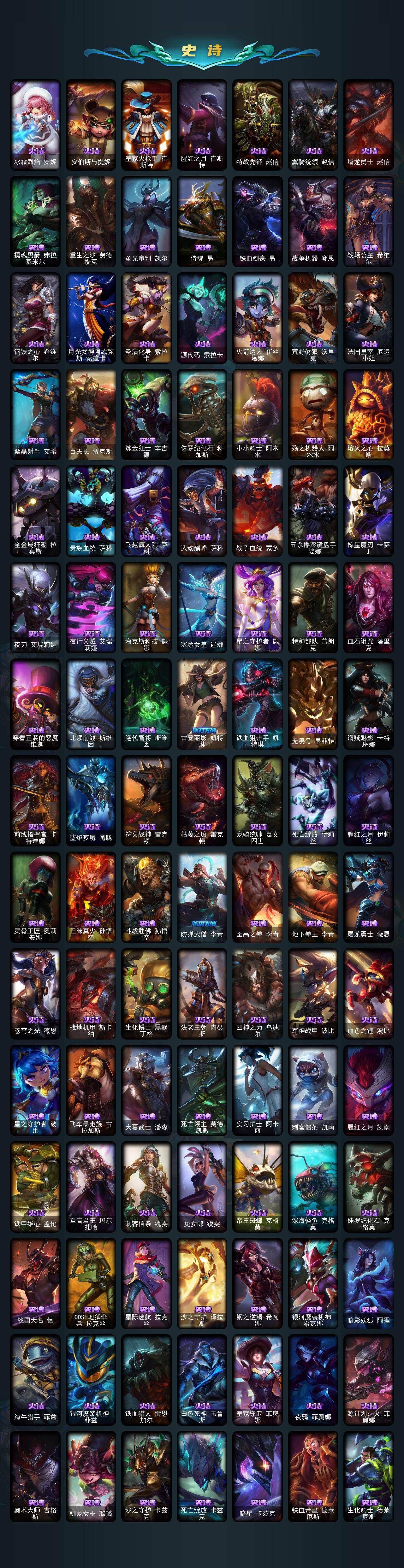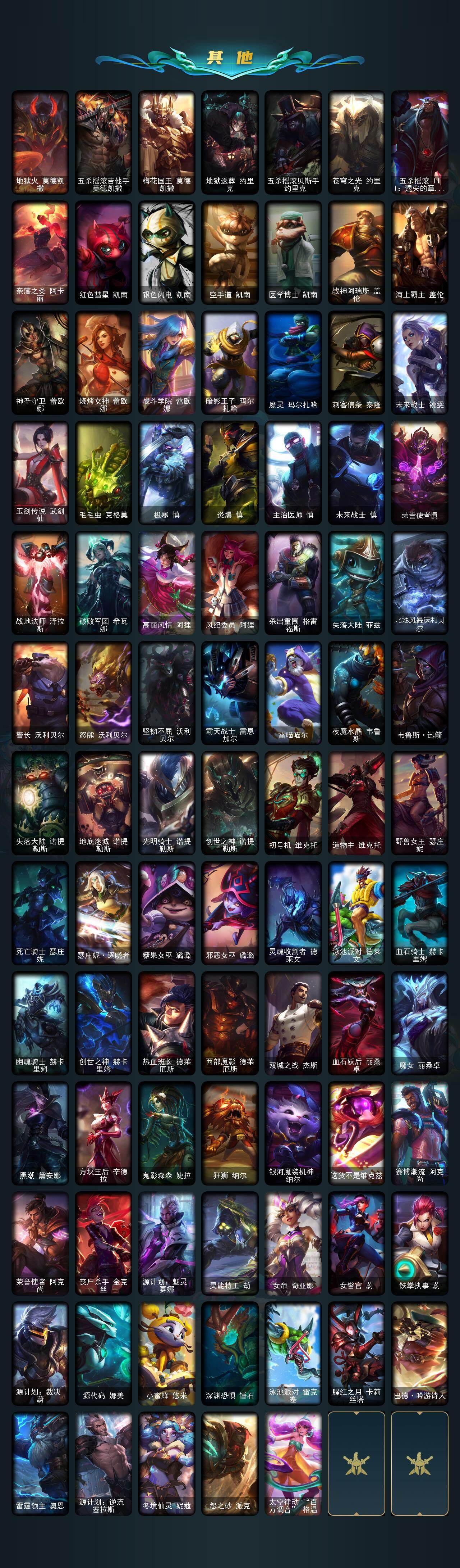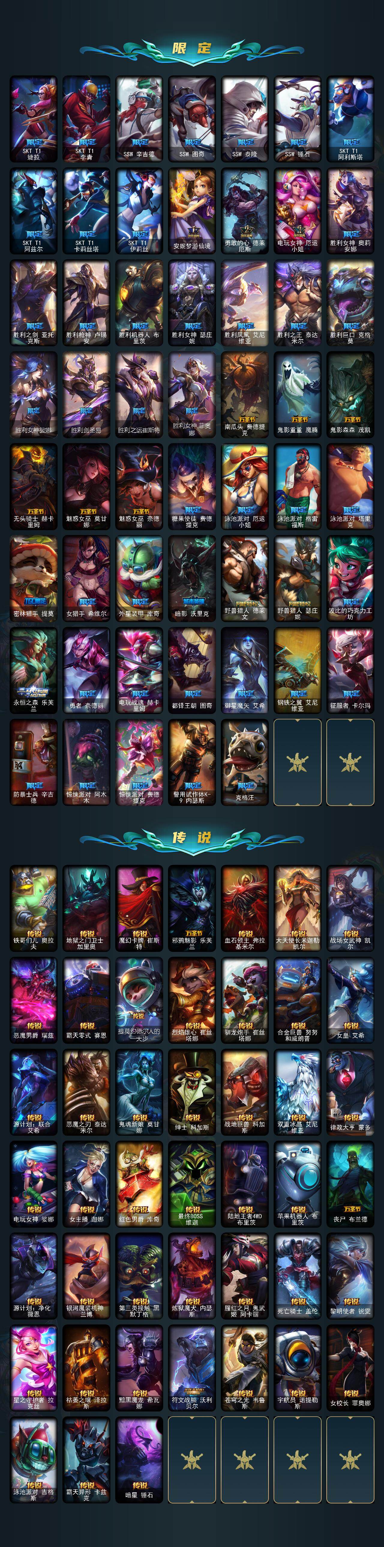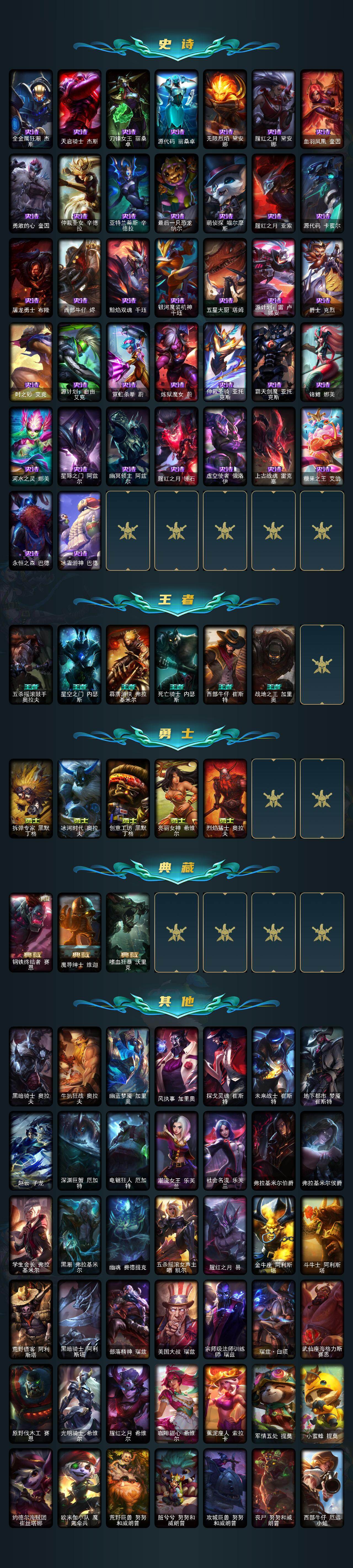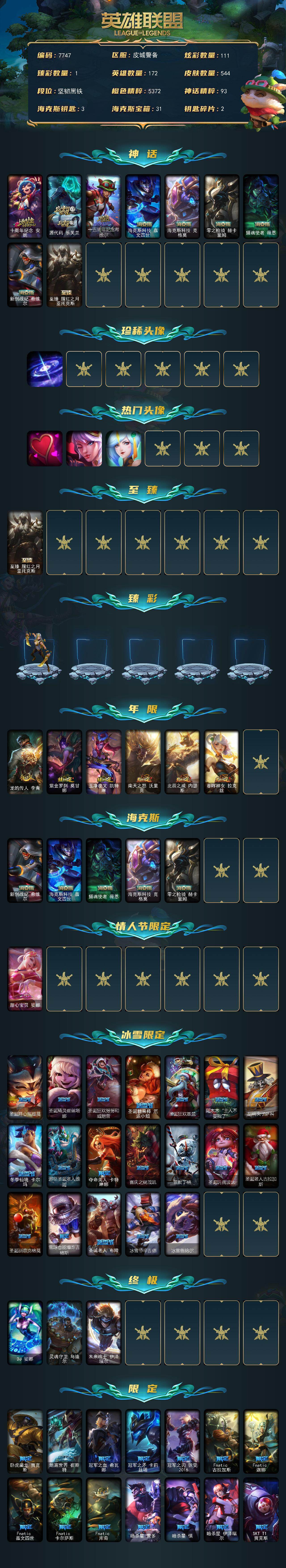 【龙瞎】未定级段位-172英雄-544皮肤-111炫彩-3终极-9神话-94限定-45传说-142史诗 【神话皮肤】:十周年纪念安妮,源代码乐芙兰,十五周年纪念希维尔,海克斯科技嘉文四世,海克斯科技克格莫,零之呛骑赫卡里姆,摄魂使者薇恩,新创战纪希维尔,至臻腥红之月亚托克斯 【珍稀头像】:星界起源头像 【热门头像】:爱意绵绵头像,觅心之翼奎因头像,春晖神女头像 【至臻皮肤】:至臻腥红之月亚托克斯 【臻彩皮肤】:闭月之颜貂蝉炫金莲华 【年限皮肤】:龙的传人李青,紫金罗刹莫甘娜,玉净夜叉凯特琳,南天之怒沃里克,北辰之威内瑟斯,春晖神女拉克丝 【海克斯皮肤】:新创战纪希维尔,海克斯科技嘉文四世,摄魂使者薇恩,海克斯科技克格莫,零之呛骑赫卡里姆 【情人节限定】:甜心宝贝娑娜 【冰雪限定】:圣诞开心鬼提莫,圣诞精灵崔丝塔娜,圣诞狂欢努努和威朗普,圣诞糖果棒厄运小姐,圣诞狂欢基兰,阿木木“主人不要我了”,胡桃夹子萨科,冬季仙境卡尔玛,邪恶圣诞老人维迦,夺命美人卡特琳娜,喜庆之树茂凯,雪默丁格,圣诞玩偶波比,圣诞老人古拉加斯,圣诞驯鹿克格莫,雪球也能爆炸吉格斯,圣诞老人布隆,冰雪节辛吉德,冰雪兽纳尔 【终极皮肤】:dj娑娜,灵魂守卫乌迪尔,未来战士伊泽瑞尔 【限定皮肤】:卧虎藏龙贾克斯,地底世界崔斯特,冠军之血希瓦娜,冠军之矛卡莉丝塔,冠军之刃锐雯2016,fnatic古拉加斯,fnatic迦娜,fnatic嘉文四世,fnatic卡尔萨斯,fnatic库奇,暗杀星蒙多,暗杀星慎,暗杀星伊泽瑞尔,sktt1贾克斯,sktt1婕拉,sktt1李青,ssw辛吉德,ssw图奇,ssw泰隆,ssw锤石,sktt1阿利斯塔,sktt1阿兹尔,sktt1卡莉丝塔,sktt1伊莉丝,安妮梦游仙境,勇敢的心德莱厄斯,电玩女神厄运小姐,胜利女神奥莉安娜,胜利之剑亚托克斯,胜利呛神卢锡安,胜利机器人布里茨,胜利女神瑟庄妮,胜利凤凰艾尼维亚,胜利之王泰达米尔,胜利巨口克格莫,胜利女神娑娜,胜利剑圣易,胜利之运崔斯特,胜利女神菲奥娜,南瓜头费德提克,鬼影重重魔腾,鬼影森森茂凯,无头骑士赫卡里姆,魅惑女巫莫甘娜,魅惑女巫奈德丽,糖果使徒费德提克,泳池派对厄运小姐,泳池派对格雷福斯,泳池派对塔里克,密林猎手提莫,女猎手希维尔,外星装甲库奇,暗影沃里克,野兽猎人德莱文,野兽猎人瑟庄妮,波比的巧克力工坊,永恒之森乐芙兰,勇者奈德丽,电玩战魂赫卡里姆,都铎王朝图奇,御星魔矢艾希,钢铁之翼艾尼维亚,征服者卡尔玛,防暴士兵辛吉德,惊悚派对阿木木,惊悚派对费德提克,警用试作体k9内瑟斯,克格汪 【传说皮肤】:铁哥们儿奥拉夫,地狱之门卫士加里奥,魔幻卡牌崔斯特,邪鸦魅影乐芙兰,血石领主弗拉基米尔,大天使长米迦勒凯尔,战场女武神凯尔,恶魔男爵瑞兹,霸天零式赛恩,提莫约德尔人的一大步,烈焰雄心崔丝塔娜,驯龙炮手崔丝塔娜,合金巨兽努努和威朗普,女皇艾希,源计划联合艾希,恶魔之刃泰达米尔,鬼魂新娘莫甘娜,绅士科加斯,战地巨兽科加斯,双重冰晶艾尼维亚,律政大亨蒙多,电玩女神娑娜,女主播迦娜,红色男爵库奇,最终boss维迦,陆地王者4wd布里茨,苹果机器人布里茨,丧尸布兰德,源计划净化薇恩,银河魔装机神兰博,第三类接触黑默丁格,炼狱魔犬内瑟斯,腥红之月鬼武姬阿卡丽,死亡骑士盖伦,黎明使者锐雯,星之守护者拉克丝,枯萎之壤泽拉斯,黯黑魔龙希瓦娜,符文战熊沃利贝尔,苍穹之光韦鲁斯,宇航员诺提勒斯,女校长菲奥娜,泳池派对吉格斯,霸天异形卡兹克,暗星锤石 【史诗皮肤】:冰霜烈焰安妮,安伯斯与提妮,皇家火呛手崔斯特,腥红之月崔斯特,特战先锋赵信,翼骑统领赵信,屠龙勇士赵信,摄魂男爵弗拉基米尔,重生之沙费德提克,圣光审判凯尔,侍魂易,铁血剑豪易,战争机器赛恩,战场公主希维尔,钢铁之心希维尔,月光女神阿忒弥斯索拉卡,圣洁化身索拉卡,源代码索拉卡,火箭达人崔丝塔娜,荒野豺狼沃里克,法国皇室厄运小姐,紫晶射手艾希,百夫长贾克斯,炼金狂士辛吉德,侏罗纪化石科加斯,小小骑士阿木木,殇之机器人阿木木,熔火之心拉莫斯,全金属狂潮拉莫斯,贵族血统萨科,飞越疯人院萨科,武动巅峰萨科,战争血统蒙多,五杀摇滚键盘手娑娜,掠星魔刃卡萨丁,夜刃艾瑞莉娅,夜行义贼艾瑞莉娅,海克斯科技迦娜,寒冰女皇迦娜,星之守护者迦娜,特种部队普朗克,血石诅咒塔里克,穿着正装的恶魔维迦,北领前线斯维因,绝代智将斯维因,古墓丽影凯特琳,铁血狙击手凯特琳,无畏号墨菲特,海贼魅影卡特琳娜,前线指挥官卡特琳娜,蓝焰梦魔魔腾,符文战神雷克顿,枯萎之壤雷克顿,龙骑统帅嘉文四世,死亡绽放伊莉丝,腥红之月伊莉丝,灵骨工匠奥莉安娜,三昧真火孙悟空,斗战胜佛孙悟空,防弹武僧李青,至高之拳李青,地下拳王李青,屠龙勇士薇恩,苍穹之光薇恩,战地机甲斯卡纳,生化博士黑默丁格,法老王朝内瑟斯,四神之力乌迪尔,军神战甲波比,血色之锤波比,星之守护者波比,飞车暴走族古拉加斯,大夏武士潘森,死亡领主莫德凯撒,实习护士阿卡丽,刺客信条凯南,腥红之月凯南,铁甲雄心盖伦,至高君王玛尔扎哈,刺客信条锐雯,兔女郎锐雯,帝王斑蝶克格莫,深海怪鱼克格莫,侏罗纪化石克格莫,战国大名慎,odst地狱伞兵拉克丝,星际迷航拉克丝,沙之守护泽拉斯,钢之逆鳞希瓦娜,银河魔装机神希瓦娜,暗影妖狐阿狸,海牛猎手菲兹,银河魔装机神菲兹,铁血猎人雷恩加尔,白色死神韦鲁斯,皇家守卫菲奥娜,夜鸦菲奥娜,源计划火菲奥娜,奥术大师吉格斯,驯龙女巫璐