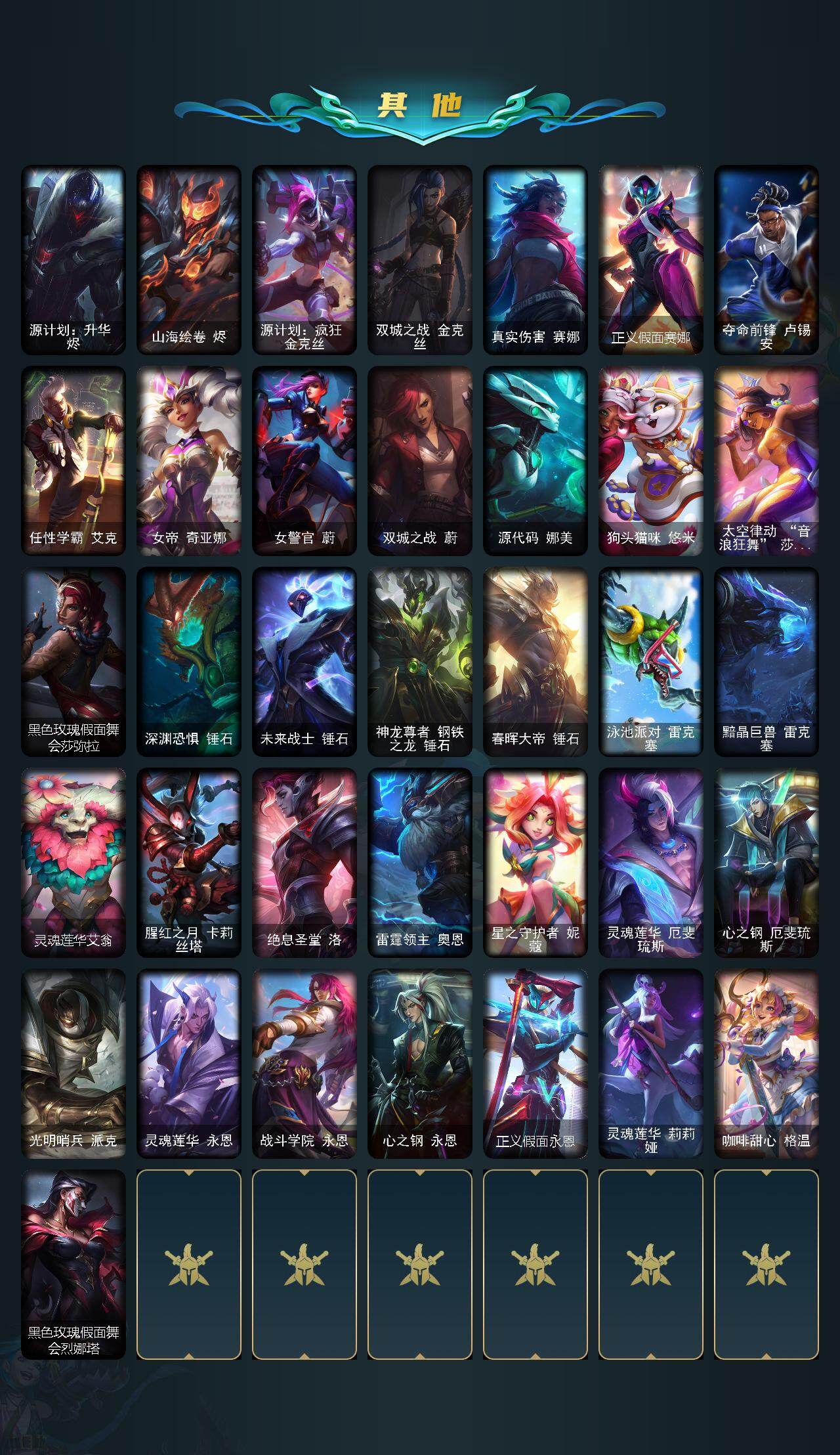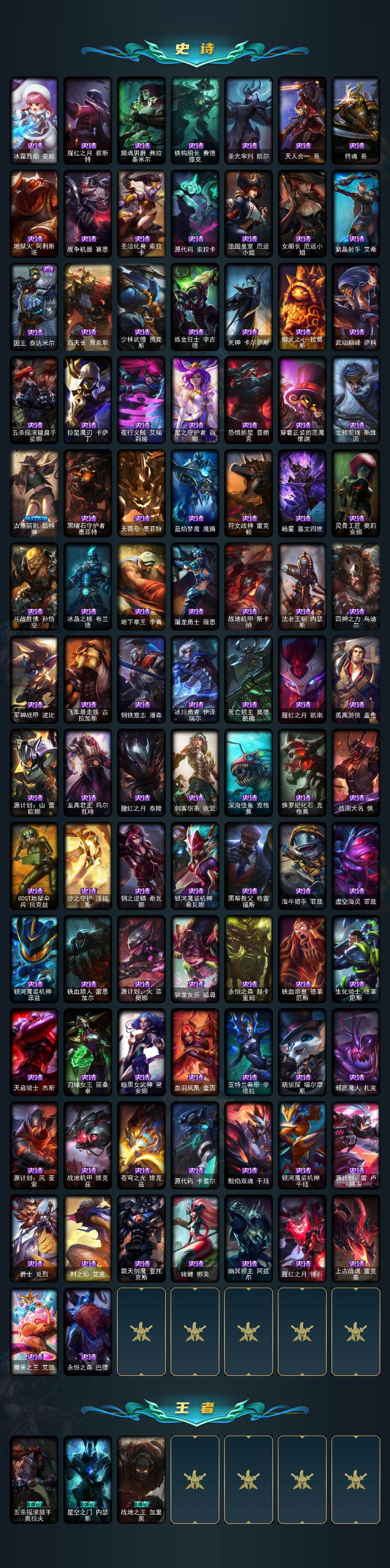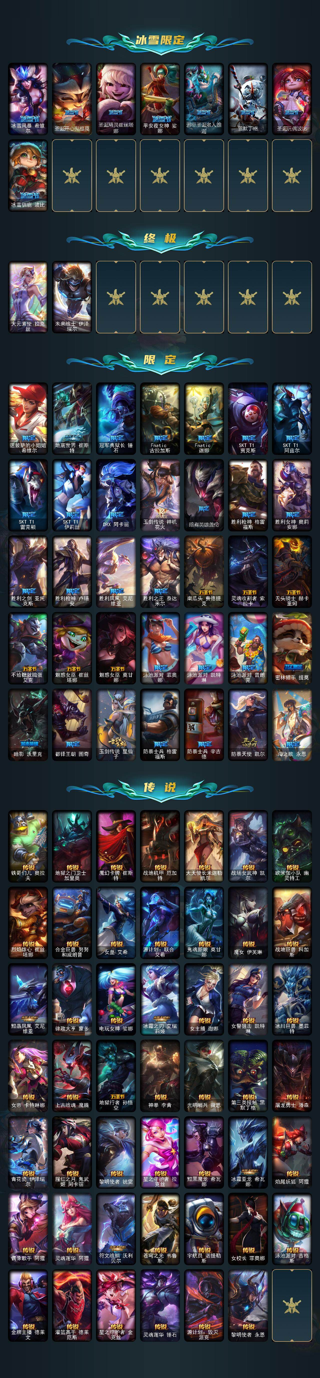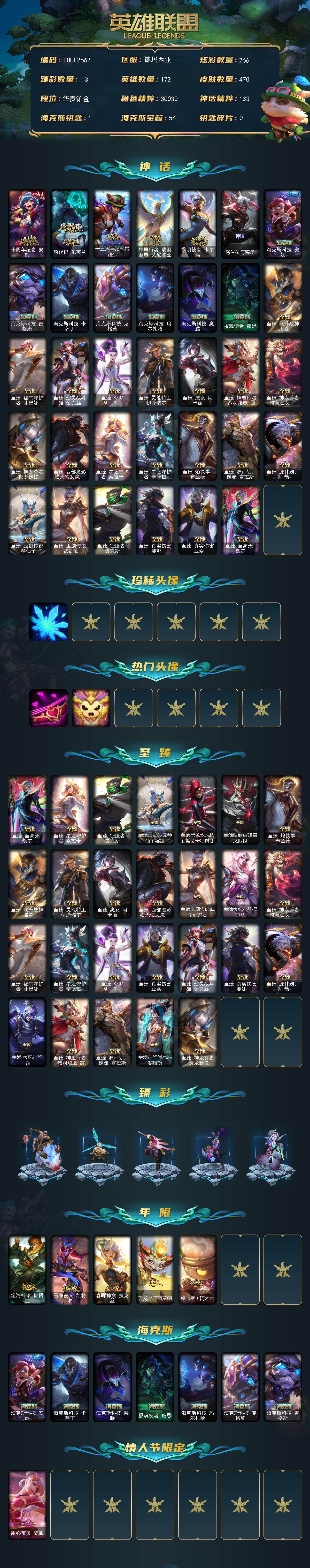 【lolf2662】172英雄/470皮肤/2终极/39神话/49限定/13臻彩/266炫彩/48传说/93史诗/铂金/十周年纪念安妮/源代码乐芙兰/十五周年纪念希维尔/神凰行者瑞羽圣凰艾尼维亚/黎明使者卡尔玛/殿堂传奇薇恩/海克斯科技安妮/海克斯科技吉格斯/海克斯科技卡萨丁/海克斯科技克格莫/海克斯科技玛尔扎哈/海克斯科技魔腾/摄魂使者薇恩/至臻征服者贾克斯/至臻真实伤害赛娜/至臻真实伤害亚索/至臻至高天凯尔/至臻飞升战神潘森/至臻福牛守护者菲奥娜/至臻幻灵战斗猫金克丝/至臻kdaallout卡莎/至臻灵能特工伊泽瑞尔/至臻魔女阿卡丽/至臻神凰行者烈羽焰凰霞/至臻神龙尊者均衡之龙沃利贝尔/至臻神龙尊者炎龙瑟提/至臻西部魔影猎天使恶魔泰隆/至臻星之守护者索拉卡/至臻星之守护者辛德拉/至臻焰执事布兰德/至臻源计划逆流塞拉斯/至臻源计划阴劫/至臻玉剑传说琴仙子/至臻玉剑传说武剑仙/雪花头像/爱情之歌头像/星守索拉卡头像/至臻玉剑传说琴仙子娑娜/至臻黑色玫瑰假面舞会卡特琳娜/至臻暗裔英雄嘉文四世/至臻玉剑传说武剑仙锐雯/至臻灵魂莲华拉克丝/至臻灵魂莲华劫/至臻莲华温泉厄斐琉斯/天龙之子卡莎飞龙乘云/无畏骑士瑟庄妮赤子初心/冰霜之刃艾瑞莉娅炫金/墨之影武者亚索金墨耀影/玉剑传说无影竞星/星之守护者娑娜未来之光/星之守护者金克丝黑洞/魔女阿卡丽虚荣/净雪之月莫甘娜冬虹/心之钢伊泽瑞尔锐意曲风/花仙子崔丝塔娜蓝闪/定海神珍孙悟空/玉净夜叉凯特琳/春晖神女拉克丝/天龙之子斯莫德/点心宝贝阿木木/甜心宝贝娑娜/冰雪风暴希维尔/圣诞开心鬼提莫/圣诞精灵崔丝塔娜/平安夜女神娑娜/邪恶圣诞老人维迦/雪默丁格/圣诞玩偶波比/冰雪驯鹿波比/大元素使拉克丝/未来战士伊泽瑞尔/送披萨的小姐姐希维尔/地底世界崔斯特/冠军典狱长锤石/fnatic古拉加斯/fnatic迦娜/sktt1贾克斯/sktt1阿兹尔/sktt1雷克顿/sktt1伊莉丝/drx阿卡丽/玉剑传说神机花火/暗裔英雄盖伦/胜利呛神格雷福斯/胜利女神奥莉安娜/胜利之剑亚托克斯/胜利呛神卢锡安/胜利凤凰艾尼维亚/胜利之王泰达米尔/南瓜头费德提克/灵魂收割者索拉卡/无头骑士赫卡里姆/不给糖就捣蛋艾克/魅惑女巫崔丝塔娜/魅惑女巫莫甘娜/泳池派对菲奥娜/泳池派对凯特琳/泳池派对普朗克/密林猎手提莫/暗影沃里克/都铎王朝图奇/玉剑传说星仙子/防暴士兵格雷福斯/防暴士兵辛吉德/防暴天使凯尔/海之歌永恩/铁哥们儿奥拉夫/地狱之门卫士加里奥/魔幻卡牌崔斯特/战地机甲厄加特/大天使长米迦勒凯尔/战场女武神凯尔/欧米伽小队幽灵特工/烈焰雄心崔丝塔娜/合金巨兽努努和威朗普/女皇艾希/源计划联合艾希/鬼魂新娘莫甘娜/魔女伊芙琳/战地巨兽科加斯/黯晶凤凰艾尼维亚/律政大亨蒙多/电玩女神娑娜/冰霜之刃艾瑞莉娅/女主播迦娜/女警狙击凯特琳/冰川巨兽墨菲特/女帝卡特琳娜/上古战魂魔腾/地狱行者孙悟空/神拳李青/光明哨兵薇恩/第三类接触黑默丁格/屠龙勇士潘森/青花瓷伊泽瑞尔/腥红之月鬼武姬阿卡丽/黎明使者锐雯/星之守护者拉克丝/黯黑魔龙希瓦娜/冰霜亚龙希瓦娜/焰尾妖狐阿狸/偶像歌手阿狸/灵魂莲华阿狸/符文战熊沃利贝尔/苍穹之光韦鲁斯/宇航员诺提勒斯/女校长菲奥娜/泳池派对吉格斯/金牌主播德莱文/灌篮高手德莱厄斯/星之守护者金克丝/灵魂莲华锤石/源计划毁灭派克/黎明使者永恩/冰霜烈焰安妮/腥红之月崔斯特/摄魂男爵弗拉基米尔/铁钩船长费德提克/圣光审判凯尔/天人合一易/侍魂易/地狱火阿利斯塔/战争机器赛恩/圣洁化身索拉卡/源代码索拉卡/法国皇室厄运小姐/女船长厄运小姐/紫晶射手艾希/国王泰达米尔/百夫长贾克斯/少林武僧贾克斯/炼金狂士辛吉德/死神卡尔萨斯/熔火之心拉莫斯/武动巅峰萨科/五杀摇滚键盘手娑娜/掠星魔刃卡萨丁/夜行义贼艾瑞莉娅/星之守护者迦娜/恐惧新星普朗克/穿着正装的恶魔维迦/北领前线斯维因/古墓丽影凯特琳/黑曜石守护者墨菲特/无畏号墨菲特/蓝焰梦魔魔腾/符文战神雷克顿/暗星嘉文四世/灵骨工匠奥莉安娜/斗战胜佛孙悟空/冰晶之核布兰德/地下拳王李青/屠龙勇士薇恩/战地机甲斯卡纳/法老王朝内瑟斯/四神之力乌迪尔/军神战甲波比/飞车暴走族古拉加斯/钢铁意志潘森/冰川勇者伊泽瑞尔/死亡领主莫德凯撒/腥红之月凯南/孤高游侠盖伦/源计划山蕾欧娜/至高君王玛尔扎哈/腥红之月泰隆/刺客信条锐雯/深海怪鱼克格莫/侏罗纪化石克格莫/战国大名慎/odst地狱伞兵拉克丝/沙之守护泽拉斯/钢之逆鳞希瓦娜/银河魔装机神希瓦娜/黑帮教父格雷福斯/海牛猎手菲兹/虚空海灵菲兹/银河魔装机神菲兹/铁血猎人雷恩加尔/源计划火菲奥娜/驯龙女巫璐璐/永恒之森赫卡里姆/铁血帝皇德莱厄斯/生化骑士德莱厄斯/天启骑士杰斯/刀锋女王丽桑卓/暗黑女武神黛安娜/血羽凤凰奎因/亚特兰蒂斯辛德拉/萌侦探喵尔摩斯/邪恶魔人扎克/源计划风亚索/战地机甲维克兹/苍穹之光维克兹/源代码卡蜜尔/黯焰双魂千珏/银河魔装机神千珏/源计划雷卢锡安/爵士克烈/时之砂艾克/霸天剑魔亚托克斯/锦鲤娜美/幽冥领主阿兹尔/腥红之月锤石/上古战魂雷克塞/糖果之王艾翁/永恒之森巴德/五杀摇滚鼓手奥拉夫/星空之门内瑟斯/战地之王加里奥/冰河时代奥拉夫/创意工坊黑默丁格/宗师级锻造训练师/银河魔装机神安妮/咖啡甜心安妮/黑暗骑士奥拉夫/牛扒狂战奥拉夫/皇家守