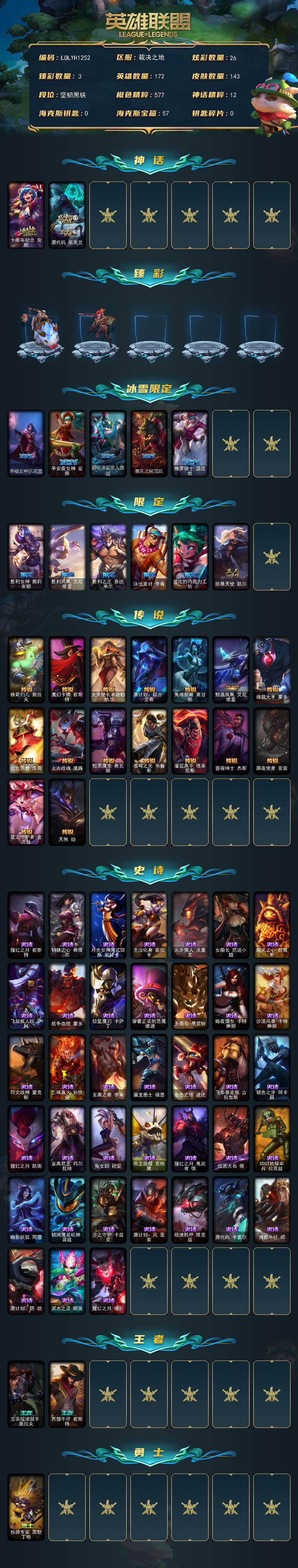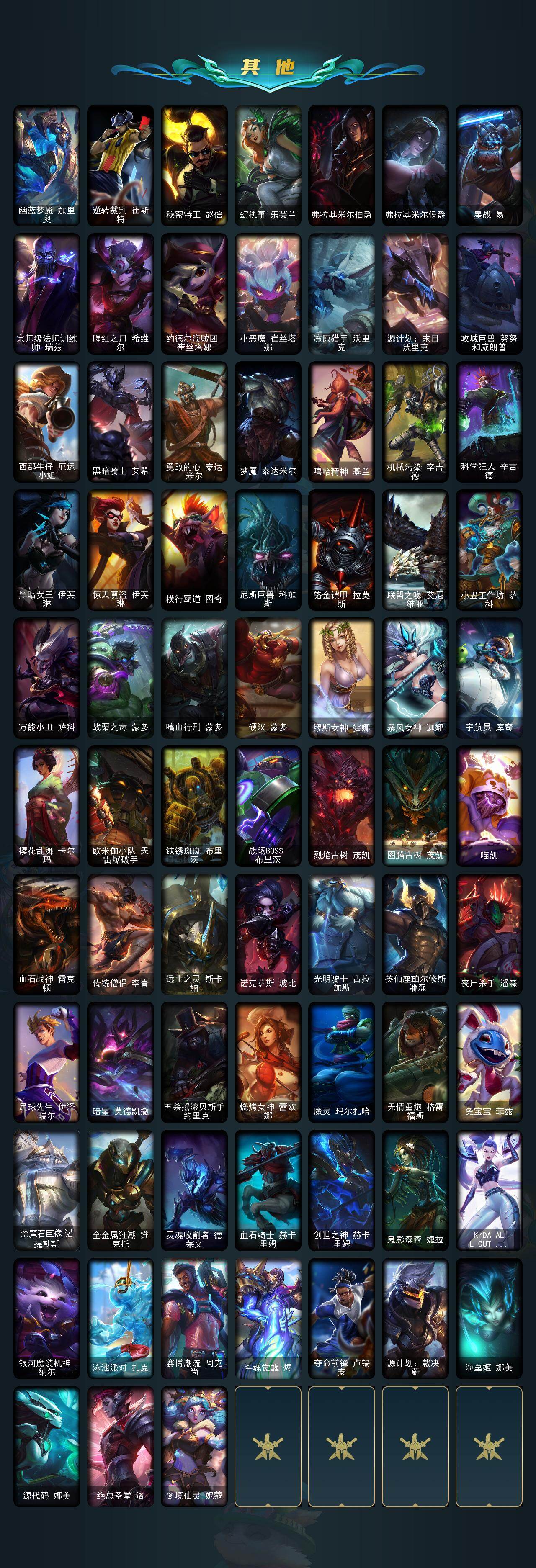 【lolyh1252】172英雄/143皮肤/2神话/11限定/3臻彩/26炫彩/16传说/38史诗/未定级/十周年纪念安妮/源代码乐芙兰/无畏骑士瑟庄妮赤子初心/黎明使者锐雯黑夜使者/魔女阿卡丽虚荣/幸福女神乐芙兰/平安夜女神娑娜/邪恶圣诞老人维迦/喜庆之树茂凯/魄罗骑士瑟庄妮/胜利女神奥莉安娜/胜利凤凰艾尼维亚/胜利之王泰达米尔/泳池派对李青/波比的巧克力工坊/防暴天使凯尔/铁哥们儿奥拉夫/魔幻卡牌崔斯特/大天使长米迦勒凯尔/源计划联合艾希/鬼魂新娘莫甘娜/黯晶凤凰艾尼维亚/律政大亨蒙多/红色男爵库奇/上古战魂魔腾/黯黑魔龙希瓦娜/苍穹之光韦鲁斯/灌篮高手德莱厄斯/蔷薇绅士杰斯/黑夜使者亚索/星之守护者金克丝/天煞劫/腥红之月崔斯特/钢铁之心希维尔/月光女神阿忒弥斯索拉卡/圣洁化身索拉卡/火牙狼人沃里克/女船长厄运小姐/熔火之心拉莫斯/飞越疯人院萨科/战争血统蒙多/掠星魔刃卡萨丁/穿着正装的恶魔维迦/无畏号墨菲特/暗夜猫女卡特琳娜/沙漠风暴卡特琳娜/符文战神雷克顿/三昧真火孙悟空/至高之拳李青/屠龙勇士薇恩/血色之锤波比/飞车暴走族古拉加斯/银色之牙阿卡丽/腥红之月凯南/至高君王玛尔扎哈/兔女郎锐雯/帝王斑蝶克格莫/腥红之月鬼武者慎/战国大名慎/odst地狱伞兵拉克丝/暗影妖狐阿狸/银河魔装机神菲兹/沙之守护卡兹克/源计划风亚索/战地机甲维克兹/源代码卡蜜尔/西部牛仔烬/源计划阴劫/河水之灵娜美/腥红之月锤石/五杀摇滚鼓手奥拉夫/西部牛仔崔斯特/拆弹专家黑默丁格/幽蓝梦魇加里奥/逆转裁判崔斯特/秘密特工赵信/幻执事乐芙兰/弗拉基米尔伯爵/弗拉基米尔侯爵/星战易/宗师级法师训练师瑞兹/腥红之月希维尔/约德尔海贼团崔丝塔娜/小恶魔崔丝塔娜/冻原猎手沃里克/源计划末日沃里克/攻城巨兽努努和威朗普/西部牛仔厄运小姐/黑暗骑士艾希/勇敢的心泰达米尔/梦魇泰达米尔/嘻哈精神基兰/机械污染辛吉德/科学狂人辛吉德/黑暗女王伊芙琳/惊天魔盗伊芙琳/横行霸道图奇/尼斯巨兽科加斯/铬金铠甲拉莫斯/联盟之喙艾尼维亚/小丑工作坊萨科/万能小丑萨科/战栗之毒蒙多/嗜血行刑蒙多/硬汉蒙多/缪斯女神娑娜/暴风女神迦娜/宇航员库奇/樱花乱舞卡尔玛/欧米伽小队天雷爆破手/铁锈斑斑布里茨/战场boss布里茨/烈焰古树茂凯/图腾古树茂凯/喵凯/血石战神雷克顿/传统僧侣李青/远土之灵斯卡纳/诺克萨斯波比/光明骑士古拉加斯/英仙座珀尔修斯潘森/丧尸杀手潘森/足球先生伊泽瑞尔/暗星莫德凯撒/五杀摇滚贝斯手约里克/烧烤女神蕾欧娜/魔灵玛尔扎哈/无情重炮格雷福斯/兔宝宝菲兹/禁魔石巨像诺提勒斯/全金属狂潮维克托/灵魂收割者德莱文/血石骑士赫卡里姆/创世之神赫卡里姆/鬼影森森婕拉/kdaallout卡莎/银河魔装机神纳尔/泳池派对扎克/赛博潮流阿克尚/斗魂觉醒烬/夺命前锋卢锡安/源计划裁决蔚/海皇姬娜美/源代码娜美/绝息圣堂洛/冬境仙灵妮蔻