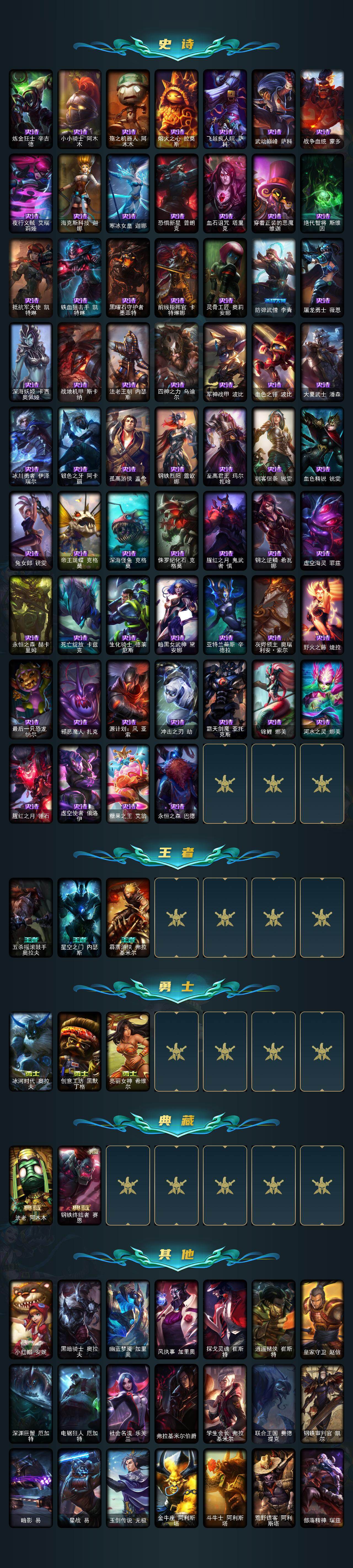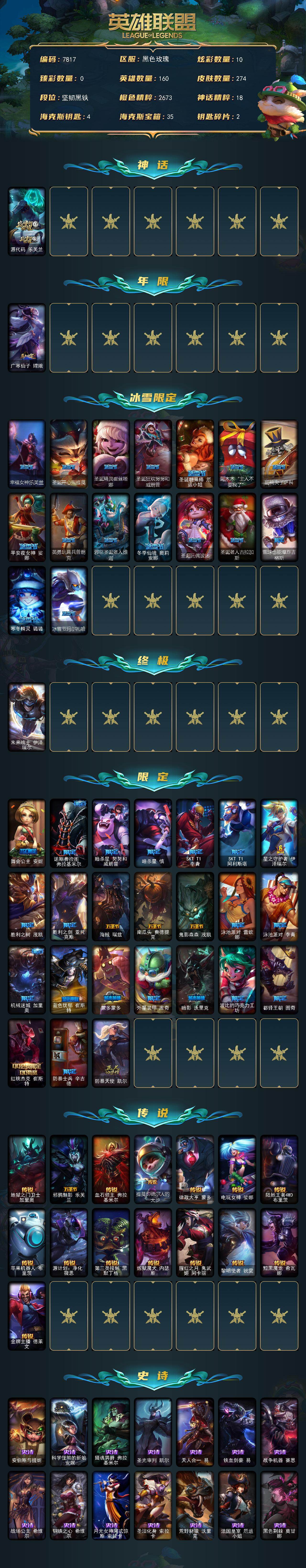 单双未定级段位-160英雄-274皮肤-10炫彩-1终极-1神话-41限定-15传说-74史诗 【神话皮肤】:源代码乐芙兰 【年限皮肤】:广寒仙子嫦娥 【冰雪限定】:幸福女神乐芙兰,圣诞开心鬼提莫,圣诞精灵崔丝塔娜,圣诞狂欢努努和威朗普,圣诞糖果棒厄运小姐,阿木木“主人不要我了”,胡桃夹子萨科,平安夜女神娑娜,英勇玩具兵普朗克,邪恶圣诞老人维迦,冬季仙境奥莉安娜,圣诞玩偶波比,圣诞老人古拉加斯,雪球也能爆炸吉格斯,寒冬精灵璐璐,冰雪节玛尔扎哈 【终极皮肤】:未来战士伊泽瑞尔 【限定皮肤】:舞会公主安妮,诺斯费拉图弗拉基米尔,暗杀星努努和威朗普,暗杀星慎,sktt1李青,sktt1阿利斯塔,星之守护者伊泽瑞尔,胜利之树茂凯,胜利之剑亚托克斯,海贼瑞兹,南瓜头费德提克,鬼影森森茂凯,泳池派对蕾欧娜,泳池派对李青,机械迷城加里奥,蓝色忧郁崔斯特,蒙多蒙多,外星装甲库奇,暗影沃里克,波比的巧克力工坊,都铎王朝图奇,红桃杰克崔斯特,防暴士兵辛吉德,防暴天使凯尔 【传说皮肤】:地狱之门卫士加里奥,邪鸦魅影乐芙兰,血石领主弗拉基米尔,提莫约德尔人的一大步,律政大亨蒙多,电玩女神娑娜,陆地王者4wd布里茨,苹果机器人布里茨,源计划净化薇恩,第三类接触黑默丁格,炼狱魔犬内瑟斯,腥红之月鬼武姬阿卡丽,黎明使者锐雯,黯黑魔龙希瓦娜,金牌主播德莱文 【史诗皮肤】:安伯斯与提妮,科学怪熊的新娘安妮,摄魂男爵弗拉基米尔,圣光审判凯尔,天人合一易,铁血剑豪易,战争机器赛恩,战场公主希维尔,钢铁之心希维尔,月光女神阿忒弥斯索拉卡,圣洁化身索拉卡,荒野豺狼沃里克,法国皇室厄运小姐,黑色荆棘莫甘娜,炼金狂士辛吉德,小小骑士阿木木,殇之机器人阿木木,熔火之心拉莫斯,飞越疯人院萨科,武动巅峰萨科,战争血统蒙多,夜行义贼艾瑞莉娅,海克斯科技迦娜,寒冰女皇迦娜,恐惧新星普朗克,血石诅咒塔里克,穿着正装的恶魔维迦,绝代智将斯维因,抵抗军天使凯特琳,铁血狙击手凯特琳,黑曜石守护者墨菲特,前线指挥官卡特琳娜,灵骨工匠奥莉安娜,防弹武僧李青,屠龙勇士薇恩,深海妖姬卡西奥佩娅,战地机甲斯卡纳,法老王朝内瑟斯,四神之力乌迪尔,军神战甲波比,血色之锤波比,大夏武士潘森,冰川勇者伊泽瑞尔,银色之牙阿卡丽,孤高游侠盖伦,钢铁烈阳蕾欧娜,至高君王玛尔扎哈,刺客信条锐雯,血色精锐锐雯,兔女郎锐雯,帝王斑蝶克格莫,深海怪鱼克格莫,侏罗纪化石克格莫,腥红之月鬼武者慎,钢之逆鳞希瓦娜,虚空海灵菲兹,永恒之森赫卡里姆,死亡绽放卡兹克,生化骑士德莱厄斯,暗黑女武神黛安娜,亚特兰蒂斯辛德拉,灰烬领主奥瑞利安索尔,野火之藤婕拉,最后一只恐龙纳尔,邪恶魔人扎克,源计划风亚索,冲击之刃劫,霸天剑魔亚托克斯,锦鲤娜美,河水之灵娜美,腥红之月锤石,虚空使者俄洛伊,糖果之王艾翁,永恒之森巴德 【王者皮肤】:五杀摇滚鼓手奥拉夫,星空之门内瑟斯,霹雳游侠弗拉基米尔 【勇士皮肤】:冰河时代奥拉夫,创意工坊黑默丁格,亮丽女神希维尔 【典藏皮肤】:法老阿木木,钢铁终结者赛恩 【其他皮肤1】:小红帽安妮,黑暗骑士奥拉夫,幽蓝梦魇加里奥,风执事加里奥,探戈灵魂崔斯特,赌侠崔斯特,皇家守卫赵信,深渊巨蟹厄加特,电锯狂人厄加特,社会名流乐芙兰,弗拉基米尔伯爵,学生会长弗拉基米尔,联合王国费德提克,钢铁审判官凯尔,暗影易,星战易,玉剑传说无极,金牛座阿利斯塔,斗牛士阿利斯塔,荒野镖客阿利斯塔,部落精神瑞兹,宗师级法师训练师瑞兹,武仙座海格力斯赛恩,原野伐木工赛恩,森林女神索拉卡,蕉泥座人索拉卡,游击队员崔丝塔娜,约德尔海贼团崔丝塔娜,披着海牛的狼沃里克,海牛狼人沃里克,荒野巨兽努努和威朗普,攻城巨兽努努和威朗普,勇敢的心艾希,勇敢的心泰达米尔,梦魇泰达米尔,光明骑士贾克斯,嘻哈精神基兰,遗迹守护者基兰,机械污染辛吉德,冲浪高手辛吉德,黑暗女王伊芙琳,首领图奇,北风冻原图奇,黑金诱惑图奇,横行霸道图奇,五杀摇滚主唱卡尔萨斯,梦魇科加斯,尼斯巨兽科加斯,暴龙科加斯,情绪摇滚阿木木,铬金铠甲拉莫斯,重甲猎鹰艾尼维亚,恐怖之源萨科,小丑工作坊萨科,健美教练蒙多,虚空前世卡萨丁,先驱行者卡萨丁,凌云之翼艾瑞莉娅,暴风女神迦娜,幽灵船长普朗克,雪橇速滑库奇,急速前进库奇,日冕女神卡尔玛,樱花乱舞卡尔玛,冰壶选手维迦,灰胡子魔法师维迦,绿野仙踪维迦,垃圾场特朗德尔,荒野治安官凯特琳,铁锈斑斑布里茨,戴一个表布里茨,珊瑚礁墨菲特,赏金猎人卡特琳娜,劫掠梦魇魔腾,荒野之咬雷克顿,血石战神雷克顿,屠龙勇士嘉文四世,哥特女仆奥莉安娜,末日余生布兰德,独眼海盗兰博,荒漠之咬卡西奥佩娅,创世之神内瑟斯,丛林猎豹奈德丽,法国女仆奈德丽,武力全开乌迪尔,乡村农夫古拉加斯,品酒大师古拉加斯,美酒节特使古拉加斯,古拉加斯碎桶者,万人敌潘森,英仙座珀尔修斯潘森,光执事伊泽瑞尔,黑桃皇牌伊泽瑞尔,地狱火莫德凯撒,五杀摇滚吉他手莫德凯撒,地狱送葬约里克,五杀摇滚iii遗失的章节约里克,蜂刺阿卡丽,足球宝贝阿卡丽,银色闪电凯南,空手道凯南,医学博士凯南,战神阿瑞斯盖伦,神圣守卫蕾欧娜,血色精锐泰隆,未来战士锐雯,毛毛虫克格莫,极寒慎,炎爆慎,未来战士慎,游侠法师拉克丝,符文生物泽拉斯,战地法师泽拉斯,风纪委员阿狸,苔原猎手菲兹,雷霆领主沃利贝尔,北地风暴沃利贝尔,怒熊沃利贝尔,夜魔