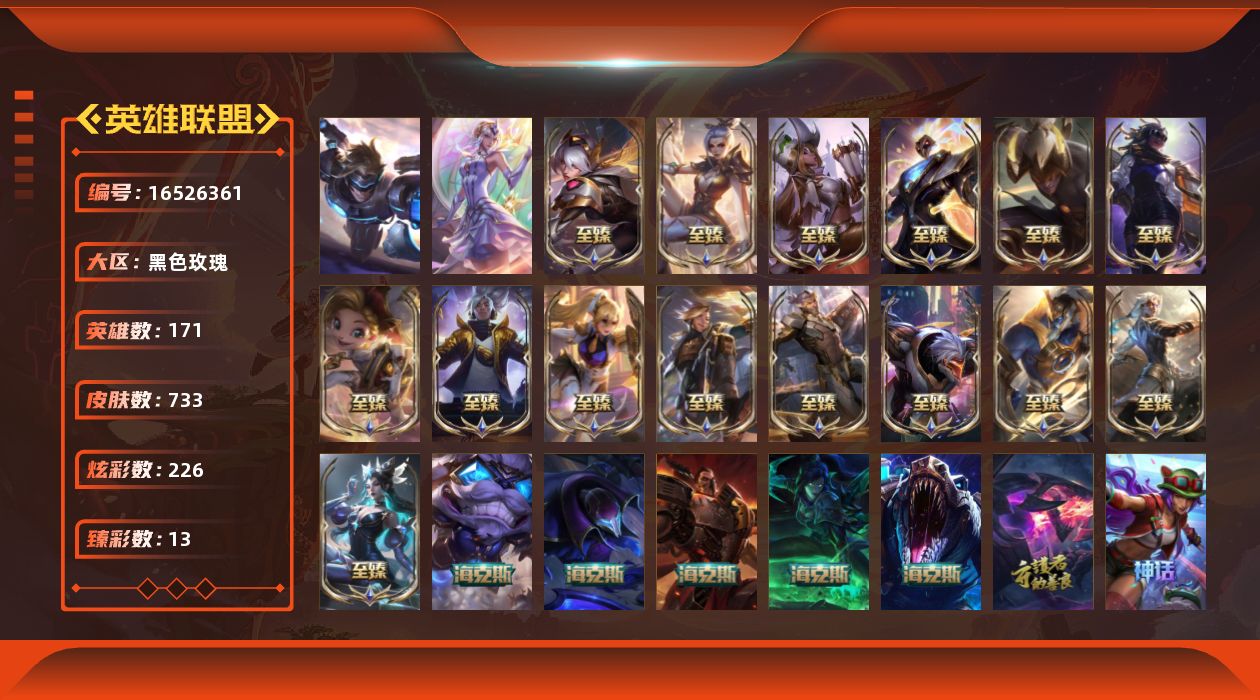 [16526361]【店主推荐捡漏号】未定级段位-171英雄-733皮肤-226炫彩-2终极-26神话-121限定-68传说-170史诗 【热门头像】:爱情之歌头像 【至臻皮肤】:至臻魅惑女巫厄运小姐,至臻源计划正义艾瑞莉娅,至臻黑夜使者李青,至臻飞升战神潘森,至臻灵能特工伊泽瑞尔,至臻战斗学院蕾欧娜,至臻玉剑传说武剑仙锐雯,至臻星之守护者辛德拉,至臻黑夜使者凯隐,至臻奥术师佐伊,至臻真实伤害亚索,至臻真实伤害赛娜,至臻源计划阴劫,至臻未来战士锤石,至臻源计划逆流塞拉斯 【臻彩皮肤】:无畏骑士瑟庄妮赤子初心,吕布奉先炫金战神,替父从军花木兰炫金龙刃,冠军之志瑞兹凯旋圣装,冠军掠夺者卡兹克凯旋圣装,冠军典狱长锤石凯旋圣装,冠军之血希瓦娜凯旋圣装,冠军之隐劫凯旋圣装,神龙尊者圣龙李青登龙,星之守护者金克丝黑洞,弹幕天使卡莎炽天使公正,泳池派对奥莉安娜优雅珠光鲸,红莲之刃锐雯 【年限皮肤】:碧玉之牙卡西奥佩娅,替父从军花木兰,广寒仙子嫦娥,神龙烈焰金克丝,美猴王孙悟空,紫金罗刹莫甘娜,张辽文远,虎痴之拳蔚,南天之怒沃里克,北辰之威内瑟斯,春晖神女拉克丝,王国机神青龙德莱文,王国机神苍狼瑟提,王国机神白虎贾克斯,王国机神玄武盖伦 【海克斯皮肤】:海克斯科技魔腾,海克斯科技雷克顿,摄魂使者薇恩,海克斯科技吉格斯,恐惧新星德莱厄斯 【情人节限定】:甜心宝贝安妮,觅心游侠卢锡安,觅心猫猫悠米,觅心魔灵奥莉安娜 【冰雪限定】:幸福女神乐芙兰,圣诞开心鬼提莫,圣诞精灵崔丝塔娜,圣诞狂欢努努和威朗普,圣诞糖果棒厄运小姐,圣诞狂欢基兰,阿木木“主人不要我了”,胡桃夹子萨科,冰封王子蒙多,平安夜女神娑娜,冬季仙境卡尔玛,邪恶圣诞老人维迦,夺命美人卡特琳娜,喜庆之树茂凯,雪装奈德丽,圣诞玩偶波比,冰雪驯鹿波比,圣诞老人古拉加斯,圣诞驯鹿克格莫,魄罗骑士瑟庄妮,冰雪节玛尔扎哈,冰雪节格雷福斯 【终极皮肤】:大元素使拉克丝,未来战士伊泽瑞尔 【神话皮肤】:十周年纪念安妮,源代码乐芙兰,十五周年纪念希维尔,暗星科加斯,神凰行者瑞羽圣凰艾尼维亚,黎明使者卡尔玛,海克斯科技吉格斯,海克斯科技雷克顿,海克斯科技魔腾,恐惧新星德莱厄斯,摄魂使者薇恩,至臻真实伤害赛娜,至臻真实伤害亚索,至臻奥术师佐伊,至臻飞升战神潘森,至臻黑夜使者凯隐,至臻黑夜使者李青,至臻灵能特工伊泽瑞尔,至臻魅惑女巫厄运小姐,至臻未来战士锤石,至臻星之