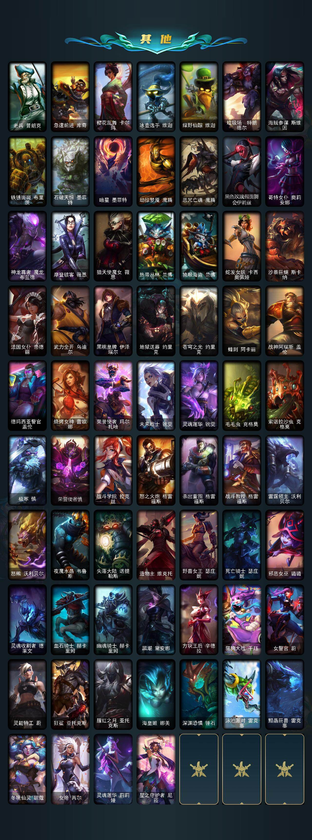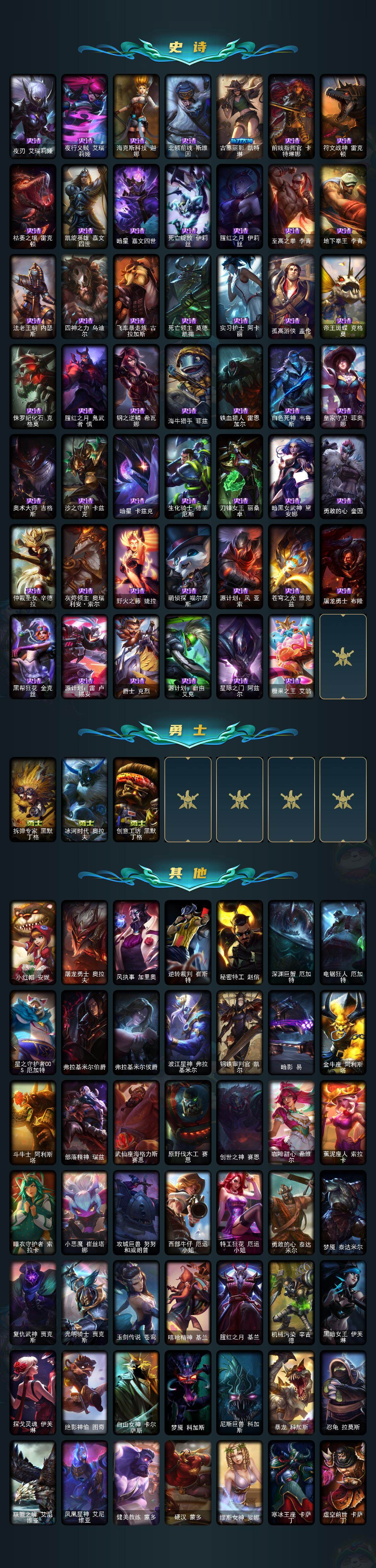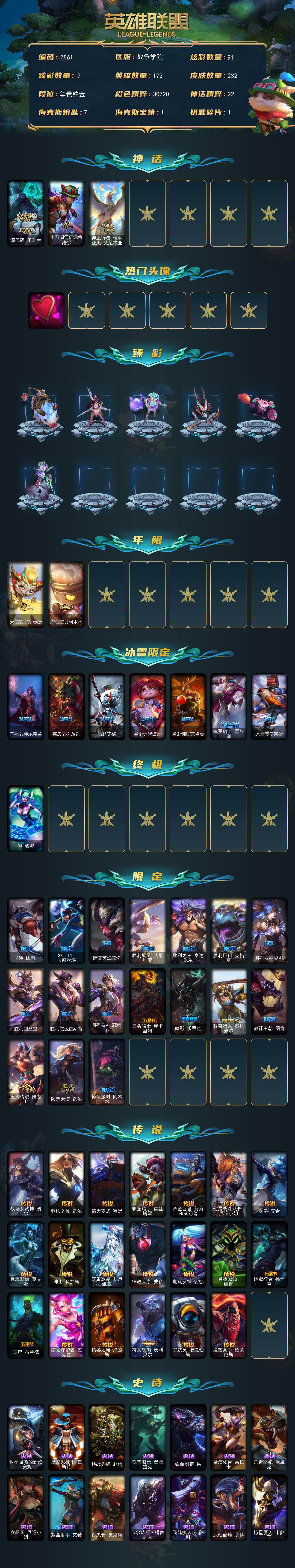 单双铂金段位-172英雄-232皮肤-91炫彩-1终极-3神话-27限定-20传说-62史诗 【神话皮肤】:源代码乐芙兰,十五周年纪念希维尔,神凰行者瑞羽圣凰艾尼维亚 【热门头像】:爱意绵绵头像 【臻彩皮肤】:无畏骑士瑟庄妮赤子初心,玉剑传说舞剑仙承影,泳池派对奥莉安娜优雅珠光鲸,霸天异形卡兹克刹那银光,可爱可爱粉红红布里茨,魔女阿卡丽虚荣,净雪之月莫甘娜冬虹 【年限皮肤】:天龙之子斯莫德,点心宝贝阿木木 【冰雪限定】:幸福女神乐芙兰,喜庆之树茂凯,雪默丁格,圣诞玩偶波比,圣诞驯鹿克格莫,魄罗骑士瑟庄妮,冰雪节辛吉德 【终极皮肤】:dj娑娜 【限定皮肤】:ssw图奇,sktt1卡莉丝塔,暗裔英雄盖伦,胜利凤凰艾尼维亚,胜利之王泰达米尔,胜利巨口克格莫,胜利女神娑娜,胜利剑圣易,胜利之运崔斯特,胜利女神菲奥娜,无头骑士赫卡里姆,暗影沃里克,野兽猎人泰达米尔,都铎王朝图奇,玉剑传说舞龙卫,防暴天使凯尔,惊悚派对阿木木 【传说皮肤】:战场女武神凯尔,钢铁之翼凯尔,霸天零式赛恩,驯龙炮手崔丝塔娜,合金巨兽努努和威朗普,幻灵战斗队长厄运小姐,女皇艾希,鬼魂新娘莫甘娜,绅士科加斯,双重冰晶艾尼维亚,律政大亨蒙多,电玩女神娑娜,最终boss维迦,地狱行者孙悟空,丧尸布兰德,星之守护者拉克丝,枯萎之壤泽拉斯,符文战熊沃利贝尔,宇航员诺提勒斯,灌篮高手德莱厄斯 【史诗皮肤】:科学怪熊的新娘安妮,皇家火呛手崔斯特,特战先锋赵信,铁钩船长费德提克,铁血剑豪易,圣洁化身索拉卡,荒野豺狼沃里克,女船长厄运小姐,紫晶射手艾希,百夫长贾克斯,卡尔萨斯祸害之光,飞越疯人院萨科,武动巅峰萨科,掠星魔刃卡萨丁,夜刃艾瑞莉娅,夜行义贼艾瑞莉娅,海克斯科技迦娜,北领前线斯维因,古墓丽影凯特琳,前线指挥官卡特琳娜,符文战神雷克顿,枯萎之壤雷克顿,凯旋英雄嘉文四世,暗星嘉文四世,死亡绽放伊莉丝,腥红之月伊莉丝,至高之拳李青,地下拳王李青,法老王朝内瑟斯,四神之力乌迪尔,飞车暴走族古拉加斯,死亡领主莫德凯撒,实习护士阿卡丽,孤高游侠盖伦,帝王斑蝶克格莫,侏罗纪化石克格莫,腥红之月鬼武者慎,钢之逆鳞希瓦娜,海牛猎手菲兹,铁血猎人雷恩加尔,白色死神韦鲁斯,皇家守卫菲奥娜,奥术大师吉格斯,沙之守护卡兹克,暗星卡兹克,生化骑士德莱厄斯,刀锋女王丽桑卓,暗黑女武神黛安娜,勇敢的心奎因,仲裁圣女辛德拉,灰烬领主奥瑞利安索尔,野火之藤婕拉,萌侦探喵尔摩斯,源计划风亚索,苍穹之光维克兹,屠龙勇士布隆,黑帮狂花金克丝,源计划雷卢锡安,爵士克烈,源计划自由艾克,星际之门阿兹尔,糖果之王艾翁 【勇士皮肤】:拆弹专家黑默丁格,冰河时代奥拉夫,创意工坊黑默丁格 【其他皮肤1】:小红帽安妮,屠龙勇士奥拉夫,风执事加里奥,逆转裁判崔斯特,秘密特工赵信,深渊巨蟹厄加特,电锯狂人厄加特,星之守护者cos厄加特,弗拉基米尔伯爵,弗拉基米尔侯爵,波江星神弗拉基米尔,钢铁审判官凯尔,暗影易,金牛座阿利斯塔,斗牛士阿利斯塔,部落精神瑞兹,武仙座海格力斯赛恩,原野伐木工赛恩,创世之神赛恩,咖啡甜心希维尔,蕉泥座人索拉卡,睡衣守护者索拉卡,小恶魔崔丝塔娜,攻城巨兽努努和威朗普,西部牛仔厄运小姐,特工狂花厄运小姐,勇敢的心泰达米尔,梦魇泰达米尔,复仇武神贾克斯,光明骑士贾克斯,玉剑传说苍鸾,嘻哈精神基兰,腥红之月基兰,机械污染辛吉德,黑暗女王伊芙琳,探戈灵魂伊芙琳,绝影神偷图奇,自由女神卡尔萨斯,梦魇科加斯,尼斯巨兽科加斯,暴龙科加斯,忍龟拉莫斯,联盟之喙艾尼维亚,凤凰星神艾尼维亚,健美教练蒙多,硬汉蒙多,缪斯女神娑娜,寒冰王座卡萨丁,虚空前世卡萨丁,老兵普朗克,急速前进库奇,樱花乱舞卡尔玛,冰壶选手维迦,绿野仙踪维迦,垃圾场特朗德尔,海贼参谋斯维因,铁锈斑斑布里茨,石破天惊墨菲特,暗星墨菲特,劫掠梦魇魔腾,恶咒亡魂魔腾,黑色玫瑰假面舞会伊莉丝,哥特女仆奥莉安娜,神龙尊者魔龙布兰德,摩登骇客薇恩,猎天使魔女薇恩,热带丛林兰博,独眼海盗兰博,蛇发女妖卡西奥佩娅,沙暴巨蝎斯卡纳,法国女仆奈德丽,武力全开乌迪尔,黑桃皇牌伊泽瑞尔,地狱送葬约里克,苍穹之光约里克,蜂刺阿卡丽,战神阿瑞斯盖伦,德玛西亚警官盖伦,烧烤女神蕾欧娜,荣誉使者玛尔扎哈,未来战士锐雯,灵魂莲华锐雯,毛毛虫克格莫,索诺拉沙虫克格莫,极寒慎,荣誉使者慎,战斗学院拉克丝,怒之火炮格雷福斯,杀出重围格雷福斯,战斗教授格雷福斯,雷霆领主沃利贝尔,怒熊沃利贝尔,夜魔水晶韦鲁斯,失落大陆诺提勒斯,造物主维克托,野兽女王瑟庄妮,死亡骑士瑟庄妮,邪恶女巫璐璐,灵魂收割者德莱文,血石骑士赫卡里姆,幽魂骑士赫卡里姆,黑潮黛安娜,方块王后辛德拉,猫狗大战千珏,女警官蔚,灵能特工蔚,狂鲨亚托克斯,腥红之月亚托克斯,海皇姬娜美,深渊恐惧锤石,泳池派对雷克塞,黯晶巨兽雷克塞,冬境仙灵妮蔻,女帝芮尔,灵魂莲华莉莉娅,星之守护者尼菈