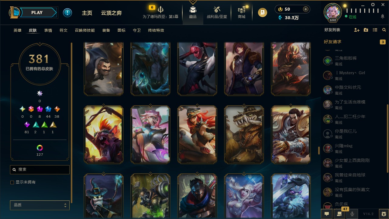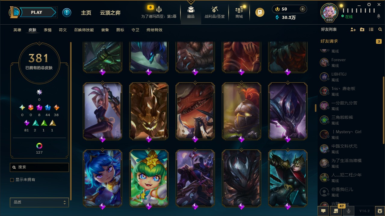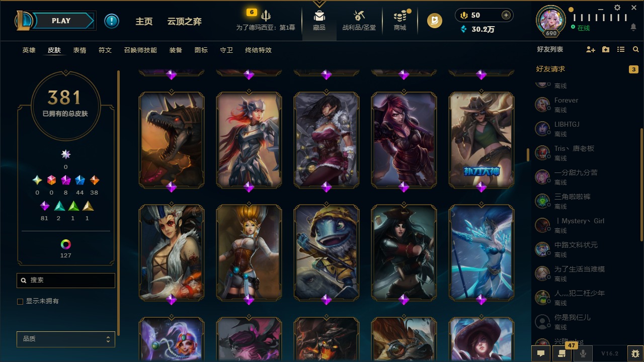 [16388482]8神话 44限定 38传说 81史诗 381皮肤 149炫彩 172英雄 可二次 可修改实名 【至臻】至臻 灵魂莲华 拉克丝至臻 征服者 贾克斯至臻 神龙尊者均衡之龙 沃利贝尔殿堂传奇 乐芙兰 【海克斯】海克斯 克格莫 【情人节限定】甜心宝贝 娑娜幽梦玫瑰 泰隆 【赛季