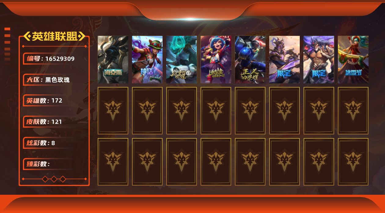 [16529309]可二次【特价出售/店主推荐】白银段位-172英雄-121皮肤-8炫彩-0终极-5神话-4限定-18传说-32史诗 【海克斯皮肤】:零之呛骑赫卡里姆 【冰雪限定】:平安夜女神娑娜 【神话皮肤】:十周年纪念安妮,源代码乐芙兰,十五周年纪念希维尔,神凰行者瑞羽圣凰艾尼维亚,零之呛骑赫卡里姆 【限定皮肤】:胜利之王泰达米尔,胜利剑圣易,防暴天使凯尔 【传说皮肤】:战场女武神凯尔,源计划林易,墨之影武者易,约德尔国队长提莫,黯晶凤凰艾尼维亚,女主播迦娜,地狱行者孙悟空,神龙尊者圣龙李青,第三类接触黑默丁格,炼狱魔犬内瑟斯,腥红之月鬼武姬阿卡丽,神王盖伦,泳池派对吉格斯,黑夜使者亚索,神龙尊者昼日真龙亚索,星之守护者金克丝,西部魔影卢锡安,天煞劫 【史诗皮肤】:圣光审判凯尔,天人合一易,侍魂易,地狱火阿利斯塔,火箭达人崔丝塔娜,黑帮狂花厄运小姐,国王泰达米尔,刀锋女王莫甘娜,熔火之心拉莫斯,贵族血统萨科,飞越疯人院萨科,战争血统蒙多,特种部队普朗克,恐惧新星普朗克,血石诅咒塔里克,穿着正装的恶魔维迦,海贼魅影卡特琳娜,源计划雄心卡特琳娜,地下拳王李青,法老王朝内瑟斯,铁血猎手奈德丽,血色之锤波比,钢铁意志潘森,银色之牙阿卡丽,铁甲雄心盖伦,暗影妖狐阿狸,银河魔装机神菲兹,暗星卡兹克,西部牛仔亚索,源计划风亚索,黯焰双魂千珏,五星大厨塔姆 【王者皮肤】:五杀摇滚鼓手奥拉夫 【勇士皮肤】:拆弹专家黑默丁格 【典藏皮肤】:钢铁终结者赛恩 【其他皮肤1】:银河魔装机神安妮,深渊巨蟹厄加特,暗影易,玉剑传说无极,腥红之月易,无极执事易,荒野镖客阿利斯塔,黑暗骑士阿利斯塔,原野伐木工赛恩,军情五处提莫,脏兮兮努努和威朗普,攻城巨兽努努和威朗普,西部牛仔厄运小姐,玉剑传说苍鸾,遗迹守护者基兰,假面女皇伊芙琳,狂欢阿木木,王子不是我阿木木,忍龟拉莫斯,暗星萨科,老兵普朗克,传统服饰卡尔玛,白魔法师维迦,烈焰古树茂凯,图腾古树茂凯,鳄霸雷克顿,黑色玫瑰假面舞会伊莉丝,战斗学院孙悟空,摩登骇客薇恩,独眼海盗兰博,荒漠之咬卡西奥佩娅,魔女卡西奥佩娅,单身贵族内瑟斯,银河魔装机神奈德丽,这货不是乌迪尔,美酒节特使古拉加斯,万人敌潘森,英仙座珀尔修斯潘森,足球先生伊泽瑞尔,地狱火莫德凯撒,奈落之炎阿卡丽,银色闪电凯南,空手道凯南,刺客信条泰隆,战地法师泽拉斯,kda阿狸,北地风暴沃利贝尔,怒熊沃利贝尔
