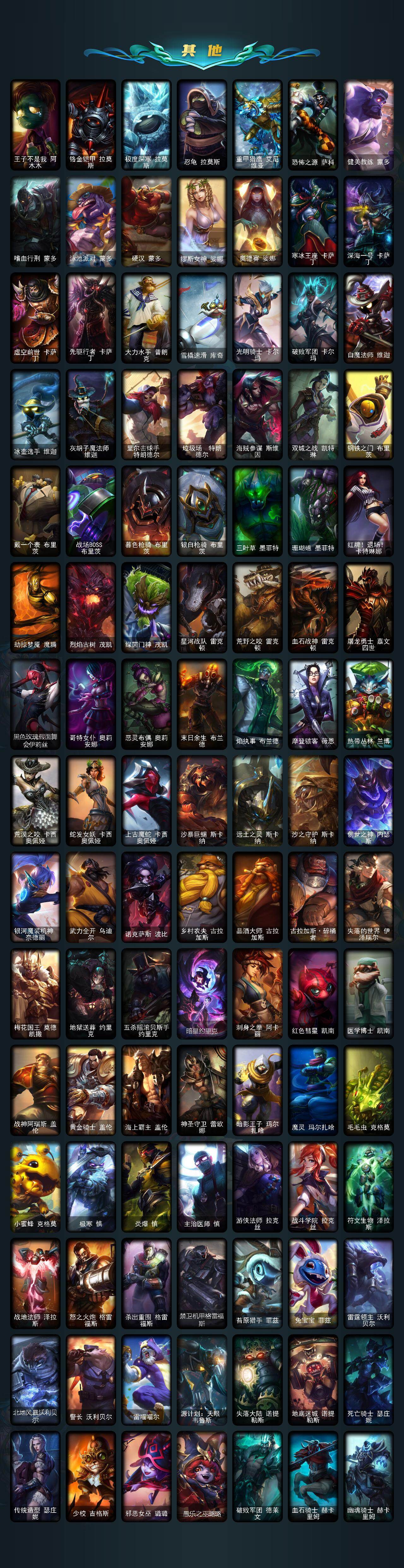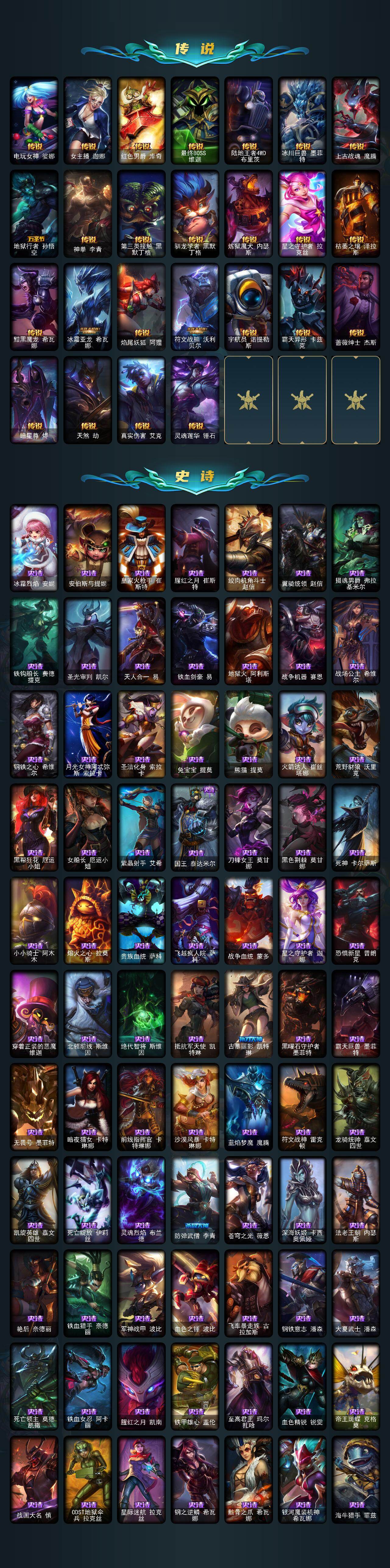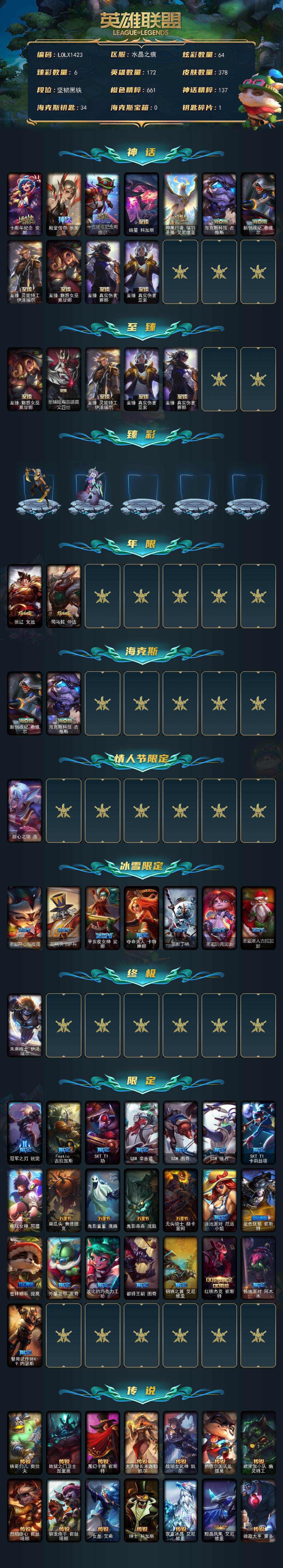 【lolx1423】172英雄/378皮肤/1终极/12神话/32限定/6臻彩/64炫彩/39传说/104史诗/未定级/十周年纪念安妮/殿堂传奇乐芙兰/十五周年纪念希维尔/暗星科加斯/神凰行者瑞羽圣凰艾尼维亚/海克斯科技吉格斯/新创战纪希维尔/至臻真实伤害赛娜/至臻真实伤害亚索/至臻灵能特工伊泽瑞尔/至臻魅惑女巫莫甘娜/至臻暗裔英雄嘉文四世/天龙之子卡莎飞龙乘云/闭月之颜貂蝉炫金莲华/殿堂传奇乐芙兰登神/魔女阿卡丽虚荣/净雪之月莫甘娜冬虹/红莲之刃锐雯/张辽文远/司马懿仲达/甜心之翎洛/圣诞开心鬼提莫/胡桃夹子萨科/平安夜女神娑娜/夺命美人卡特琳娜/雪默丁格/圣诞玩偶波比/圣诞老人古拉加斯/未来战士伊泽瑞尔/冠军之刃锐雯/fnatic古拉加斯/sktt1劫/ssw辛吉德/ssw图奇/ssw锤石/sktt1卡莉丝塔/电玩女神阿狸/南瓜头费德提克/鬼影重重魔腾/鬼影森森茂凯/无头骑士赫卡里姆/泳池派对厄运小姐/蓝色忧郁崔斯特/密林猎手提莫/外星装甲库奇/波比的巧克力工坊/都铎王朝图奇/钢铁之翼艾尼维亚/红桃杰克崔斯特/惊悚派对阿木木/警用试作体k9内瑟斯/铁哥们儿奥拉夫/地狱之门卫士加里奥/魔幻卡牌崔斯特/大天使长米迦勒凯尔/战场女武神凯尔/约德尔国队长提莫/欧米伽小队幽灵特工/烈焰雄心崔丝塔娜/驯龙炮手崔丝塔娜/女皇艾希/绅士科加斯/双重冰晶艾尼维亚/黯晶凤凰艾尼维亚/律政大亨蒙多/电玩女神娑娜/女主播迦娜/红色男爵库奇/最终boss维迦/陆地王者4wd布里茨/冰川巨兽墨菲特/上古战魂魔腾/地狱行者孙悟空/神拳李青/第三类接触黑默丁格/驯龙学者黑默丁格/炼狱魔犬内瑟斯/星之守护者拉克丝/枯萎之壤泽拉斯/黯黑魔龙希瓦娜/冰霜亚龙希瓦娜/焰尾妖狐阿狸/符文战熊沃利贝尔/宇航员诺提勒斯/霸天异形卡兹克/蔷薇绅士杰斯/暗星尊烬/天煞劫/真实伤害艾克/灵魂莲华锤石/冰霜烈焰安妮/安伯斯与提妮/皇家火呛手崔斯特/腥红之月崔斯特/绞肉机角斗士赵信/翼骑统领赵信/摄魂男爵弗拉基米尔/铁钩船长费德提克/圣光审判凯尔/天人合一易/铁血剑豪易/地狱火阿利斯塔/战争机器赛恩/战场公主希维尔/钢铁之心希维尔/月光女神阿忒弥斯索拉卡/圣洁化身索拉卡/兔宝宝提莫/熊猫提莫/火箭达人崔丝塔娜/荒野豺狼沃里克/黑帮狂花厄运小姐/女船长厄运小姐/紫晶射手艾希/国王泰达米尔/刀锋女王莫甘娜/黑色荆棘莫甘娜/死神卡尔萨斯/小小骑士阿木木/熔火之心拉莫斯/贵族血统萨科/飞越疯人院萨科/战争血统蒙多/星之守护者迦娜/恐惧新星普朗克/穿着正装的恶魔维迦/北领前线斯维因/绝代智将斯维因/抵抗军天使凯特琳/古墓丽影凯特琳/黑曜石守护者墨菲特/霸天巨兽墨菲特/无畏号墨菲特/暗夜猫女卡特琳娜/前线指挥官卡特琳娜/沙漠风暴卡特琳娜/蓝焰梦魔魔腾/符文战神雷克顿/龙骑统帅嘉文四世/凯旋英雄嘉文四世/死亡绽放伊莉丝/灵魂烈焰布兰德/防弹武僧李青/苍穹之光薇恩/深海妖姬卡西奥佩娅/法老王朝内瑟斯/艳后奈德丽/铁血猎手奈德丽/军神战甲波比/血色之锤波比/飞车暴走族古拉加斯/钢铁意志潘森/大夏武士潘森/死亡领主莫德凯撒/铁血女忍阿卡丽/腥红之月凯南/铁甲雄心盖伦/至高君王玛尔扎哈/血色精锐锐雯/帝王斑蝶克格莫/战国大名慎/odst地狱伞兵拉克丝/星际迷航拉克丝/钢之逆鳞希瓦娜/骸骨之爪希瓦娜/银河魔装机神希瓦娜/海牛猎手菲兹/银河魔装机神菲兹/铁血猎人雷恩加尔/夜鸦菲奥娜/驯龙女巫璐璐/绞肉机刽子手德莱文/死亡绽放卡兹克/铁血帝皇德莱厄斯/生化骑士德莱厄斯/刀锋女王丽桑卓/腥红之月黛安娜/血羽凤凰奎因/亚特兰蒂斯辛德拉/野火之藤婕拉/驯龙女巫婕拉/邪恶魔人扎克/腥红之月亚索/苍穹之光维克兹/屠龙勇士布隆/黯焰双魂千珏/银河魔装机神千珏/黑帮狂花金克丝/五星大厨塔姆/霓虹杀拳蔚/炼狱魔女蔚/仲裁圣骑亚托克斯/腥红之月锤石/冰雪游神巴德/星空之门内瑟斯/孤胆英豪嘉文四世/死亡骑士内瑟斯/战地之王加里奥/拆弹专家黑默丁格/冰河时代奥拉夫/亮丽女神希维尔/钢铁终结者赛恩/魔导绅士维迦/深潜蛙人古拉加斯/嗜血狂暴沃里克/小红帽安妮/牛扒狂战奥拉夫/五杀摇滚iii遗失的章节奥拉夫/风执事加里奥/龙族卫士加里奥/探戈灵魂崔斯特/深渊巨蟹厄加特/电锯狂人厄加特/社会名流乐芙兰/魔女乐芙兰/弗拉基米尔伯爵/弗拉基米尔侯爵/学生会长弗拉基米尔/波江星神弗拉基米尔/荒野幽灵费德提克/暗影易/星战易/金牛座阿利斯塔/斗牛士阿利斯塔/荒野镖客阿利斯塔/后场堡垒阿利斯塔/部落精神瑞兹/宗师级法师训练师瑞兹/武仙座海格力斯赛恩/原野伐木工赛恩/森林女神索拉卡/蕉泥座人索拉卡/约德尔海贼团崔丝塔娜/冻原猎手沃里克/古神沃里克/荒野巨兽努努和威朗普/脏兮兮努努和威朗普/攻城巨兽努努和威朗普/丧尸努努和威朗普/千纸双子努努和威朗普/特工狂花厄运小姐/勇敢的心艾希/冰球队员贾克斯/光明骑士贾克斯/杀戮天使昔拉莫甘娜/地狱厨房莫甘娜/黎明使者莫甘娜/嘻哈精神基兰/冲浪高手辛吉德/黑色天灾辛吉德/黑暗女王伊芙琳/假面女皇伊芙琳/探戈灵魂伊芙琳/首领图奇/北风冻原图奇/横行霸道图奇/五杀摇滚主唱卡尔萨斯/梦魇科加斯/暴龙科加斯/狂欢阿木木/情绪摇滚阿木木/王子不是我阿木木/铬金铠甲拉莫斯/极度深寒拉莫斯/忍龟拉莫斯/重甲猎鹰艾尼维亚/恐怖之源萨科/健美教练蒙多/嗜血行刑蒙多/泳池派对蒙多/硬