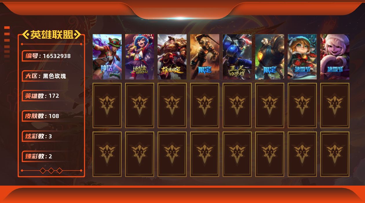 [16532938]【店主推荐捡漏号】未定级段位-172英雄-108皮肤-3炫彩-0终极-3神话-6限定-12传说-22史诗 【神话皮肤】:十周年纪念安妮,十五周年纪念希维尔 【至臻皮肤】:至臻永恒星灵佐伊 【臻彩皮肤】:无畏骑士瑟庄妮赤子初心,星之守护者金克丝黑洞 【年限皮肤】:张辽文远 【冰雪限定】:圣诞精灵崔丝塔娜,冰雪驯鹿波比 【限定皮肤】:胜利机器人布里茨,防暴天使凯尔,警用试作体k9内瑟斯 【传说皮肤】:恶魔男爵瑞兹,烈焰雄心崔丝塔娜,合金巨兽努努和威朗普,绅士科加斯,律政大亨蒙多,冰霜之刃艾瑞莉娅,上古战魂魔腾,地狱行者孙悟空,苍穹之光韦鲁斯,宇航员诺提勒斯,灌篮高手德莱厄斯,星之守护者金克丝 【史诗皮肤】:铁钩船长费德提克,圣光审判凯尔,地狱火阿利斯塔,荒野豺狼沃里克,黑色荆棘莫甘娜,小小骑士阿木木,血石诅咒塔里克,符文战神雷克顿,暗星奥莉安娜,v字仇杀者布兰德,防弹武僧李青,苍穹之光薇恩,四神之力乌迪尔,军神战甲波比,实习护士阿卡丽,兔女郎锐雯,帝王斑蝶克格莫,海牛猎手菲兹,奥术大师吉格斯,最后一只恐龙纳尔,邪恶魔人扎克,冰雪游神巴德 【王者皮肤】:星空之门内瑟斯,霹雳游侠弗拉基米尔 【勇士皮肤】:拆弹专家黑默丁格 【其他皮肤1】:黑暗骑士奥拉夫,皇家守卫赵信,赵云子龙,电锯狂人厄加特,星之守护者cos厄加特,社会名流乐芙兰,弗拉基米尔侯爵,黑潮弗拉基米尔,钢铁审判官凯尔,后场堡垒阿利斯塔,森林女神索拉卡,咖啡甜心索拉卡,破败军团厄运小姐,勇敢的心泰达米尔,梦魇科加斯,王子不是我阿木木,小丑工作坊萨科,泳池派对蒙多,莲花之令艾瑞莉娅,暴风女神迦娜,玉剑传说风仙子,樱花乱舞卡尔玛,绿野仙踪维迦,里尔击球手特朗德尔,荒野治安官凯特琳,铁锈斑斑布里茨,戴一个表布里茨,三叶草墨菲特,猛龙雷克顿,黑色玫瑰假面舞会伊莉丝,黑夜使者李青,灵魂莲华卡西奥佩娅,沙之守护斯卡纳,机神斯卡纳,银河魔装机神奈德丽,诺克萨斯波比,狂热球迷古拉加斯,古拉加斯碎桶者,斯巴达之魂潘森,五杀摇滚吉他手莫德凯撒,梅花国王莫德凯撒,地狱送葬约里克,喵里克,奈落之炎阿卡丽,红色彗星凯南,空手道凯南,战斗学院蕾欧娜,战地法师泽拉斯,kda阿狸,邪恶女巫璐璐,西部魔影德莱厄斯,战斗学院杰斯,巅峰之星杰斯,黑潮黛安娜,丧尸杀手金克丝,源计划疯狂金克丝,正义之呛卢锡安,源代码娜美,永恒之森阿兹尔,泳池派对雷克塞,
