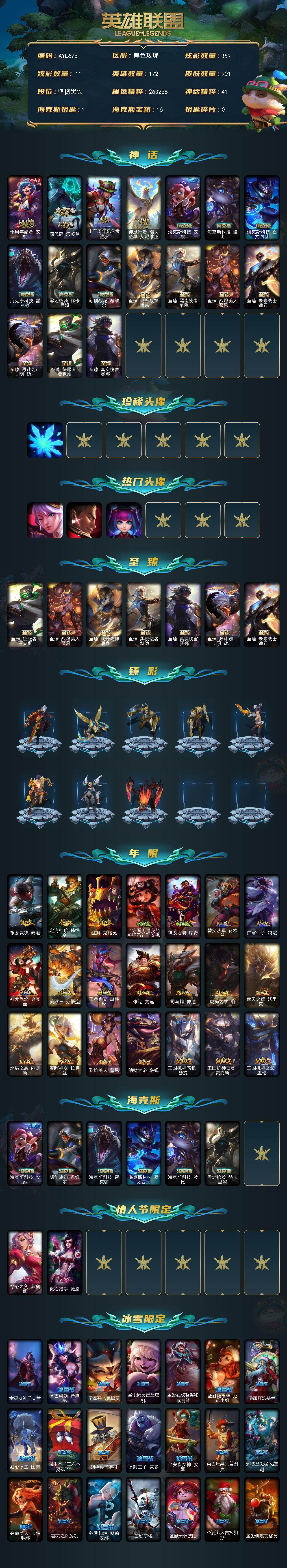[16533367]【店主推荐捡漏号】未定级段位-172英雄-901皮肤-359炫彩-5终极-17神话-159限定-87传说-210史诗 【神话皮肤】:十周年纪念安妮,源代码乐芙兰,十五周年纪念希维尔,神凰行者瑞羽圣凰艾尼维亚,海克斯科技安妮,海克斯科技波比,海克斯科技嘉文四世,海克斯科技雷克顿,零之呛骑赫卡里姆,新创战纪希维尔,至臻征服者贾克斯,至臻真实伤害赛娜,至臻飞升战神潘森,至臻黑夜使者凯隐,至臻烈焰美人薇恩,至臻未来战士锤石,至臻源计划阴劫 【珍稀头像】:雪花头像 【热门头像】:觅心之翼奎因头像,觅心游侠卢锡安头像,银河魔装机神安妮头像 【至臻皮肤】:至臻征服者贾克斯,至臻烈焰美人薇恩,至臻飞升战神潘森,至臻黑夜使者凯隐,至臻真实伤害赛娜,至臻源计划阴劫,至臻未来战士锤石 【臻彩皮肤】:银龙裁决泰隆夜中血影,冠军掠夺者卡兹克凯旋圣装,冠军之血希瓦娜凯旋圣装,冠军之隐劫凯旋圣装,雾雨之刃锐雯,神龙尊者圣龙李青龙腾云起,弹幕天使卡莎炽天使公正,山海绘卷科加斯朱红,红莲之刃锐雯,王国机神白虎贾克斯云霄 【年限皮肤】:银龙裁决泰隆,定海神珍孙悟空,醒狮克格莫,你看见过我的熊猫吗安妮,神龙之翼库奇,替父从军花木兰,广寒仙子嫦娥,神龙烈焰金克丝,美猴王孙悟空,玉净夜叉凯特琳,张辽文远,司马懿仲达,虎痴之拳蔚,南天之怒沃里克,北辰之威内瑟斯,春晖神女拉克丝,烈焰美人薇恩,纳财大帝塔姆,王国机神苍狼瑟提,王国机神白虎贾克斯,王国机神玄武盖伦 【海克斯皮肤】:海克斯科技安妮,新创战纪希维尔,海克斯科技雷克顿,海克斯科技嘉文四世,海克斯科技波比,零之呛骑赫卡里姆 【情人节限定】:穿心之剑菲奥娜,觅心猎手薇恩 【冰雪限定】:幸福女神乐芙兰,冰雪风暴希维尔,圣诞开心鬼提莫,圣诞精灵崔丝塔娜,圣诞狂欢努努和威朗普,圣诞糖果棒厄运小姐,圣诞狂欢基兰,狂心冰王图奇,阿木木“主人不要我了”,胡桃夹子萨科,冰封王子蒙多,平安夜女神娑娜,英勇玩具兵普朗克,邪恶圣诞老人维迦,夺命美人卡特琳娜,喜庆之树茂凯,冬季仙境奥莉安娜,雪默丁格,圣诞玩偶波比,圣诞老人古拉加斯,圣诞驯鹿克格莫,魄罗骑士瑟庄妮,雪球也能爆炸吉格斯,寒冬精灵璐璐,冰雪节辛吉德,冰雪节玛尔扎哈,冰雪节格雷福斯,冰雪女神辛德拉,冰雪兽纳尔 【终极皮肤】:大元素使拉克丝,dj娑娜,灵魂守卫乌迪尔,未来战士伊泽瑞尔,武装战姬厄运小姐 【限定皮肤】:哥特