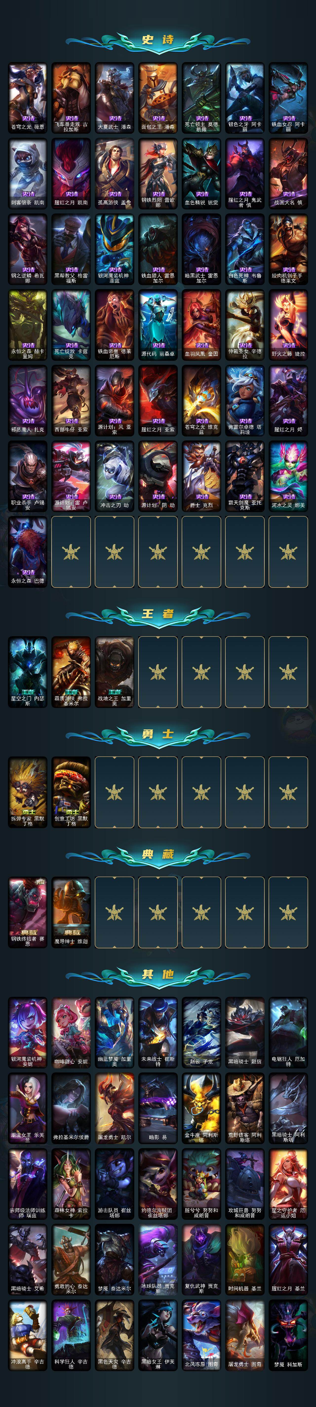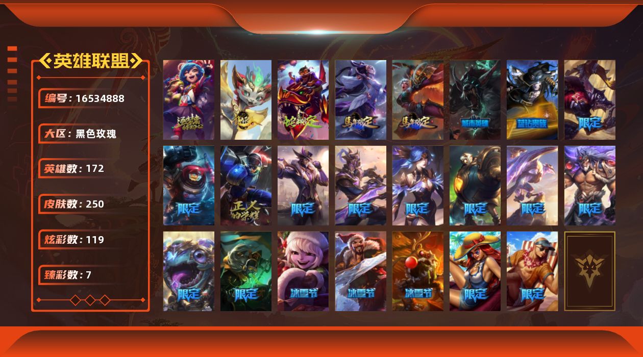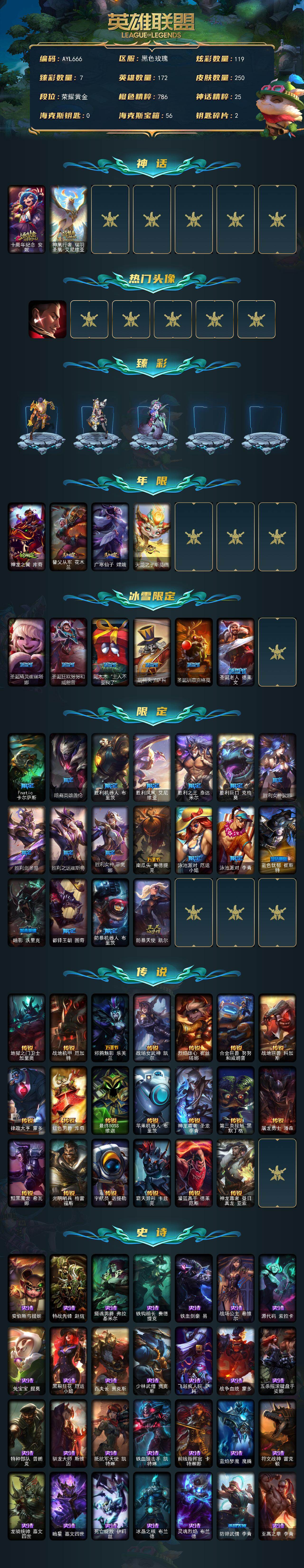 [16534888]【特价出售/店主推荐】 黄金段位-172英雄-250皮肤-119炫彩-0终极-2神话-29限定-20传说-71史诗 【神话皮肤】:十周年纪念安妮,神凰行者瑞羽圣凰艾尼维亚 【热门头像】:觅心游侠卢锡安头像 【臻彩皮肤】:神龙尊者圣龙李青龙腾云起,咖啡甜心金克丝核桃巴菲,幻灵战斗蝠薇恩梦幻强袭,战斗学院盖伦不死鸟,魔女阿卡丽虚荣,净雪之月莫甘娜冬虹,这货不是银狐库奇 【年限皮肤】:神龙之翼库奇,替父从军花木兰,广寒仙子嫦娥,天龙之子斯莫德 【冰雪限定】:圣诞精灵崔丝塔娜,圣诞狂欢努努和威朗普,阿木木“主人不要我了”,胡桃夹子萨科,圣诞驯鹿克格莫,圣诞老人德莱文 【限定皮肤】:fnatic卡尔萨斯,暗裔英雄盖伦,胜利机器人布里茨,胜利凤凰艾尼维亚,胜利之王泰达米尔,胜利巨口克格莫,胜利女神娑娜,胜利剑圣易,胜利之运崔斯特,胜利女神菲奥娜,南瓜头费德提克,泳池派对厄运小姐,泳池派对李青,蓝色忧郁崔斯特,暗影沃里克,都铎王朝图奇,防暴机器人布里茨,防暴天使凯尔 【传说皮肤】:地狱之门卫士加里奥,战地机甲厄加特,邪鸦魅影乐芙兰,战场女武神凯尔,烈焰雄心崔丝塔娜,合金巨兽努努和威朗普,战地巨兽科加斯,律政大亨蒙多,红色男爵库奇,最终boss维迦,苹果机器人布里茨,神龙尊者圣龙李青,第三类接触黑默丁格,屠龙勇士潘森,黯黑魔龙希瓦娜,光明哨兵格雷福斯,宇航员诺提勒斯,霸天异形卡兹克,灌篮高手德莱厄斯,神龙尊者昼日真龙亚索 【史诗皮肤】:安伯斯与提妮,特战先锋赵信,摄魂男爵弗拉基米尔,铁钩船长费德提克,铁血剑豪易,战场公主希维尔,源代码索拉卡,兔宝宝提莫,黑帮狂花厄运小姐,百夫长贾克斯,少林武僧贾克斯,飞越疯人院萨科,战争血统蒙多,五杀摇滚键盘手娑娜,特种部队普朗克,驯龙大师斯维因,抵抗军天使凯特琳,铁血狙击手凯特琳,前线指挥官卡特琳娜,蓝焰梦魔魔腾,符文战神雷克顿,龙骑统帅嘉文四世,暗星嘉文四世,死亡绽放伊莉丝,冰晶之核布兰德,灵魂烈焰布兰德,防弹武僧李青,至高之拳李青,苍穹之光薇恩,飞车暴走族古拉加斯,大夏武士潘森,面包之王潘森,死亡领主莫德凯撒,银色之牙阿卡丽,铁血女忍阿卡丽,刺客信条凯南,腥红之月凯南,孤高游侠盖伦,钢铁烈阳蕾欧娜,血色精锐锐雯,腥红之月鬼武者慎,战国大名慎,钢之逆鳞希瓦娜,黑帮教父格雷福斯,银河魔装机神菲兹,铁血猎人雷恩加尔,暗黑武士雷恩加尔,白色死神韦鲁