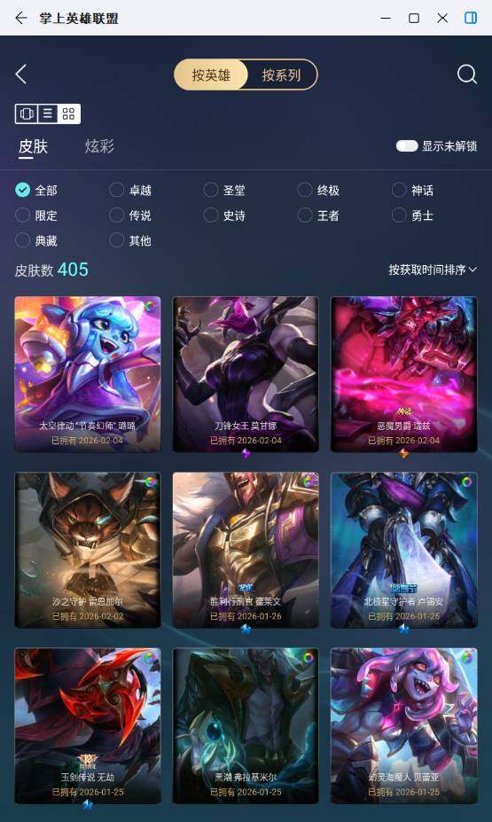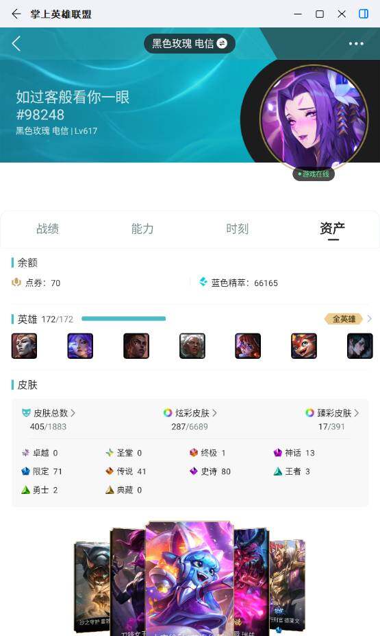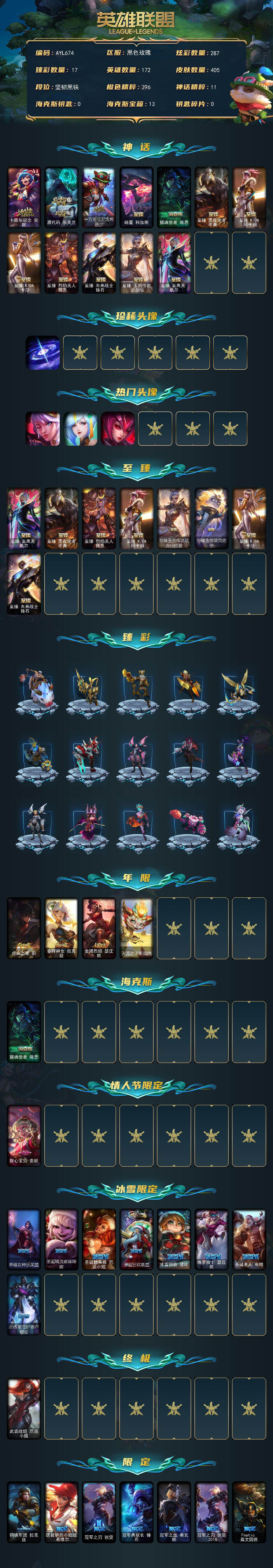 【特价出售/店主推荐】 未定级段位-172英雄-405皮肤-287炫彩-1终极-13神话-71限定-41传说-80史诗 【神话皮肤】:十周年纪念安妮,源代码乐芙兰,十五周年纪念希维尔,暗星科加斯,摄魂使者薇恩,至臻至高天凯尔,至臻黑夜使者李青,至臻kda阿卡丽,至臻kda卡莎,至臻烈焰美人薇恩,至臻