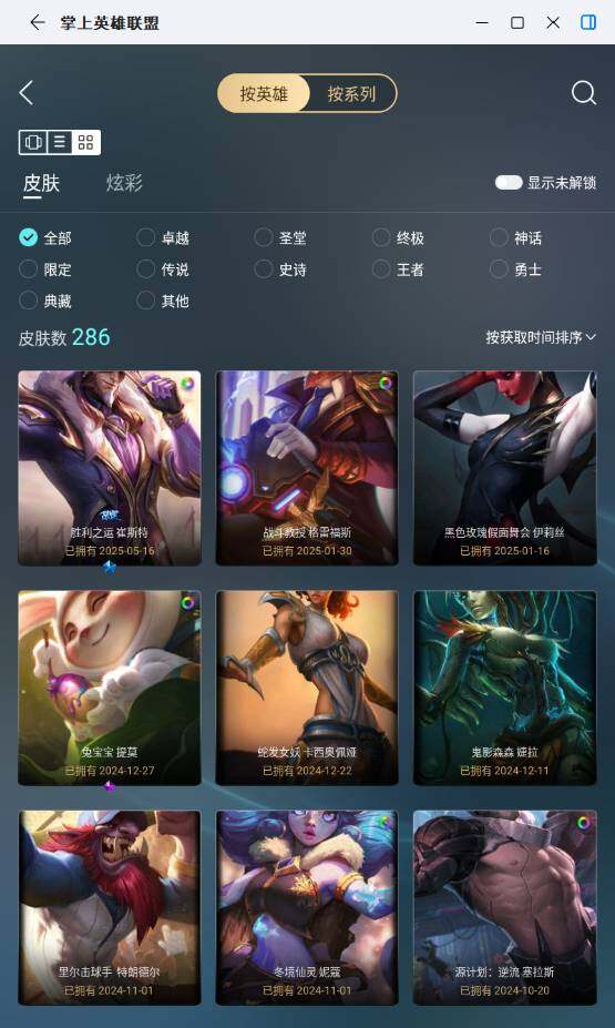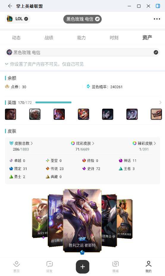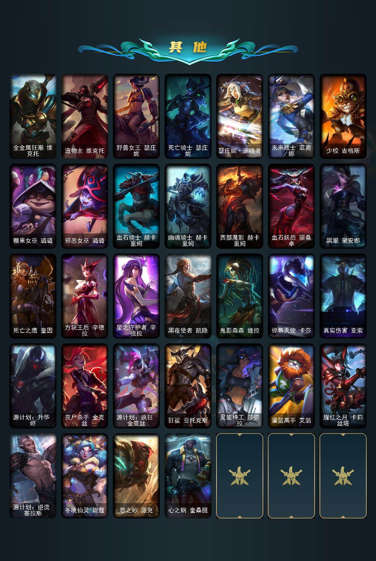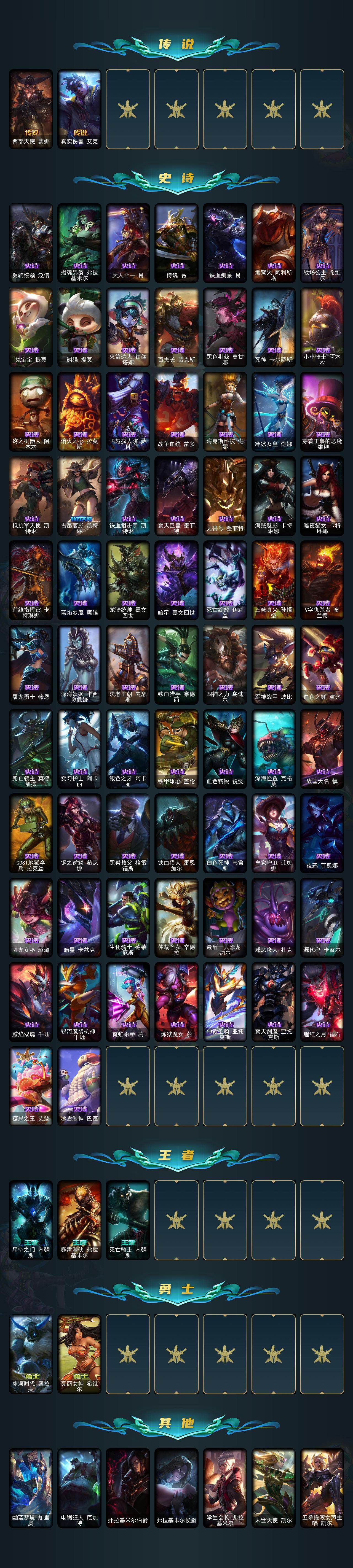 [16536085]未定级段位-170英雄-286皮肤-71炫彩-0终极-11神话-31限定-23传说-72史诗 【神话皮肤】:十周年纪念安妮,源代码乐芙兰,十五周年纪念希维尔,神凰行者瑞羽圣凰艾尼维亚,水晶圣骑塔莉娅,海克斯科技嘉文四世,摄魂使者薇恩,新创战纪希维尔,至臻征服者贾克斯,至臻kda卡莎,至臻灵魂莲华提莫 【至臻皮肤】:至臻灵魂莲华提莫,至臻征服者贾克斯,至臻kda卡莎 【臻彩皮肤】:无畏骑士瑟庄妮赤子初心 【年限皮肤】:天龙之子斯莫德 【海克斯皮肤】:新创战纪希维尔,海克斯科技嘉文四世,摄魂使者薇恩 【情人节限定】:觅心猎手薇恩,觅心女王艾希 【冰雪限定】:圣诞开心鬼提莫,圣诞精灵崔丝塔娜,圣诞狂欢努努和威朗普,胡桃夹子萨科,邪恶圣诞老人维迦,雪装奈德丽,圣诞老人古拉加斯,魄罗骑士瑟庄妮,冰雪节格雷福斯 【限定皮肤】:冠军之血希瓦娜,冠军之矛卡莉丝塔,sktt1贾克斯,sktt1薇恩,f薇恩,dwg奈德丽,黎明使者薇恩,胜利凤凰艾尼维亚,胜利之王泰达米尔,胜利之运崔斯特,鬼影重重魔腾,泳池派对普朗克,暗影沃里克,野兽猎人泰达米尔,波比的巧克力工坊,勇者奈德丽,都铎王朝图奇,防暴士兵辛吉德,防暴天使凯尔 【传说皮肤】:铁哥们儿奥拉夫,血石领主弗拉基米尔,大天使长米迦勒凯尔,战场女武神凯尔,提莫约德尔人的一大步,合金巨兽努努和威朗普,女皇艾希,双重冰晶艾尼维亚,未来战士凯特琳,战斗学院凯特琳,太空律动猫猫布里和里茨,源计划净化薇恩,光明哨兵薇恩,第三类接触黑默丁格,炼狱魔犬内瑟斯,战斗学院伊泽瑞尔,黎明使者锐雯,黯黑魔龙希瓦娜,焰尾妖狐阿狸,宇航员诺提勒斯,泳池派对吉格斯,西部天使赛娜,真实伤害艾克 【史诗皮肤】:翼骑统领赵信,摄魂男爵弗拉基米尔,天人合一易,侍魂易,铁血剑豪易,地狱火阿利斯塔,战场公主希维尔,兔宝宝提莫,熊猫提莫,火箭达人崔丝塔娜,百夫长贾克斯,黑色荆棘莫甘娜,死神卡尔萨斯,小小骑士阿木木,殇之机器人阿木木,熔火之心拉莫斯,飞越疯人院萨科,战争血统蒙多,海克斯科技迦娜,寒冰女皇迦娜,穿着正装的恶魔维迦,抵抗军天使凯特琳,古墓丽影凯特琳,铁血狙击手凯特琳,霸天巨兽墨菲特,无畏号墨菲特,海贼魅影卡特琳娜,暗夜猫女卡特琳娜,前线指挥官卡特琳娜,蓝焰梦魔魔腾,龙骑统帅嘉文四世,暗星嘉文四世,死亡绽放伊莉丝,三昧真火孙悟空,v字仇杀者布兰德,屠龙勇士薇恩,深海