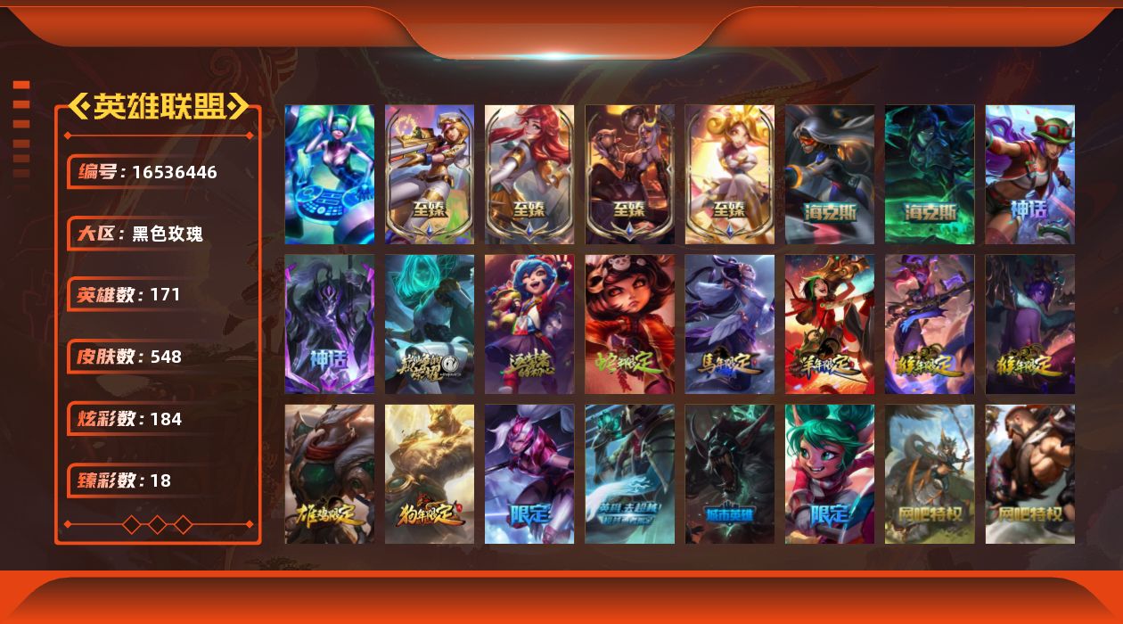 [16536446]未定级段位-171英雄-548皮肤-184炫彩-1终极-10神话-112限定-40传说-144史诗 【神话皮肤】:十周年纪念安妮,源代码乐芙兰,十五周年纪念希维尔,灰烬征服者潘森,摄魂使者薇恩,新创战纪希维尔,至臻电玩女神凯特琳,至臻烈焰美人薇恩,至臻星之守护者妮蔻,至臻战斗学院拉克丝 【热门头像】:觅心游侠卢锡安头像 【至臻皮肤】:至臻电玩女神凯特琳,至臻烈焰美人薇恩,至臻战斗学院拉克丝,至臻星之守护者妮蔻 【臻彩皮肤】:神龙烈焰金克丝珍珠龙息,天龙之子卡莎飞龙乘云,无畏骑士瑟庄妮赤子初心,冠军之箭艾希凯旋圣装,张辽文远炫金将军,玉净夜叉凯特琳炫金神机,赵云子龙炫金将军,墨之影武者亚索金墨耀影,闭月之颜貂蝉炫金莲华,冠军之矛卡莉丝塔凯旋圣装,偶像歌手阿狸极地雪莲,星之守护者娑娜未来之光,咖啡甜心格温酒醉樱桃,魔女阿卡丽虚荣,净雪之月莫甘娜冬虹,墨之影武者永恩灵墨刻影,幽梦玫瑰伊莉丝浪漫花蕾,心之钢伊泽瑞尔天纵才华 【年限皮肤】:你看见过我的熊猫吗安妮,广寒仙子嫦娥,神龙烈焰金克丝,紫金罗刹莫甘娜,玉净夜叉凯特琳,司马懿仲达,北辰之威内瑟斯 【海克斯皮肤】:新创战纪希维尔,摄魂使者薇恩 【情人节限定】:甜心之翎洛,觅心之翼奎因 【冰雪限定】:幸福女神乐芙兰,圣诞开心鬼提莫,圣诞精灵崔丝塔娜,圣诞狂欢努努和威朗普,圣诞糖果棒厄运小姐,圣诞狂欢基兰,阿木木“主人不要我了”,胡桃夹子萨科,平安夜女神娑娜,英勇玩具兵普朗克,夺命美人卡特琳娜,喜庆之树茂凯,雪默丁格,雪装奈德丽,圣诞玩偶波比,冰雪驯鹿波比,圣诞老人古拉加斯,圣诞驯鹿克格莫,魄罗骑士瑟庄妮,圣诞老人德莱文,圣诞老人布隆,圣诞捣蛋鬼金克丝,冰雪节辛吉德,冰雪节玛尔扎哈,冰雪节格雷福斯 【终极皮肤】:dj娑娜 【限定皮肤】:奥斯曼大帝泰达米尔,卧虎藏龙贾克斯,舞会公主安妮,地底世界崔斯特,冠军之刃锐雯,冠军典狱长锤石,冠军之矛卡莉丝塔,冠军之刃锐雯2016,冠军之箭艾希,fnatic古拉加斯,fnatic迦娜,fnatic卡尔萨斯,fnatic库奇,暗杀星奥莉安娜,暗杀星蒙多,暗杀星努努和威朗普,暗杀星慎,暗杀星伊泽瑞尔,sktt1贾克斯,sktt1劫,sktt1婕拉,sktt1李青,sktt1薇恩,ssw辛吉德,ssw图奇,ssw泰隆,ssw雷恩加尔,ssw锤石,sktt1阿利斯塔,sktt1阿兹尔,sktt1