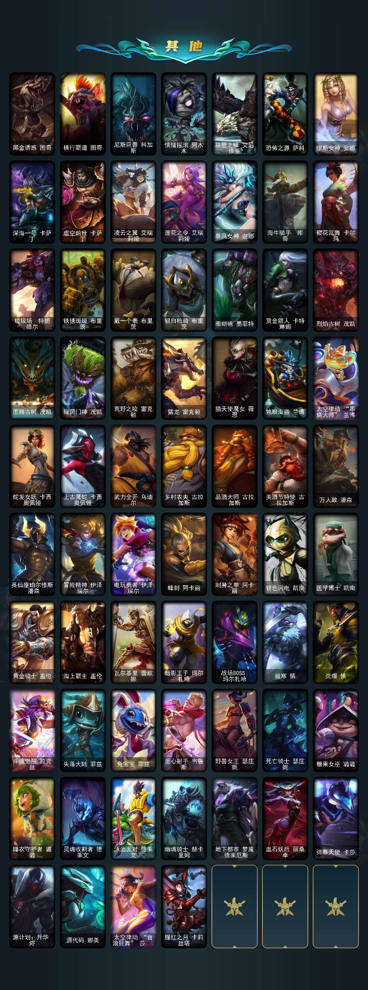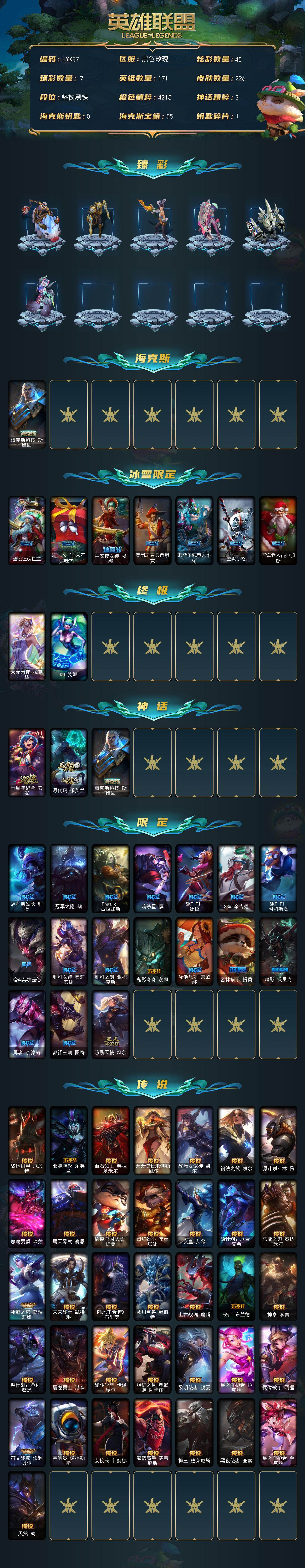 [16536607]【特价出售/店主推荐】未定级段位-171英雄-226皮肤-45炫彩-2终极-3神话-24限定-36传说-56史诗 【臻彩皮肤】:无畏骑士瑟庄妮赤子初心,冠军之隐劫凯旋圣装,雾雨之刃锐雯,幻灵战斗猫金克丝梦幻强袭,霸天巨兽雪崩墨菲特,魔女阿卡丽虚荣,净雪之月莫甘娜冬虹 【海克斯皮肤】:海克斯科技斯维因 【冰雪限定】:圣诞狂欢基兰,阿木木“主人不要我了”,平安夜女神娑娜,英勇玩具兵普朗克,邪恶圣诞老人维迦,雪默丁格,圣诞老人古拉加斯 【终极皮肤】:大元素使拉克丝,dj娑娜 【神话皮肤】:十周年纪念安妮,源代码乐芙兰,海克斯科技斯维因 【限定皮肤】:冠军典狱长锤石,冠军之隐劫,fnatic古拉加斯,暗杀星慎,sktt1婕拉,ssw辛吉德,sktt1阿利斯塔,暗裔英雄盖伦,胜利女神奥莉安娜,胜利之剑亚托克斯,鬼影森森茂凯,泳池派对蕾欧娜,密林猎手提莫,暗影沃里克,勇者奈德丽,都铎王朝图奇,防暴天使凯尔 【传说皮肤】:战地机甲厄加特,邪鸦魅影乐芙兰,血石领主弗拉基米尔,大天使长米迦勒凯尔,战场女武神凯尔,钢铁之翼凯尔,源计划林易,恶魔男爵瑞兹,霸天零式赛恩,约德尔国队长提莫,烈焰雄心崔丝塔娜,女皇艾希,源计划联合艾希,恶魔之刃泰达米尔,冰霜之刃艾瑞莉娅,未来战士凯特琳,陆地王者4wd布里茨,冰川巨兽墨菲特,上古战魂魔腾,丧尸布兰德,神拳李青,源计划净化薇恩,屠龙勇士潘森,战斗学院伊泽瑞尔,腥红之月鬼武姬阿卡丽,黎明使者锐雯,星之守护者拉克丝,偶像歌手阿狸,符文战熊沃利贝尔,宇航员诺提勒斯,女校长菲奥娜,灌篮高手德莱厄斯,神王德莱厄斯,黑夜使者亚索,星之守护者金克丝,天煞劫 【史诗皮肤】:皇家火呛手崔斯特,圣光审判凯尔,钢铁之心希维尔,月光女神阿忒弥斯索拉卡,圣洁化身索拉卡,狼外婆沃里克,炼金狂士辛吉德,熔火之心拉莫斯,贵族血统萨科,战争血统蒙多,掠星魔刃卡萨丁,铁血狙击手凯特琳,霸天巨兽墨菲特,源计划雄心卡特琳娜,蓝焰梦魔魔腾,符文战神雷克顿,死亡绽放伊莉丝,腥红之月伊莉丝,斗战胜佛孙悟空,v字仇杀者布兰德,至高之拳李青,深海妖姬卡西奥佩娅,法老王朝内瑟斯,四神之力乌迪尔,飞车暴走族古拉加斯,面包之王潘森,铁血女忍阿卡丽,刺客信条凯南,腥红之月凯南,源计划山蕾欧娜,至高君王玛尔扎哈,腥红之月泰隆,血色精锐锐雯,帝王斑蝶克格莫,战国大名慎,钢之逆鳞希瓦娜,银河魔装机神希瓦娜,