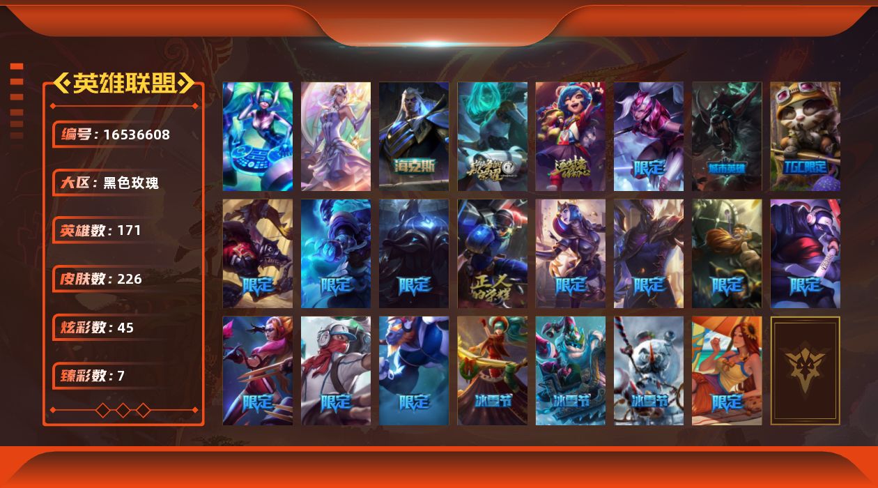 [16536608]【特价出售/店主推荐】未定级段位-171英雄-226皮肤-45炫彩-2终极-3神话-24限定-36传说-56史诗 【臻彩皮肤】:无畏骑士瑟庄妮赤子初心,冠军之隐劫凯旋圣装,雾雨之刃锐雯,幻灵战斗猫金克丝梦幻强袭,霸天巨兽雪崩墨菲特,魔女阿卡丽虚荣,净雪之月莫甘娜冬虹 【海克斯皮肤】:海克斯科技斯维因 【冰雪限定】:圣诞狂欢基兰,阿木木“主人不要我了”,平安夜女神娑娜,英勇玩具兵普朗克,邪恶圣诞老人维迦,雪默丁格,圣诞老人古拉加斯 【终极皮肤】:大元素使拉克丝,dj娑娜 【神话皮肤】:十周年纪念安妮,源代码乐芙兰,海克斯科技斯维因 【限定皮肤】:冠军典狱长锤石,冠军之隐劫,fnatic古拉加斯,暗杀星慎,sktt1婕拉,ssw辛吉德,sktt1阿利斯塔,暗裔英雄盖伦,胜利女神奥莉安娜,胜利之剑亚托克斯,鬼影森森茂凯,泳池派对蕾欧娜,密林猎手提莫,暗影沃里克,勇者奈德丽,都铎王朝图奇,防暴天使凯尔 【传说皮肤】:战地机甲厄加特,邪鸦魅影乐芙兰,血石领主弗拉基米尔,大天使长米迦勒凯尔,战场女武神凯尔,钢铁之翼凯尔,源计划林易,恶魔男爵瑞兹,霸天零式赛恩,约德尔国队长提莫,烈焰雄心崔丝塔娜,女皇艾希,源计划联合艾希,恶魔之刃泰达米尔,冰霜之刃艾瑞莉娅,未来战士凯特琳,陆地王者4wd布里茨,冰川巨兽墨菲特,上古战魂魔腾,丧尸布兰德,神拳李青,源计划净化薇恩,屠龙勇士潘森,战斗学院伊泽瑞尔,腥红之月鬼武姬阿卡丽,黎明使者锐雯,星之守护者拉克丝,偶像歌手阿狸,符文战熊沃利贝尔,宇航员诺提勒斯,女校长菲奥娜,灌篮高手德莱厄斯,神王德莱厄斯,黑夜使者亚索,星之守护者金克丝,天煞劫 【史诗皮肤】:皇家火呛手崔斯特,圣光审判凯尔,钢铁之心希维尔,月光女神阿忒弥斯索拉卡,圣洁化身索拉卡,狼外婆沃里克,炼金狂士辛吉德,熔火之心拉莫斯,贵族血统萨科,战争血统蒙多,掠星魔刃卡萨丁,铁血狙击手凯特琳,霸天巨兽墨菲特,源计划雄心卡特琳娜,蓝焰梦魔魔腾,符文战神雷克顿,死亡绽放伊莉丝,腥红之月伊莉丝,斗战胜佛孙悟空,v字仇杀者布兰德,至高之拳李青,深海妖姬卡西奥佩娅,法老王朝内瑟斯,四神之力乌迪尔,飞车暴走族古拉加斯,面包之王潘森,铁血女忍阿卡丽,刺客信条凯南,腥红之月凯南,源计划山蕾欧娜,至高君王玛尔扎哈,腥红之月泰隆,血色精锐锐雯,帝王斑蝶克格莫,战国大名慎,钢之逆鳞希瓦娜,银河魔装机神希瓦娜,