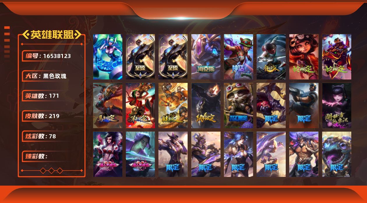 [16538123]可二次【特价出售/店主推荐】未定级段位-171英雄-219皮肤-78炫彩-1终极-5神话-40限定-31传说-44史诗 【至臻皮肤】:至臻未来战士锤石,至臻未来战士锤石2022 【年限皮肤】:银龙裁决泰隆,你看见过我的熊猫吗安妮,碧玉之牙卡西奥佩娅,神龙之翼库奇,替父从军花木兰,神龙烈焰金克丝,美猴王孙悟空,王国机神青龙德莱文 【海克斯皮肤】:海克斯科技克格莫 【情人节限定】:觅心猎手薇恩,幽梦玫瑰泰隆 【冰雪限定】:幸福女神乐芙兰,邪恶圣诞老人维迦,夺命美人卡特琳娜,雪默丁格,圣诞玩偶波比,魄罗骑士瑟庄妮,冰雪节辛吉德 【终极皮肤】:dj娑娜 【神话皮肤】:十五周年纪念希维尔,神凰行者瑞羽圣凰艾尼维亚,海克斯科技克格莫,至臻未来战士锤石,至臻未来战士锤石2022 【限定皮肤】:哥特萝莉安妮,暗杀星蒙多,暗杀星慎,sktt1贾克斯,ssw辛吉德,sktt1卡莉丝塔,sktt1瑞兹,sktt1烬,ssg霞,f墨菲特,胜利凤凰艾尼维亚,胜利之王泰达米尔,胜利巨口克格莫,胜利女神娑娜,胜利剑圣易,胜利之运崔斯特,胜利女神菲奥娜,大魔法锅布里茨,鬼影重重魔腾,无头骑士赫卡里姆,密林猎手提莫,都铎王朝图奇,防暴士兵格雷福斯 【传说皮肤】:地狱之门卫士加里奥,大天使长米迦勒凯尔,战场女武神凯尔,源计划林易,提莫约德尔人的一大步,合金巨兽努努和威朗普,女皇艾希,源计划联合艾希,双重冰晶艾尼维亚,黯晶凤凰艾尼维亚,冰霜之刃艾瑞莉娅,神拳李青,源计划净化薇恩,炼狱魔犬内瑟斯,战斗学院伊泽瑞尔,死亡骑士盖伦,月蚀骑士蕾欧娜,黎明使者锐雯,暗星女王拉克丝,枯萎之壤泽拉斯,光明哨兵格雷福斯,苍穹之光韦鲁斯,女校长菲奥娜,泳池派对吉格斯,霸天异形卡兹克,神王德莱厄斯,奥德赛凯隐,黑夜使者亚索,神龙尊者昼日真龙亚索,暗星尊烬,真实伤害艾克 【史诗皮肤】:安伯斯与提妮,绞肉机角斗士赵信,月光女神阿忒弥斯索拉卡,狼外婆沃里克,紫晶射手艾希,国王泰达米尔,刀锋女王莫甘娜,熔火之心拉莫斯,战争血统蒙多,穿着正装的恶魔维迦,抵抗军天使凯特琳,霸天巨兽墨菲特,凯旋英雄嘉文四世,腥红之月伊莉丝,苍穹之光薇恩,艳后奈德丽,铁血猎手奈德丽,飞车暴走族古拉加斯,钢铁意志潘森,面包之王潘森,铁甲雄心盖伦,兔女郎锐雯,奥术光辉拉克丝,暗黑武士雷恩加尔,夜鸦菲奥娜,源计划火菲奥娜,奥术大师吉格斯,死亡绽放卡兹