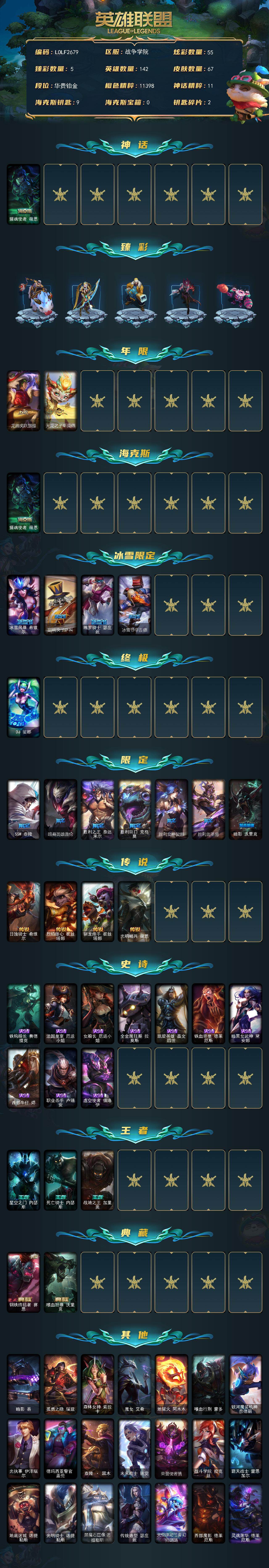 【lolf2679】142英雄/67皮肤/1终极/1神话/13限定/5臻彩/55炫彩/4传说/10史诗/铂金/摄魂使者薇恩/无畏骑士瑟庄妮赤子初心/冠军之箭艾希凯旋圣装/冰雪节格雷福斯炫金/西部魔影卢锡安贝利尔之怠/可爱可爱粉红红布里茨/龙腾虎跃瑟提/天龙之子斯莫德/冰雪风暴希维尔/胡桃夹子萨科/魄罗骑士瑟庄妮/冰雪节辛吉德/dj娑娜/ssw泰隆/暗裔英雄盖伦/胜利之王泰达米尔/胜利巨口克格莫/胜利女神娑娜/胜利剑圣易/暗影沃里克/日蚀骑士希维尔/烈焰雄心崔丝塔娜/驯龙炮手崔丝塔娜/光明哨兵薇恩/铁钩船长费德提克/法国皇室厄运小姐/女船长厄运小姐/全金属狂潮拉莫斯/凯旋英雄嘉文四世/铁血帝皇德莱厄斯/暗黑女武神黛安娜/西部牛仔烬/职业杀手卢锡安/虚空使者俄洛伊/星空之门内瑟斯/死亡骑士内瑟斯/战地之王加里奥/钢铁终结者赛恩/嗜血狂暴沃里克/暗影易/孤勇之隐瑞兹/森林女神索拉卡/魔女艾希/地狱火阿木木/嗜血行刑蒙多/银河魔装机神奈德丽/光执事伊泽瑞尔/德玛西亚警官盖伦/泰隆黑木/未来战士锐雯/荣誉使者慎/战斗学院拉克丝/霸天战士雷恩加尔/地底迷城诺提勒斯/光明骑士诺提勒斯/禁魔石巨像诺提勒斯/传统造型瑟庄妮/太空律动节奏幻师璐璐/西部魔影德莱厄斯/灵魂莲华德莱厄斯/战斗学院杰斯/巅峰之星杰斯/死亡之鹰奎因/星之守护者奎因/弹幕天使卡莎/kdaallout卡莎/奥德赛亚索/山海绘卷烬/奥德赛亚托克斯/太空律动音浪狂舞莎弥拉/水瓶星神俄洛伊/星之守护者尼菈